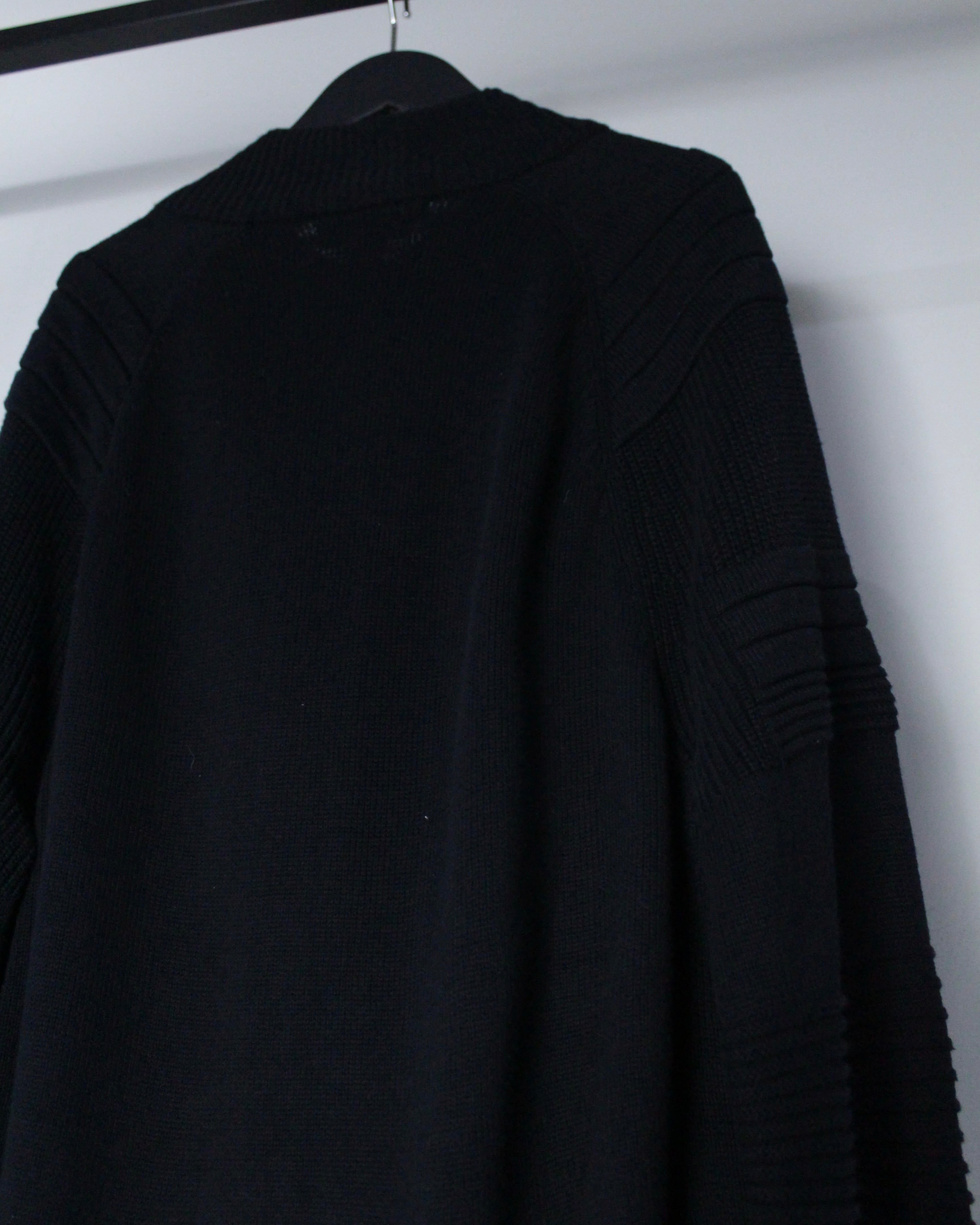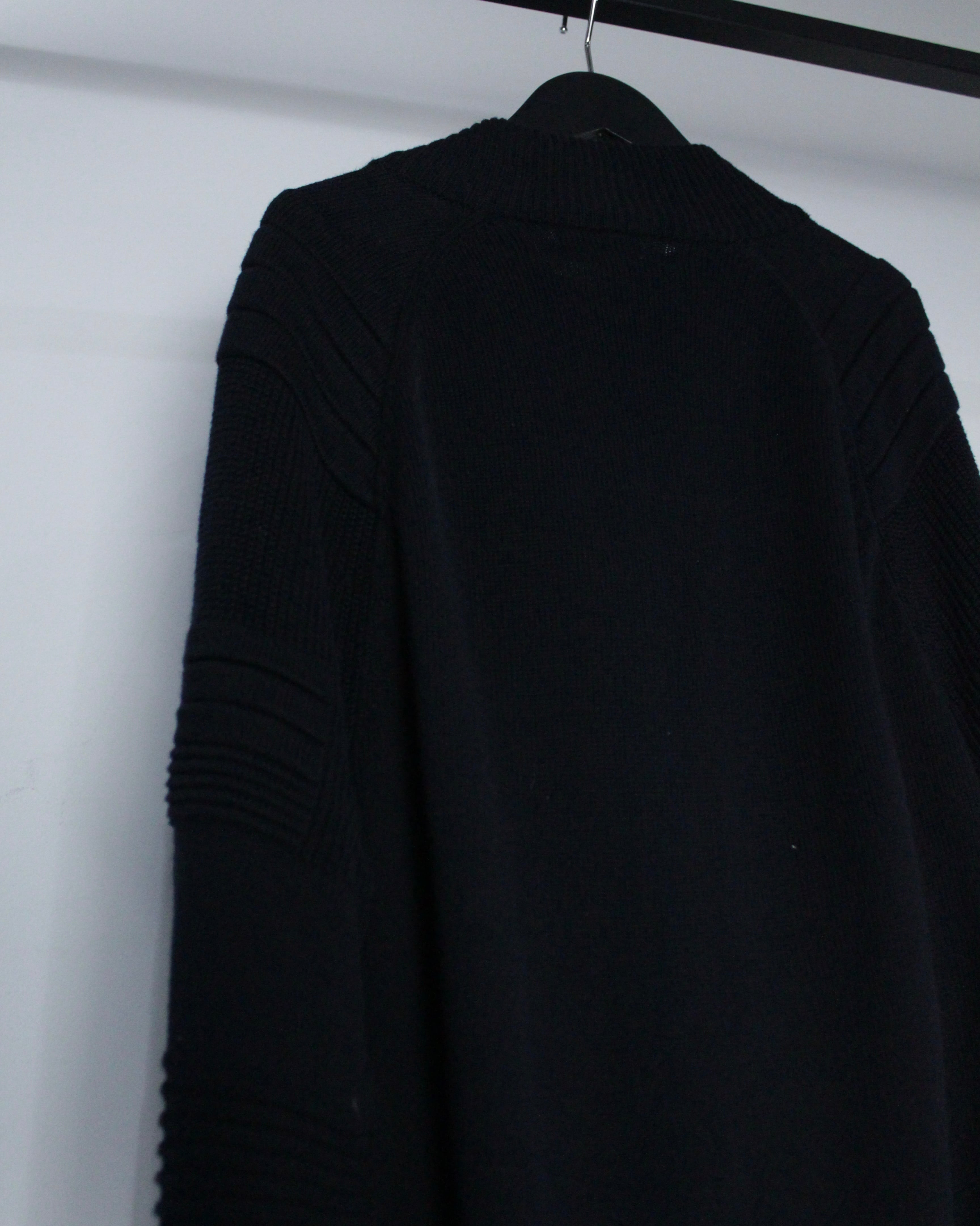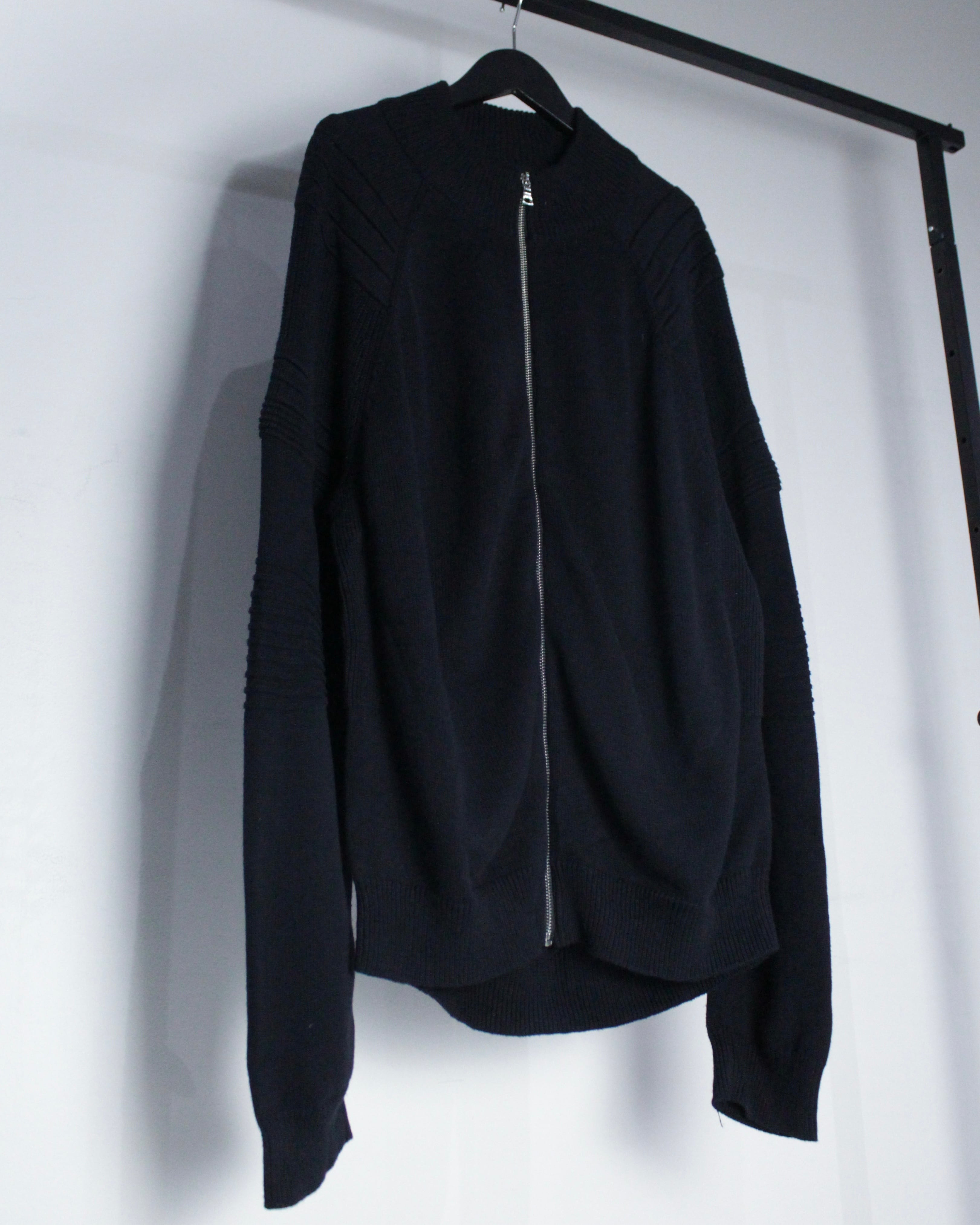 立体的な編地構成が目を引く、オールブラックのジップニットジャケット。