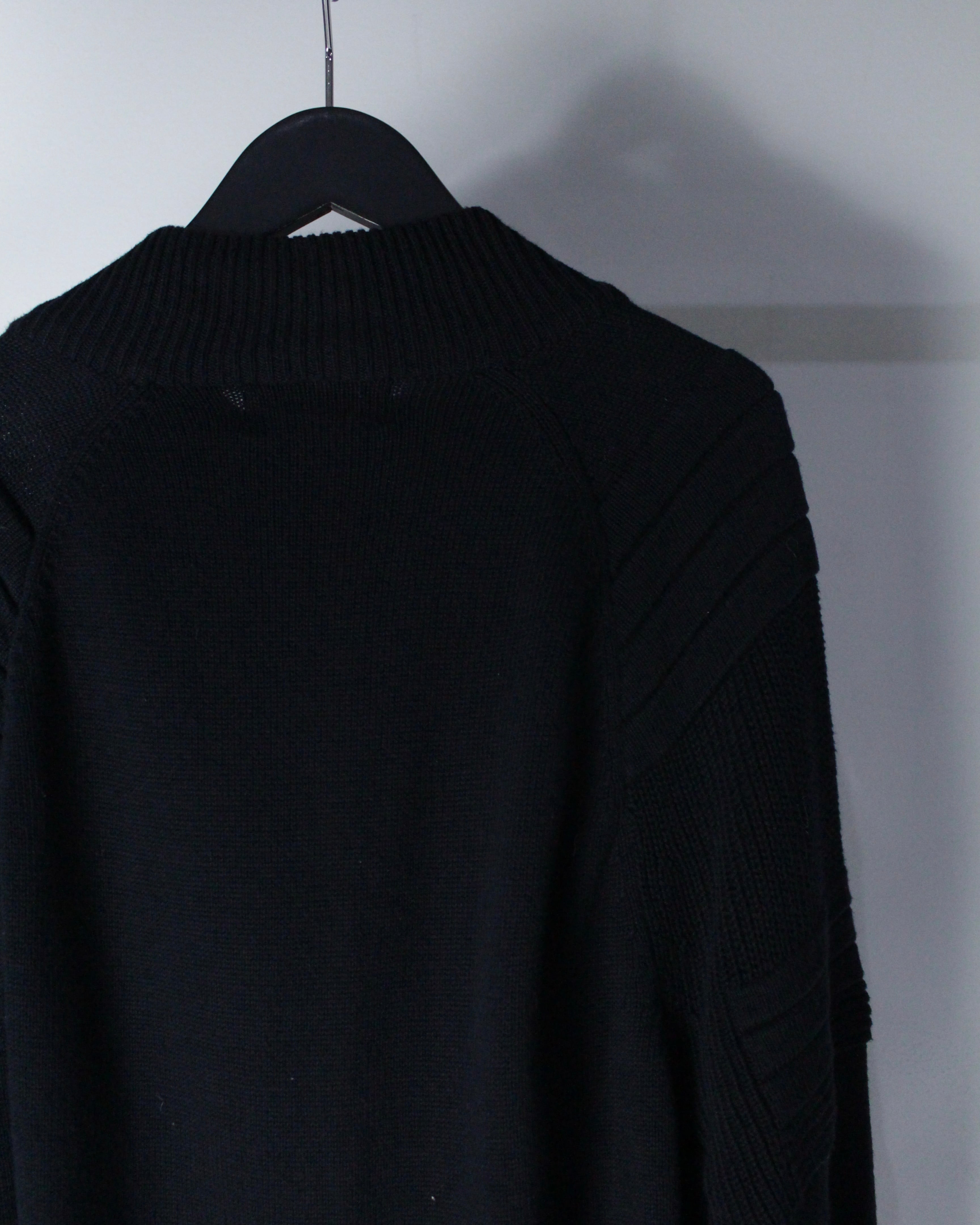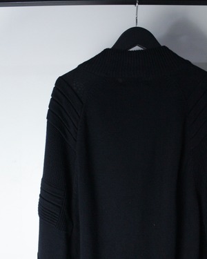 ショルダーからアームにかけて段差をつけたリブと編みの切り替えが印象的で、光の当たり方によって陰影が生まれる奥行きある表情に仕上がっています。