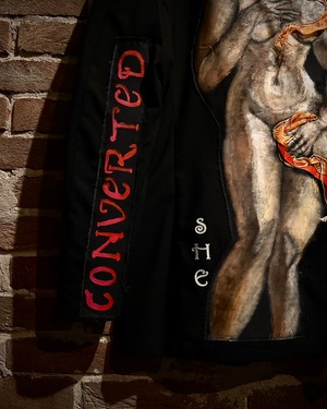 そして背面にはボッティチェリのビーナスの誕生モチーフのハンドペイントと、立体的なリボン装飾を重ねた圧巻のデザイン。“CONVERTED”と“SHE”のメッセージがアームと裾に描かれ、カスタムモノの中でも非常にクオリティの高い仕上がりとなっています。