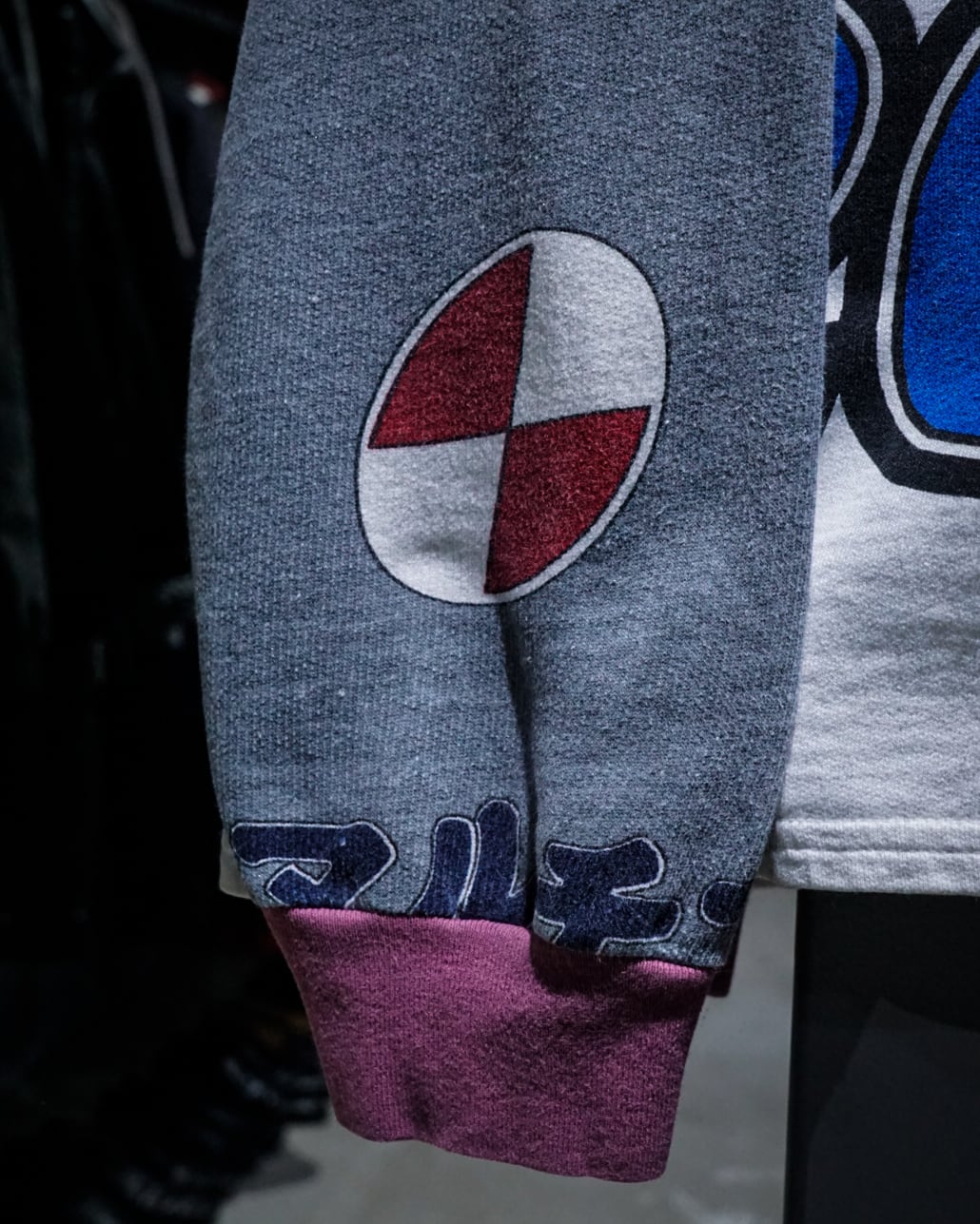 グレー×ホワイトをベースに、ブルーやバーガンディのラインを効かせた多層的な配色。デザインのノリや雰囲気からはレイヴカルチャーに通ずるものを感じられますね。