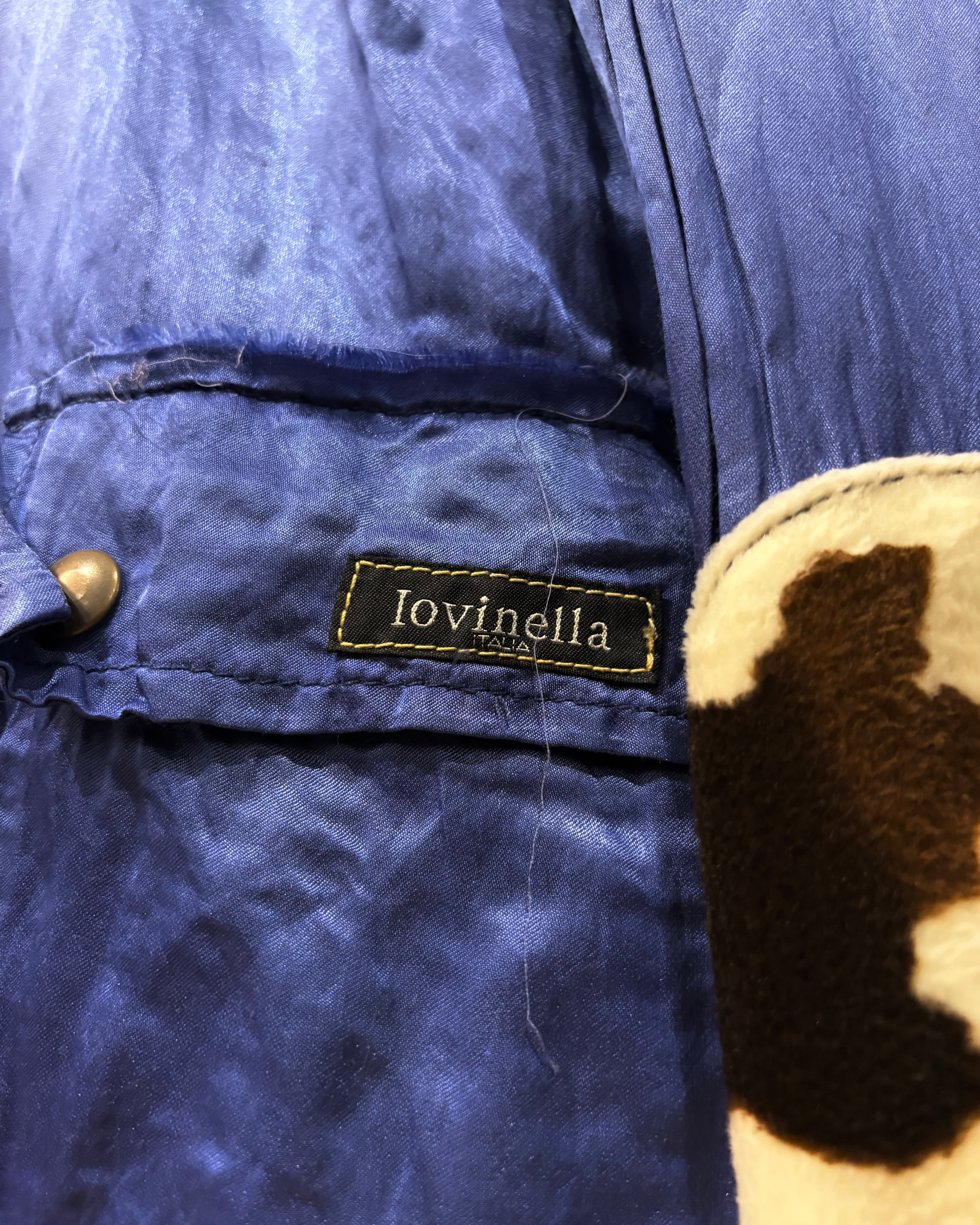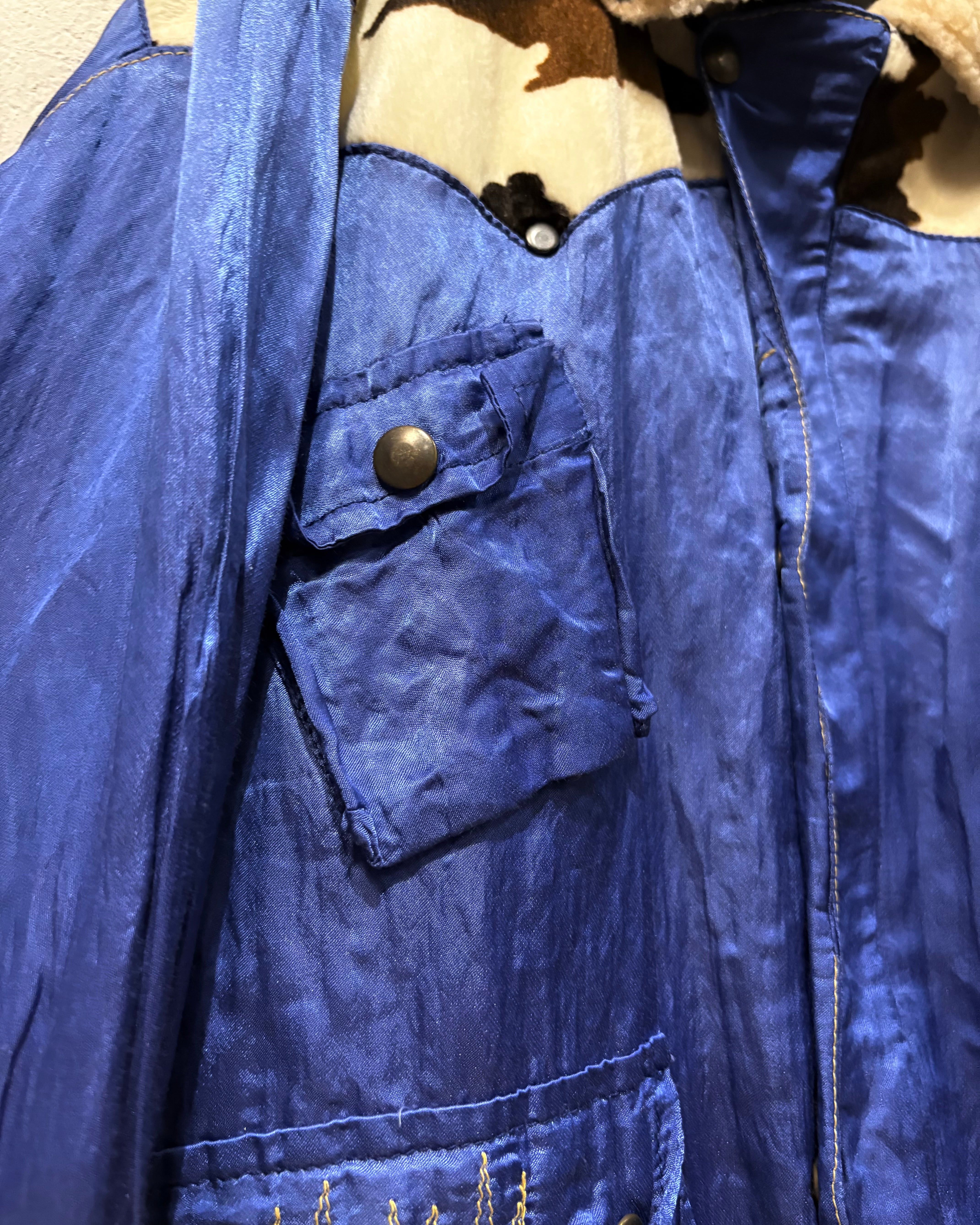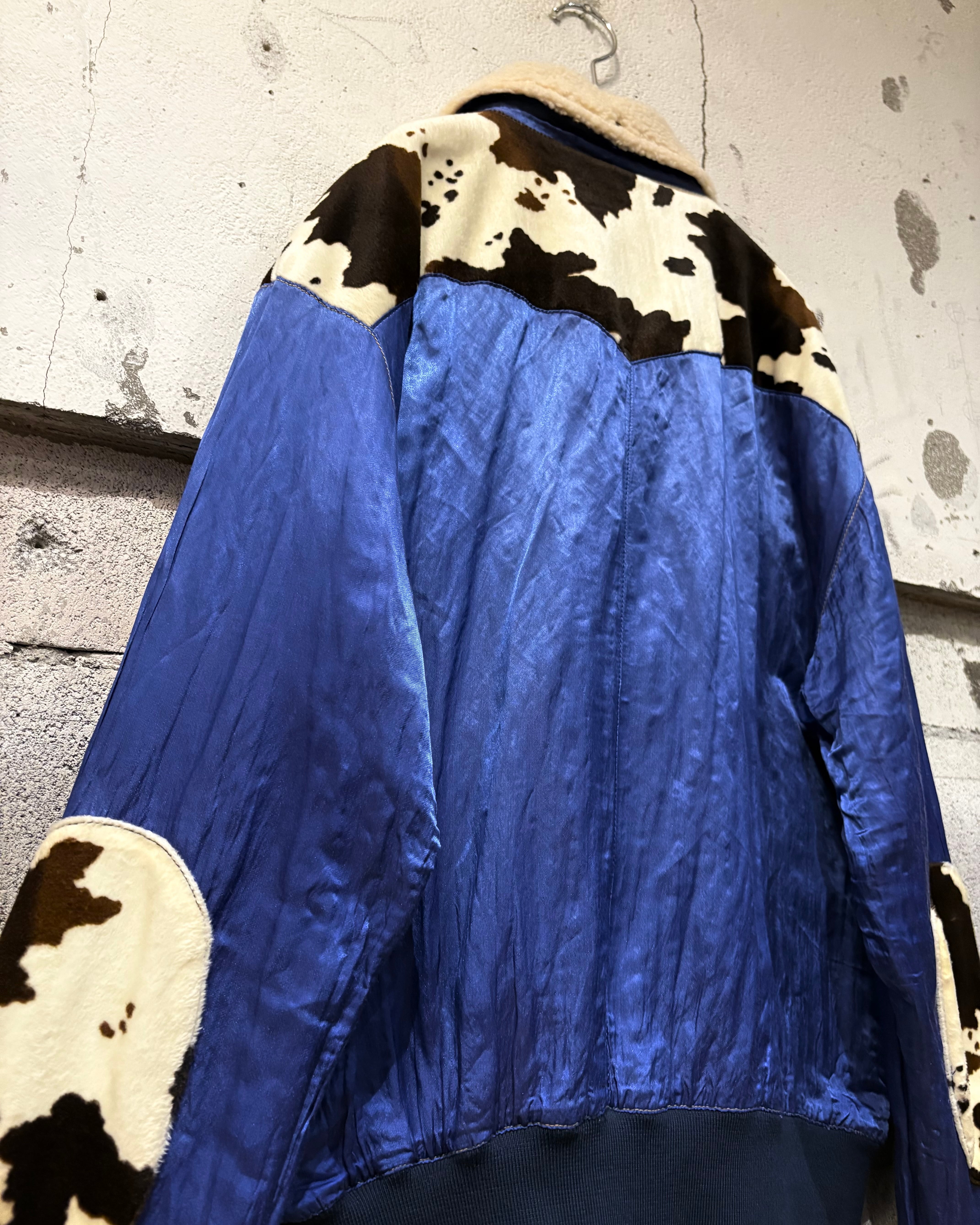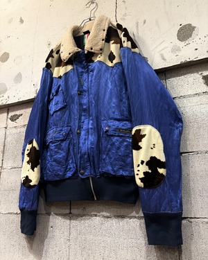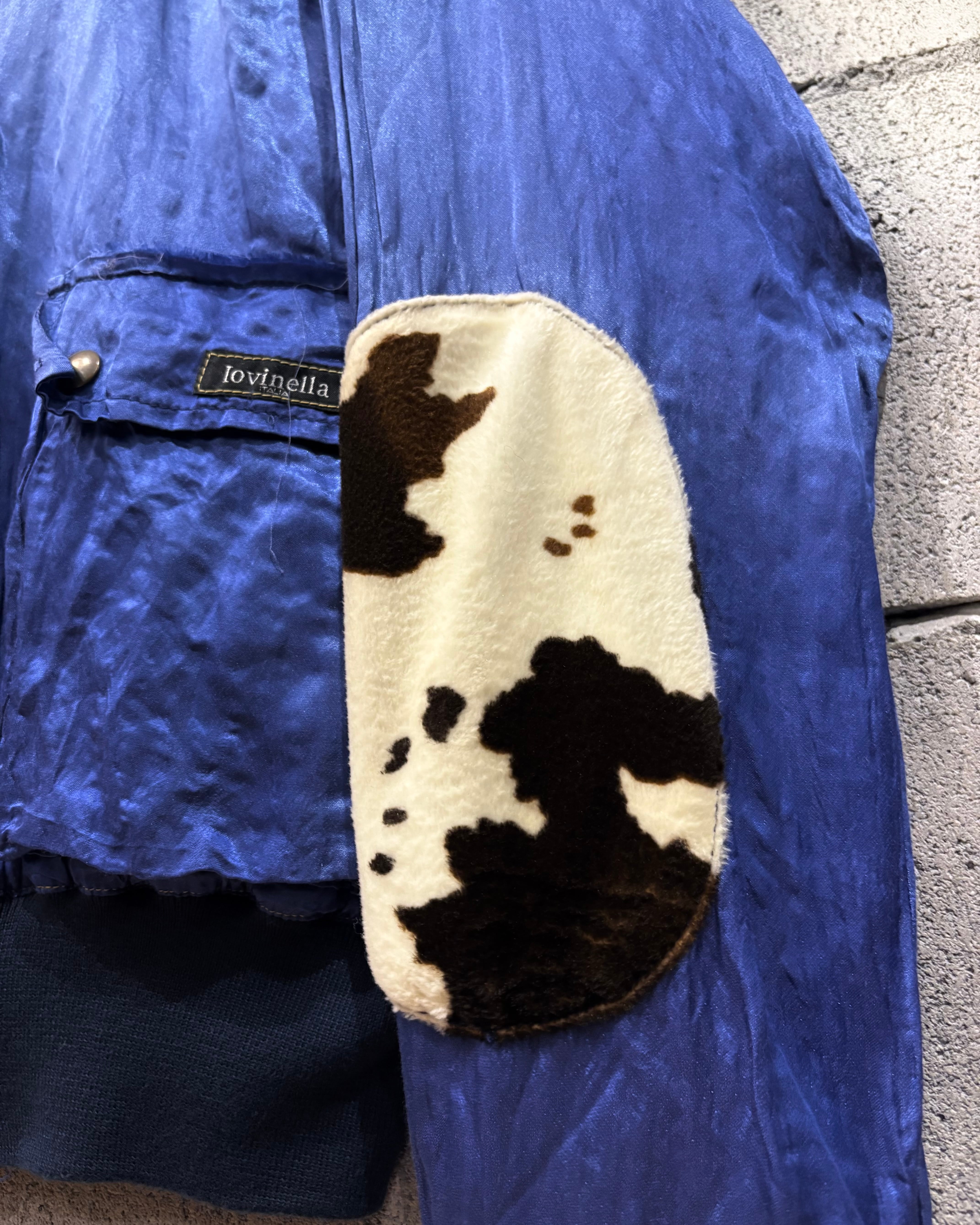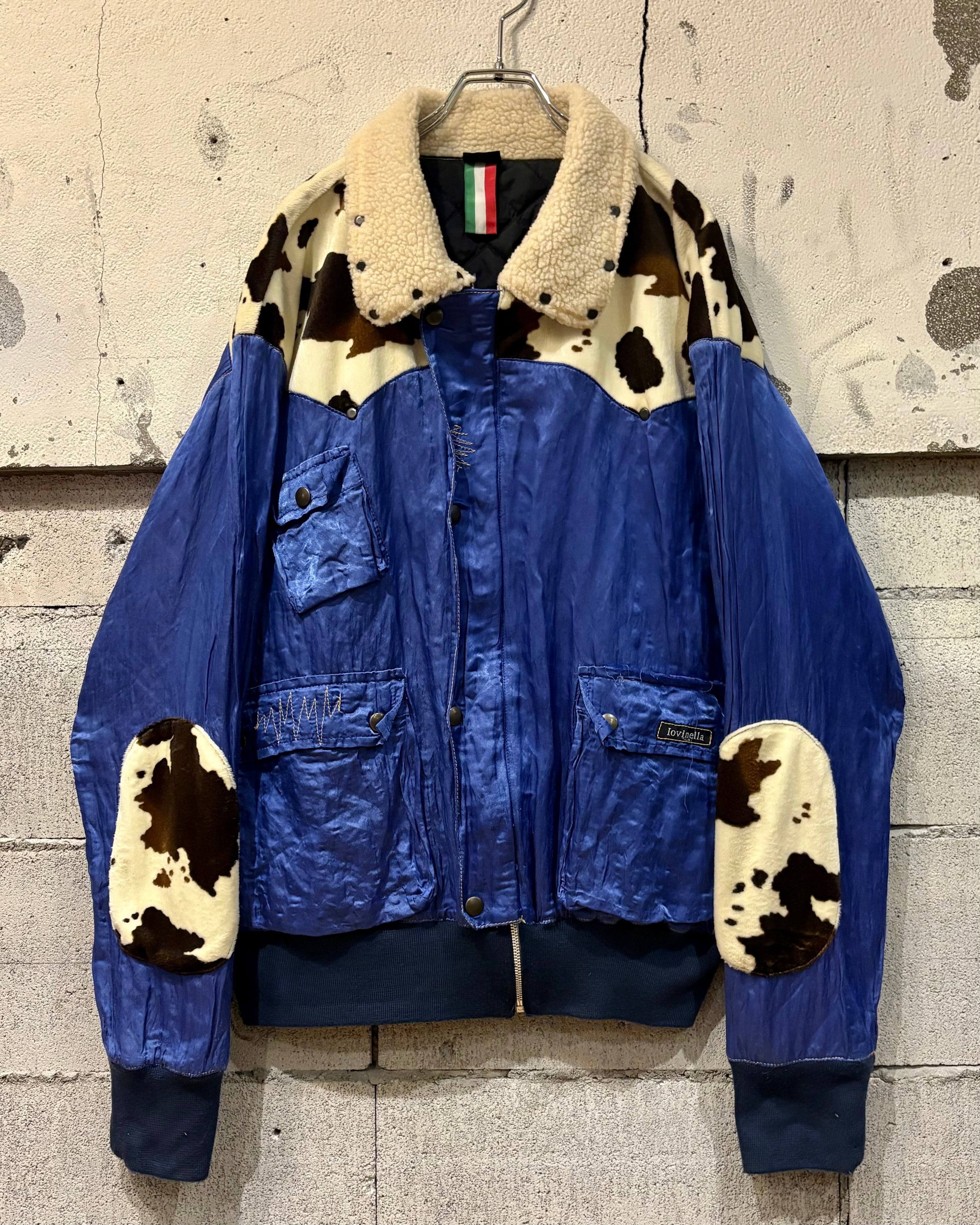 鮮烈なロイヤルブルーのナイロンボディにカウパターンのテキスタイルを大胆に切り替えた、唯一無二のデザインが魅力的なイタリーメイドのナイロンジャケット。