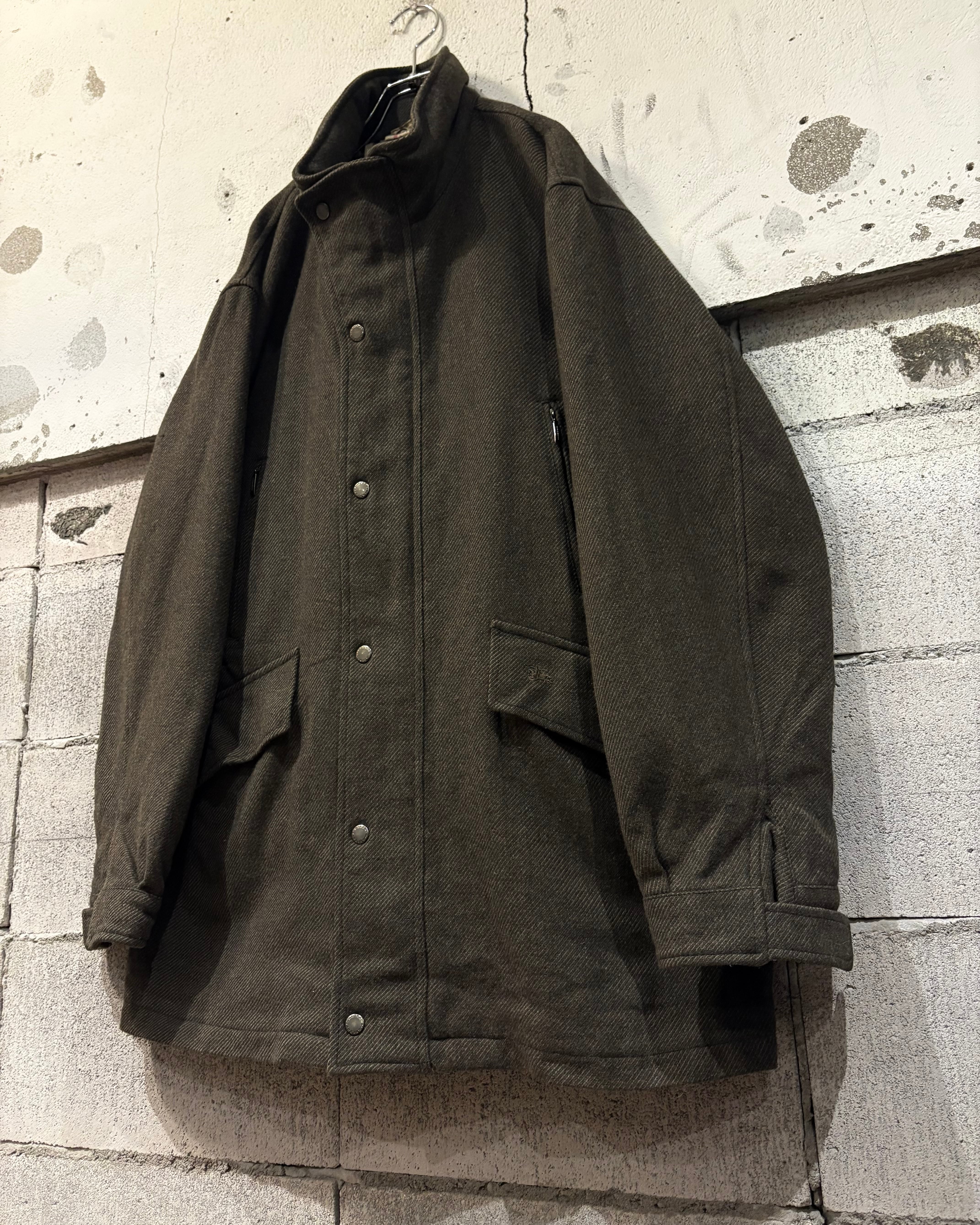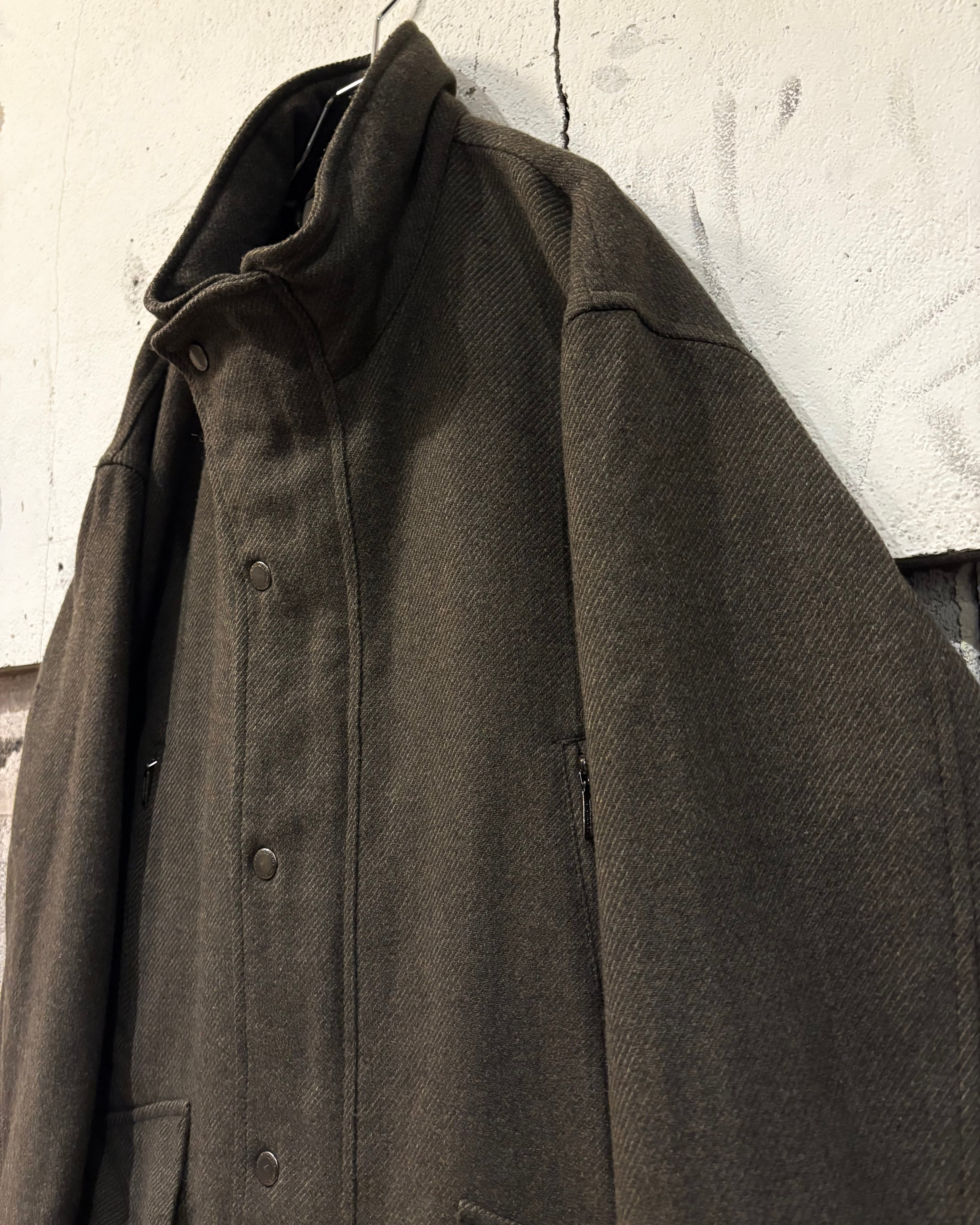ボディには肉厚なコットンを採用し、杢調のグレーが上品かつ落ち着いた印象を演出。ネック部分はスタンド仕様となっており、ボタンを上まで留めれば防風性を高めつつ、より洗練された雰囲気を漂わせます。