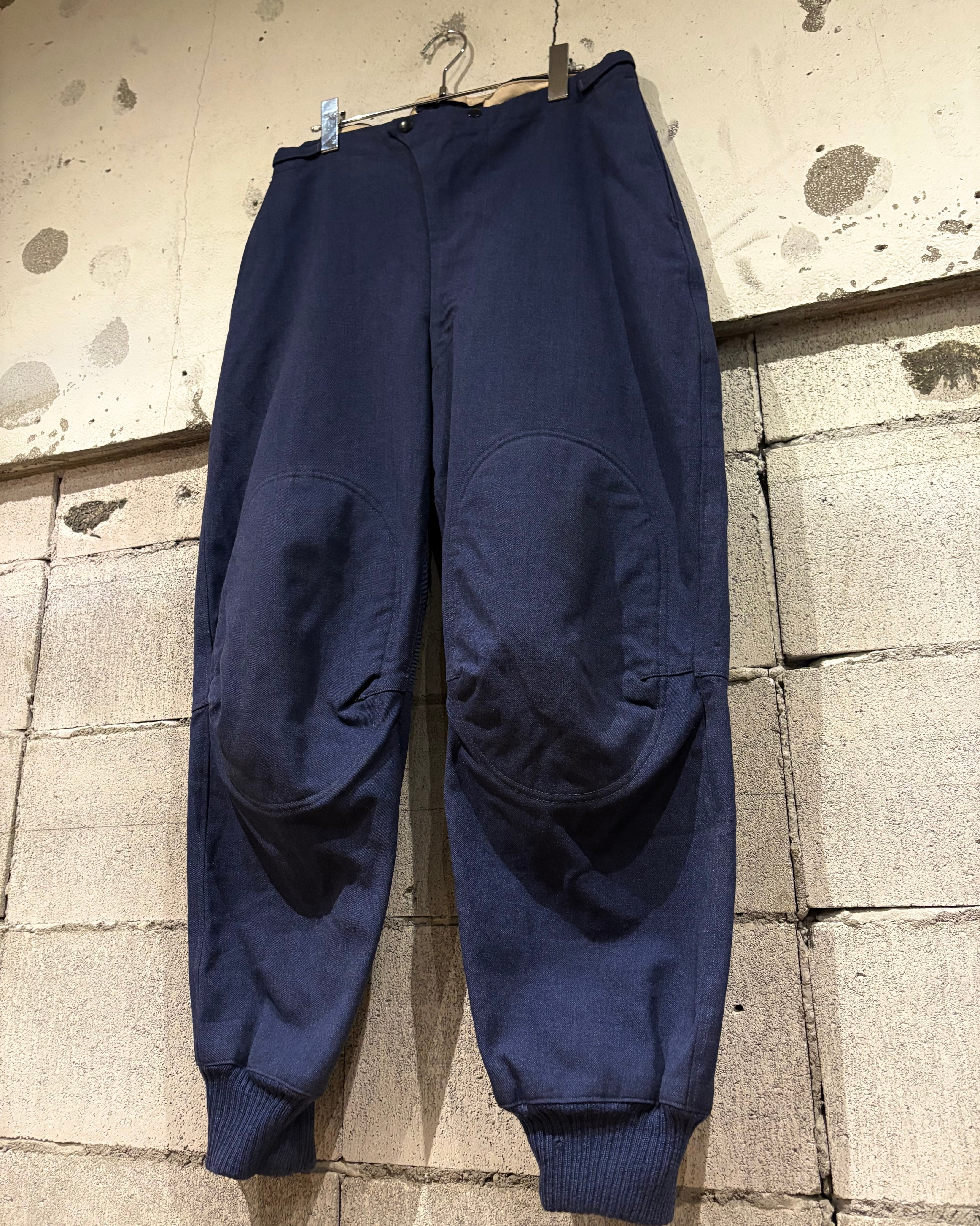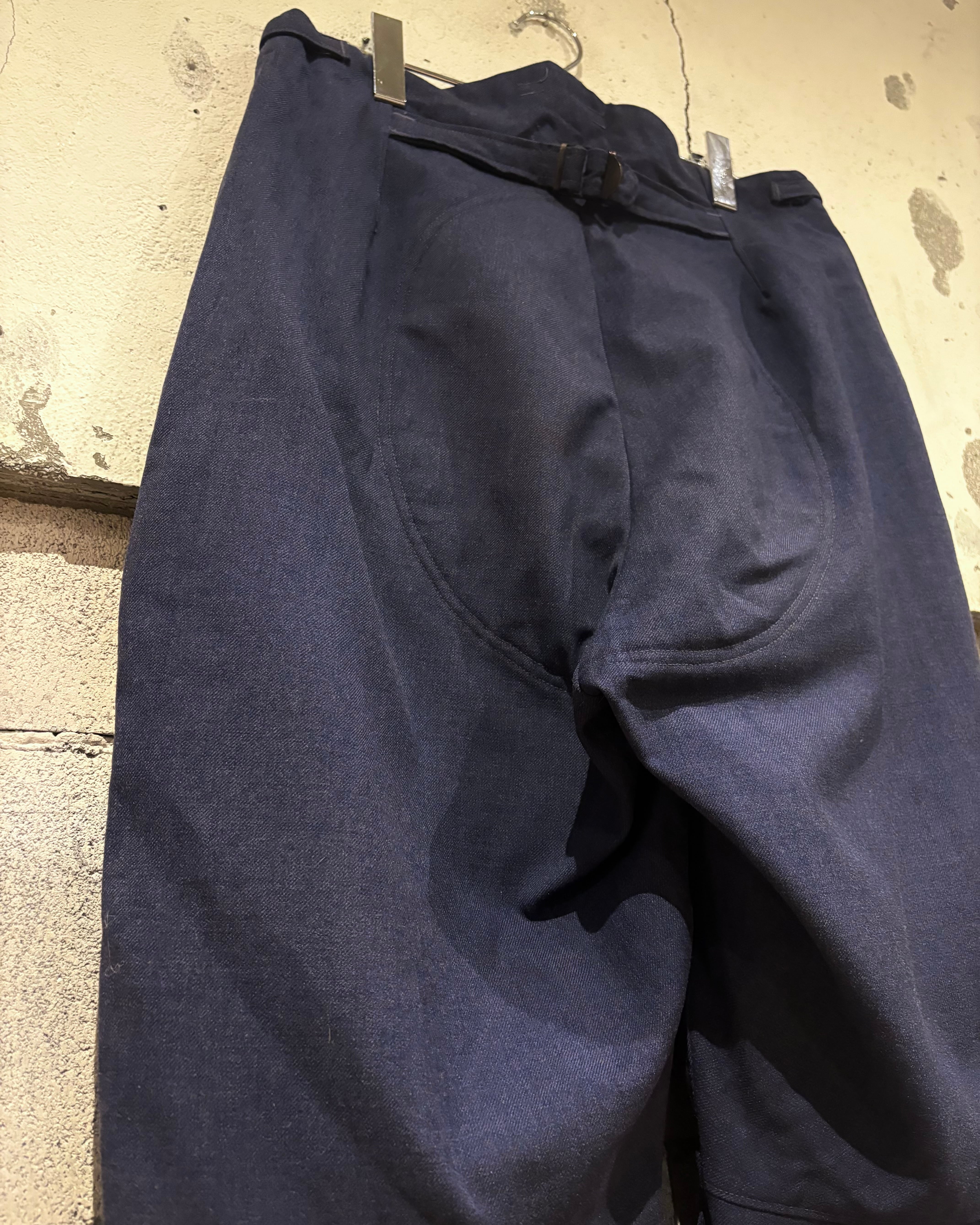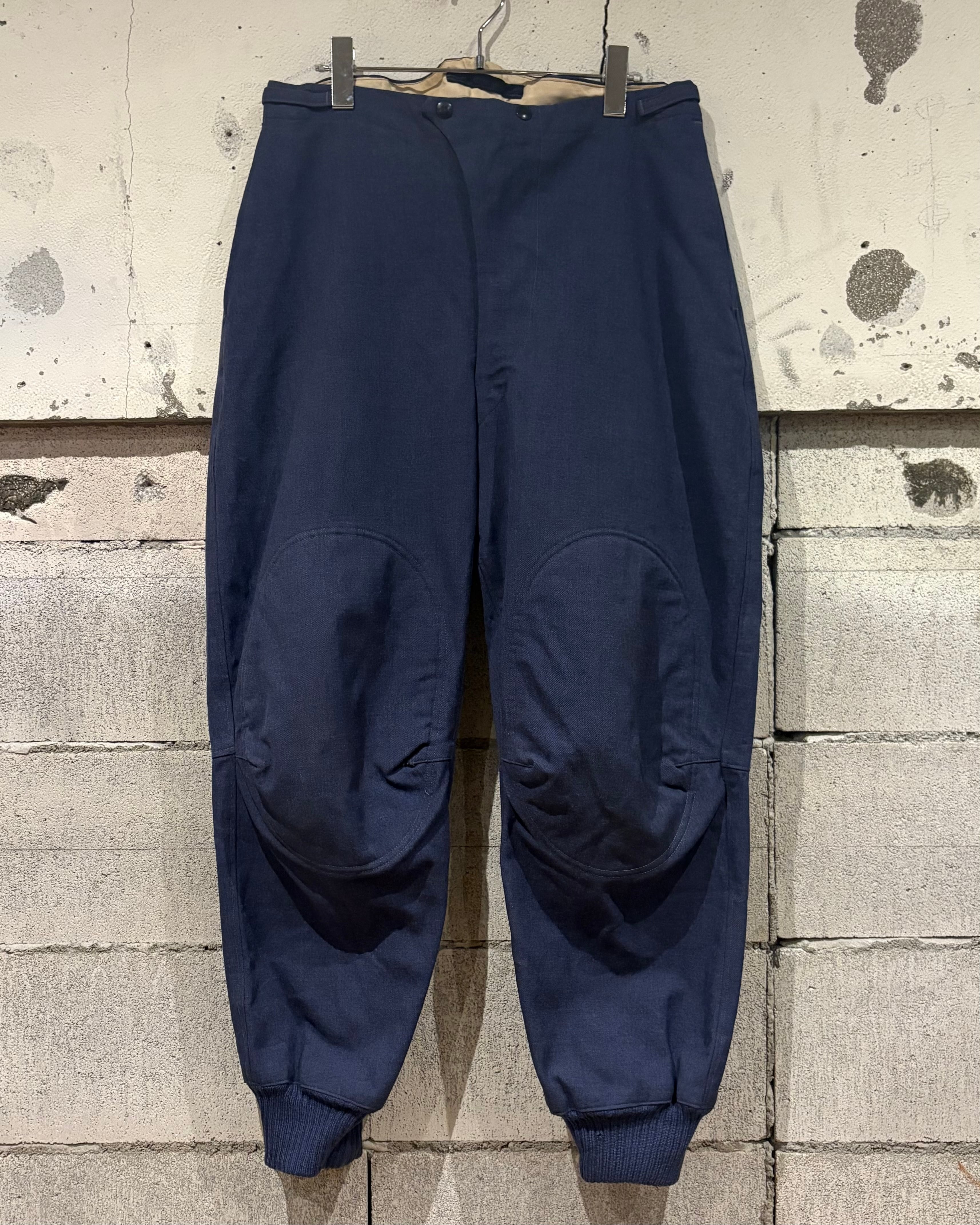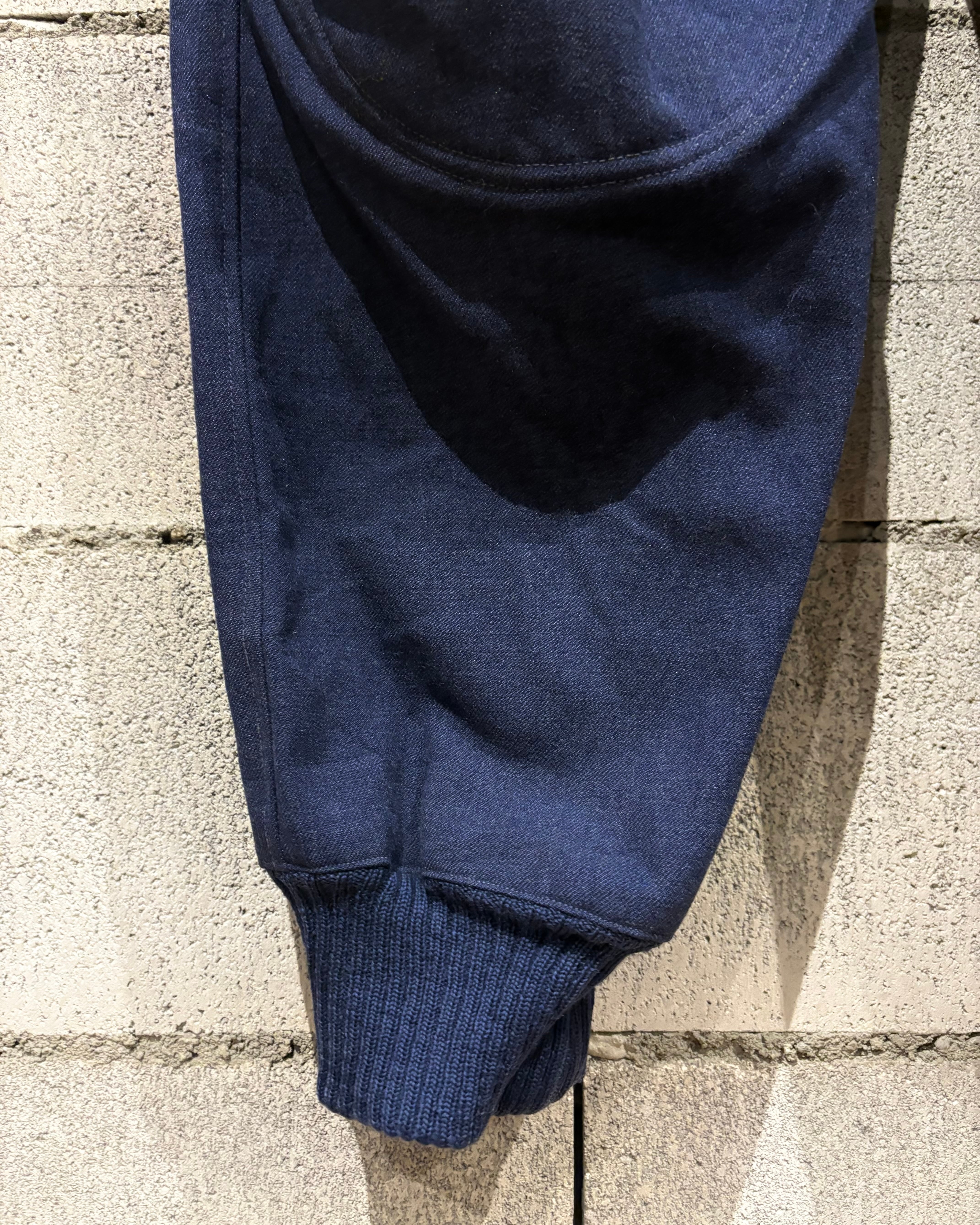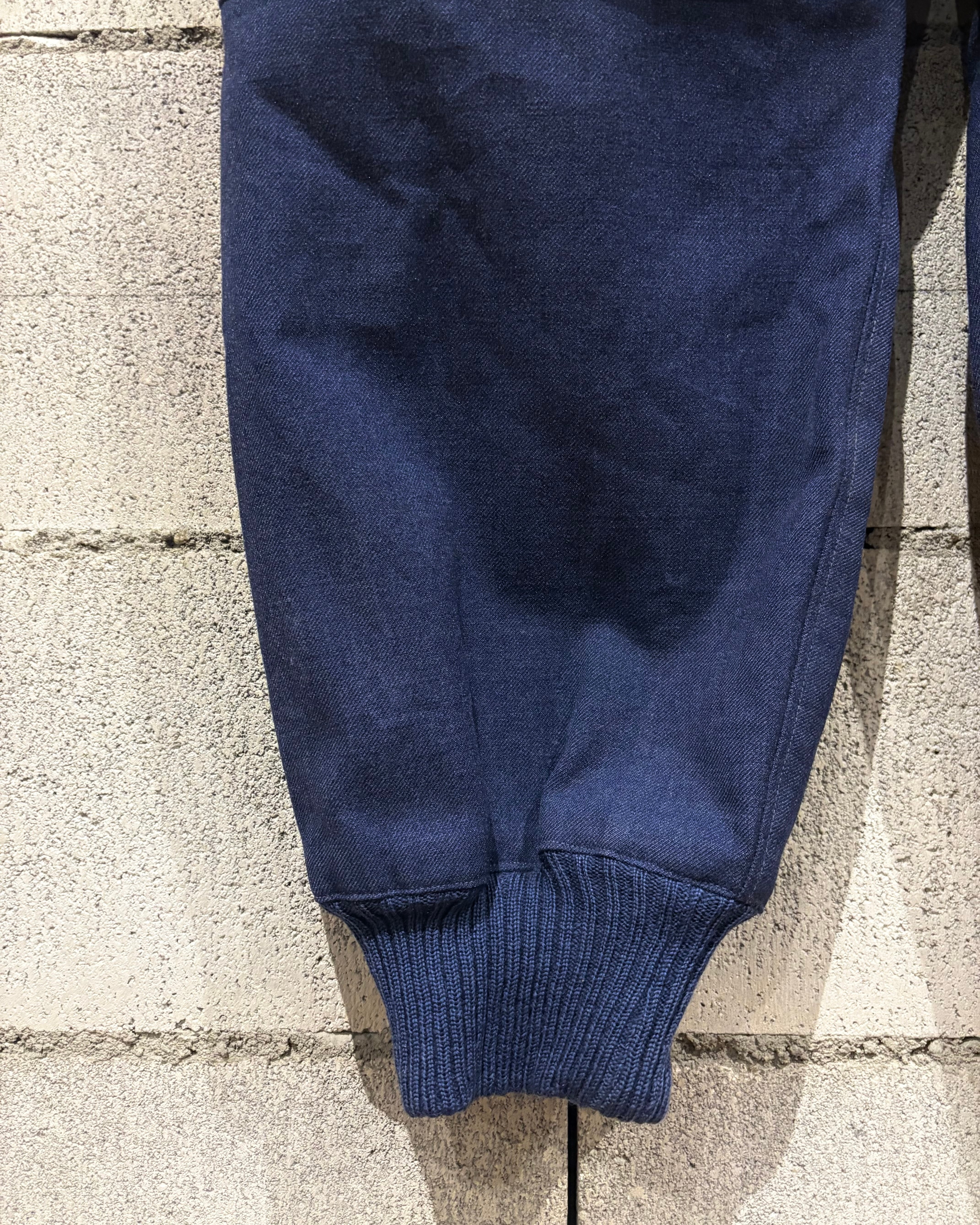 光沢のあるブルーグレーのウールを採用し、軽量かつ耐久性と防風性に優れた機能素材。膝、ヒップ部分にはパッドが入り、立体的な構造による可動性を確保。裾リブやバックのアジャスターベルトなど、ミリタリー特有の実用ディテールがしっかりと盛り込まれていますね。