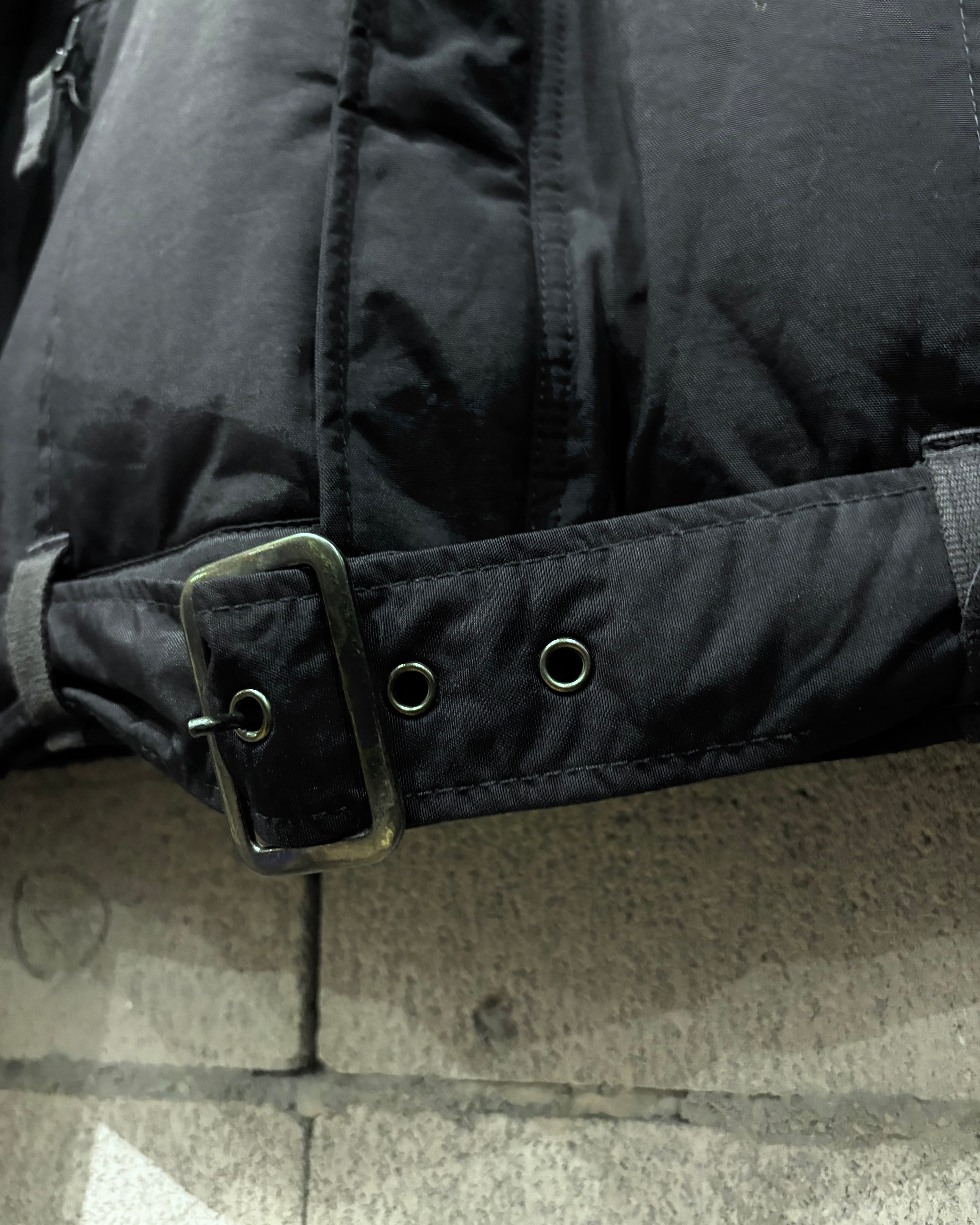 ハリのあるナイロンのボディに、フロントにはポケット、ウエストベルト、比翼仕立てのフロントなど、完成度の高いディテール群。その中にブランドロゴを載せたメタルタグがデザインのアクセントに。