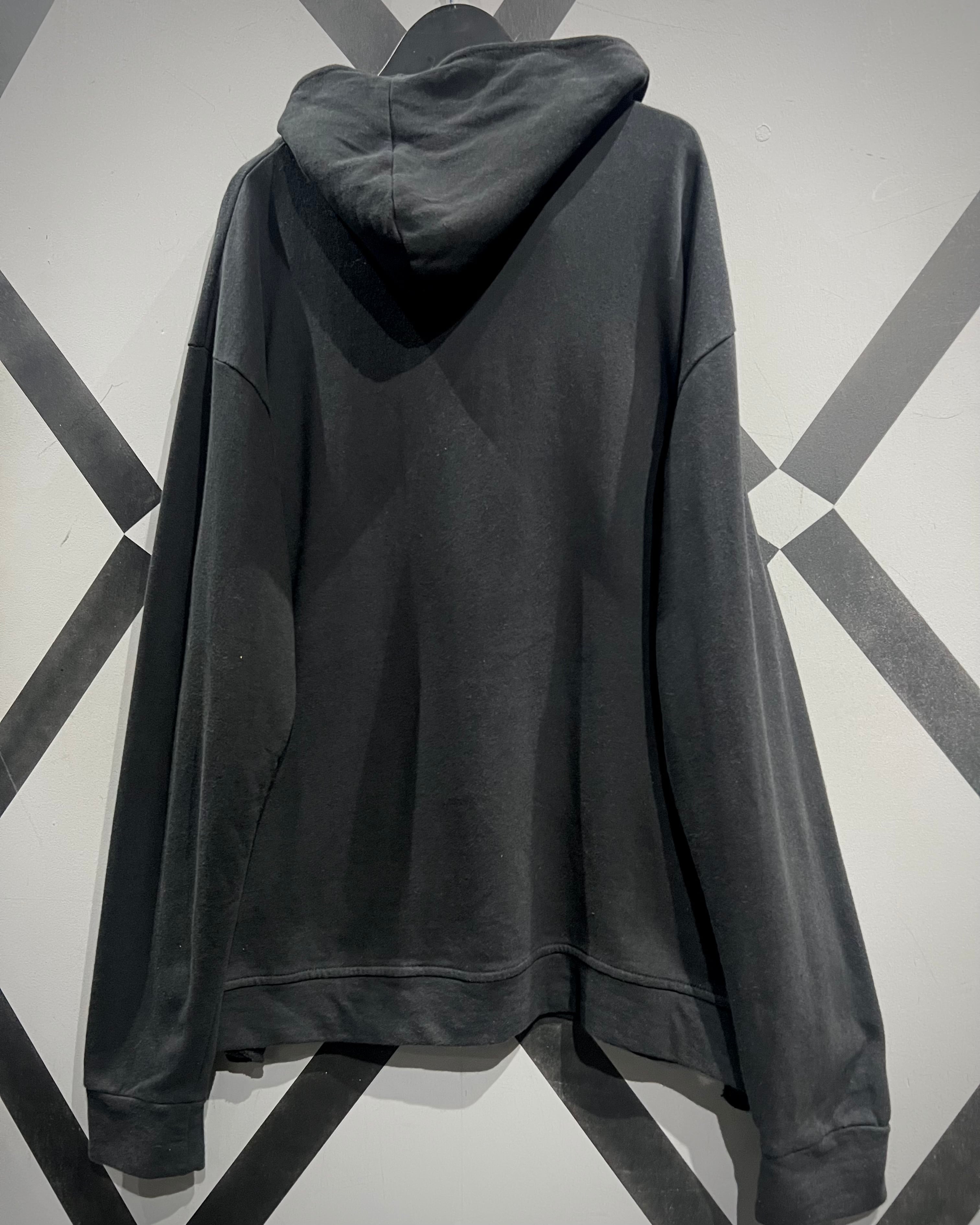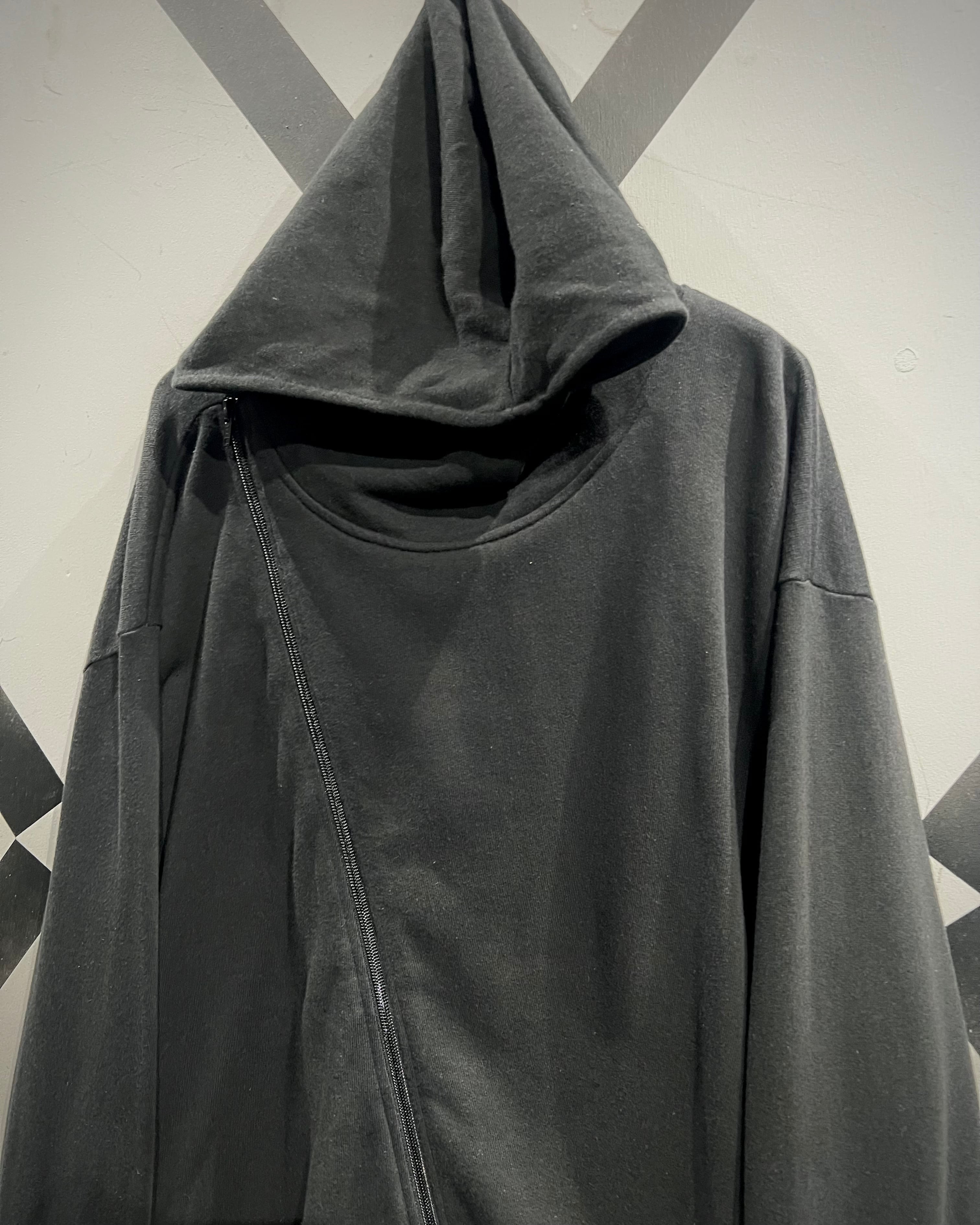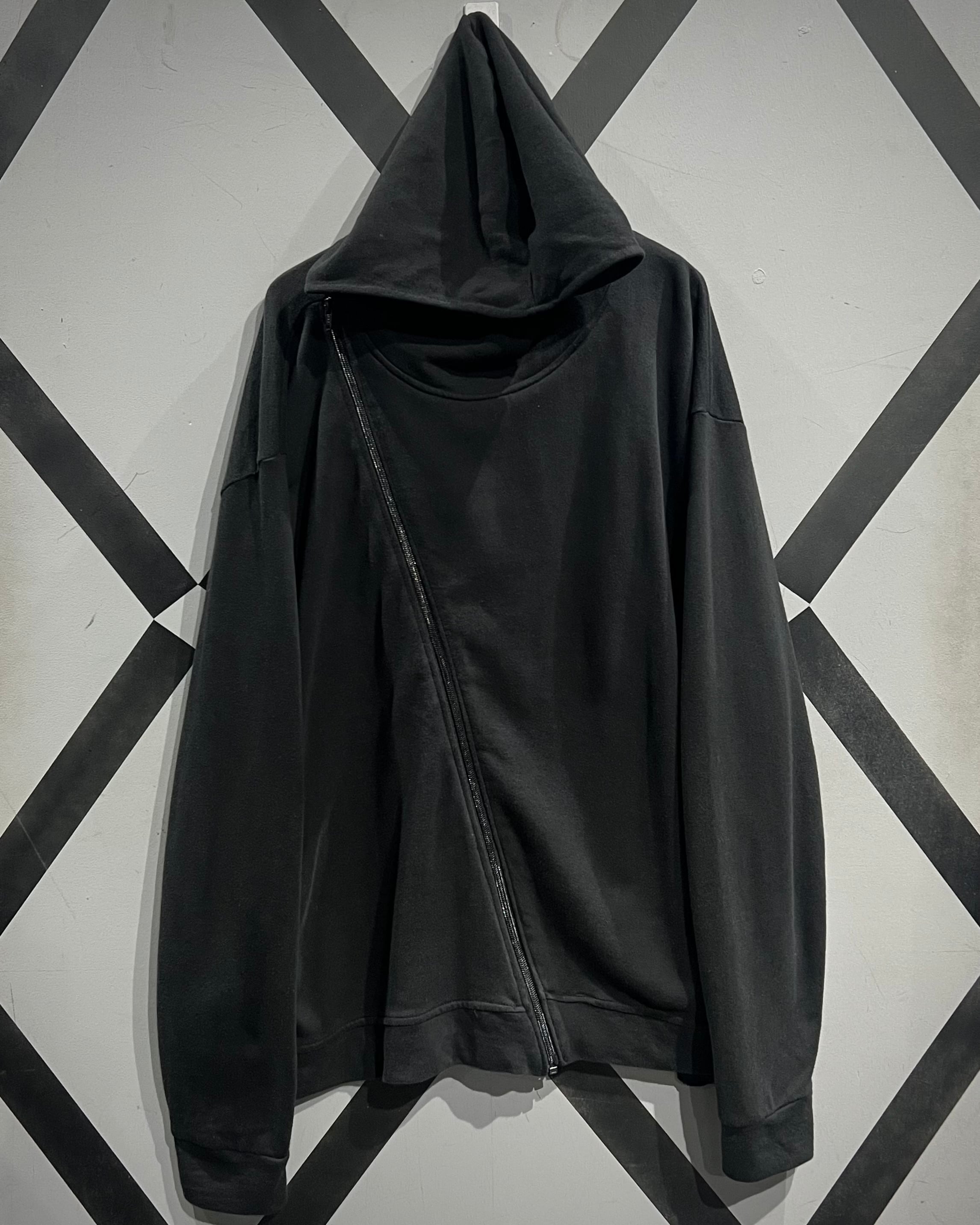 ブラックボディに斜め走るアシンメトリージップが印象的なスウェットフーディをご紹介いたします。
