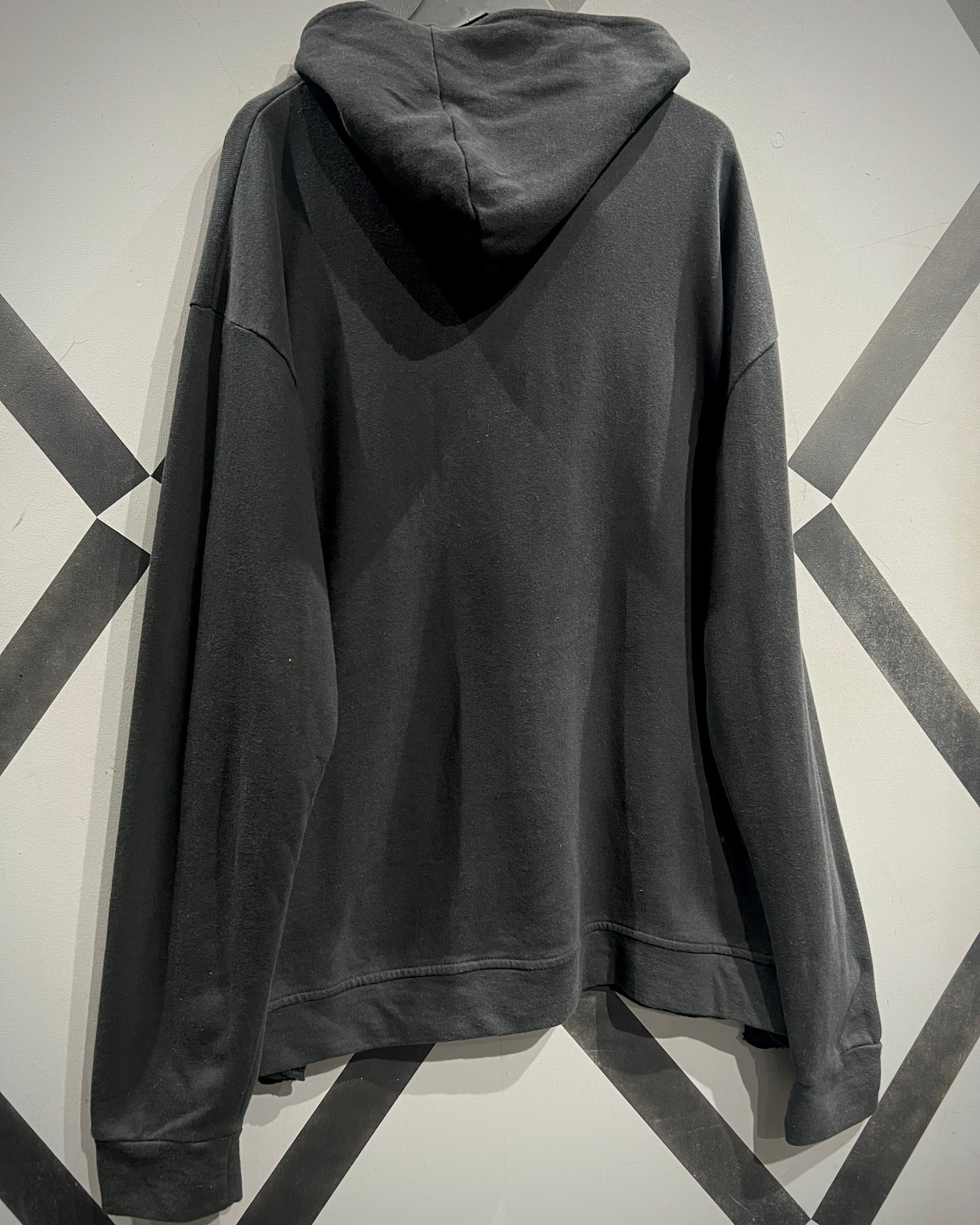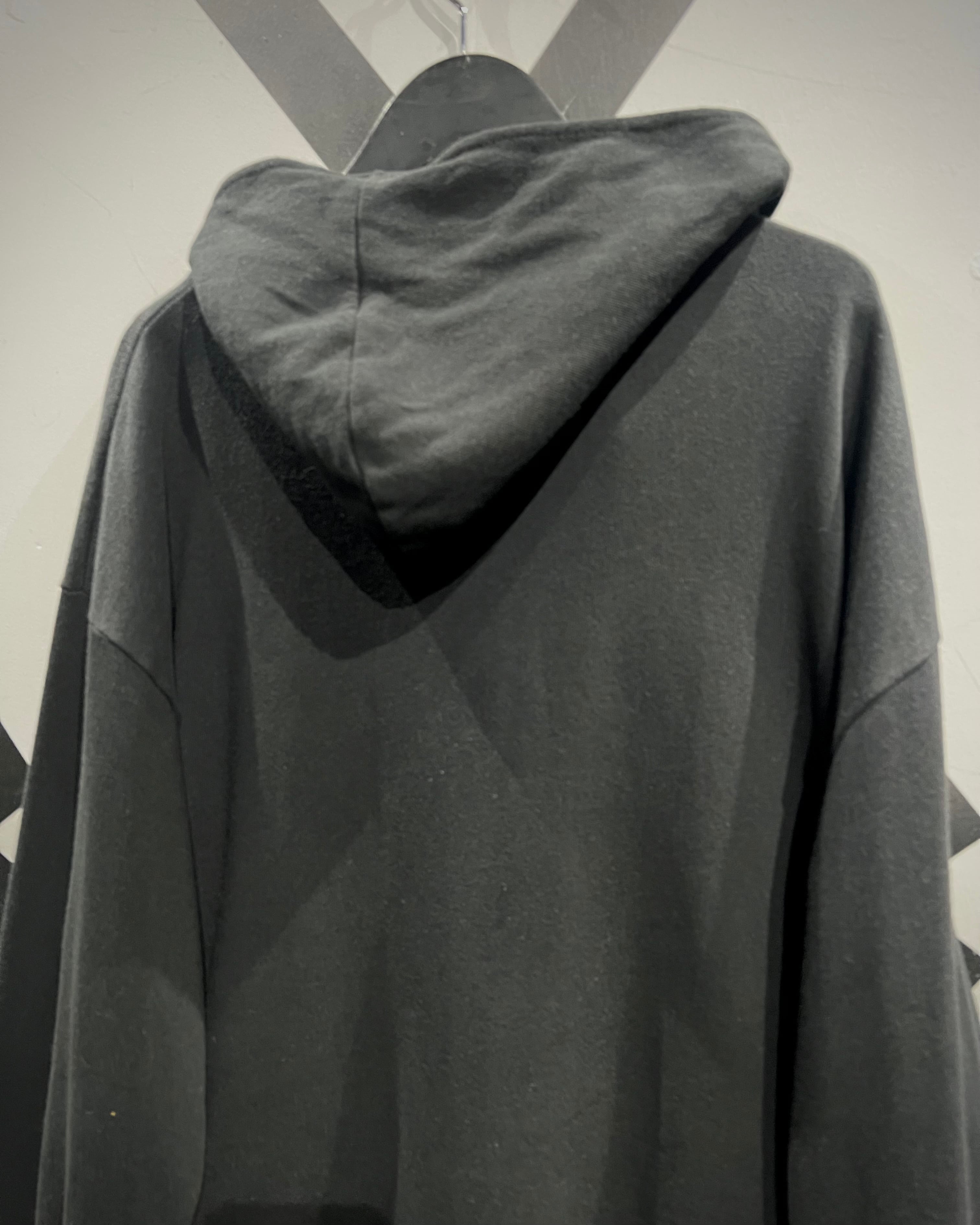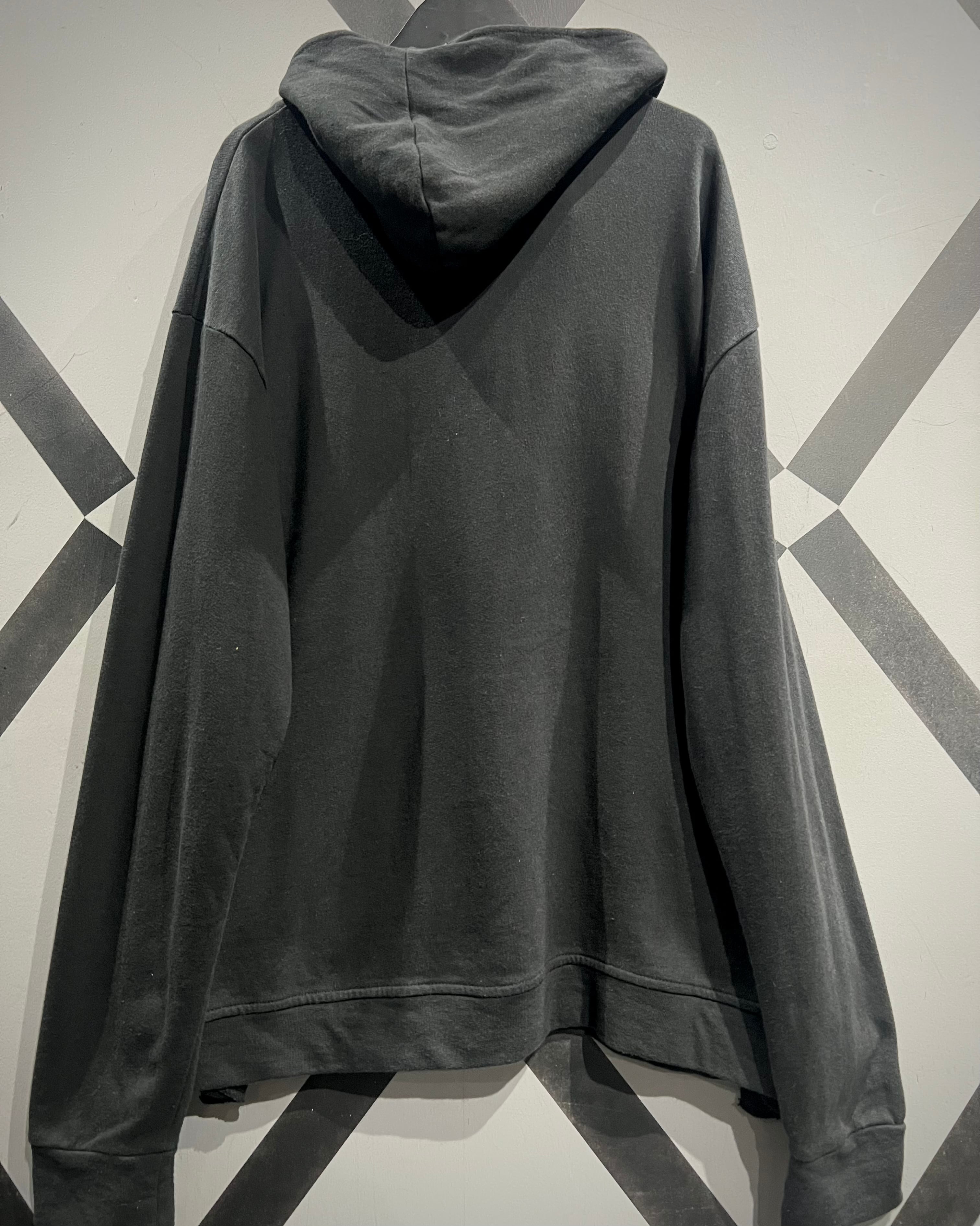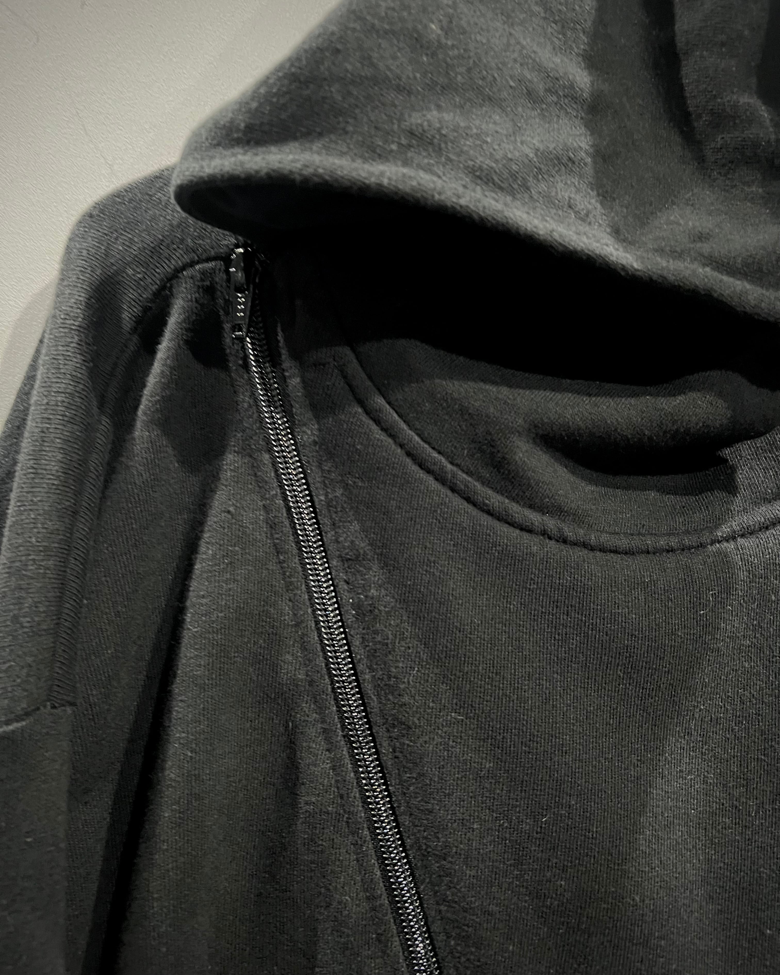 ブラックボディに斜め走るアシンメトリージップが印象的なスウェットフーディをご紹介いたします。