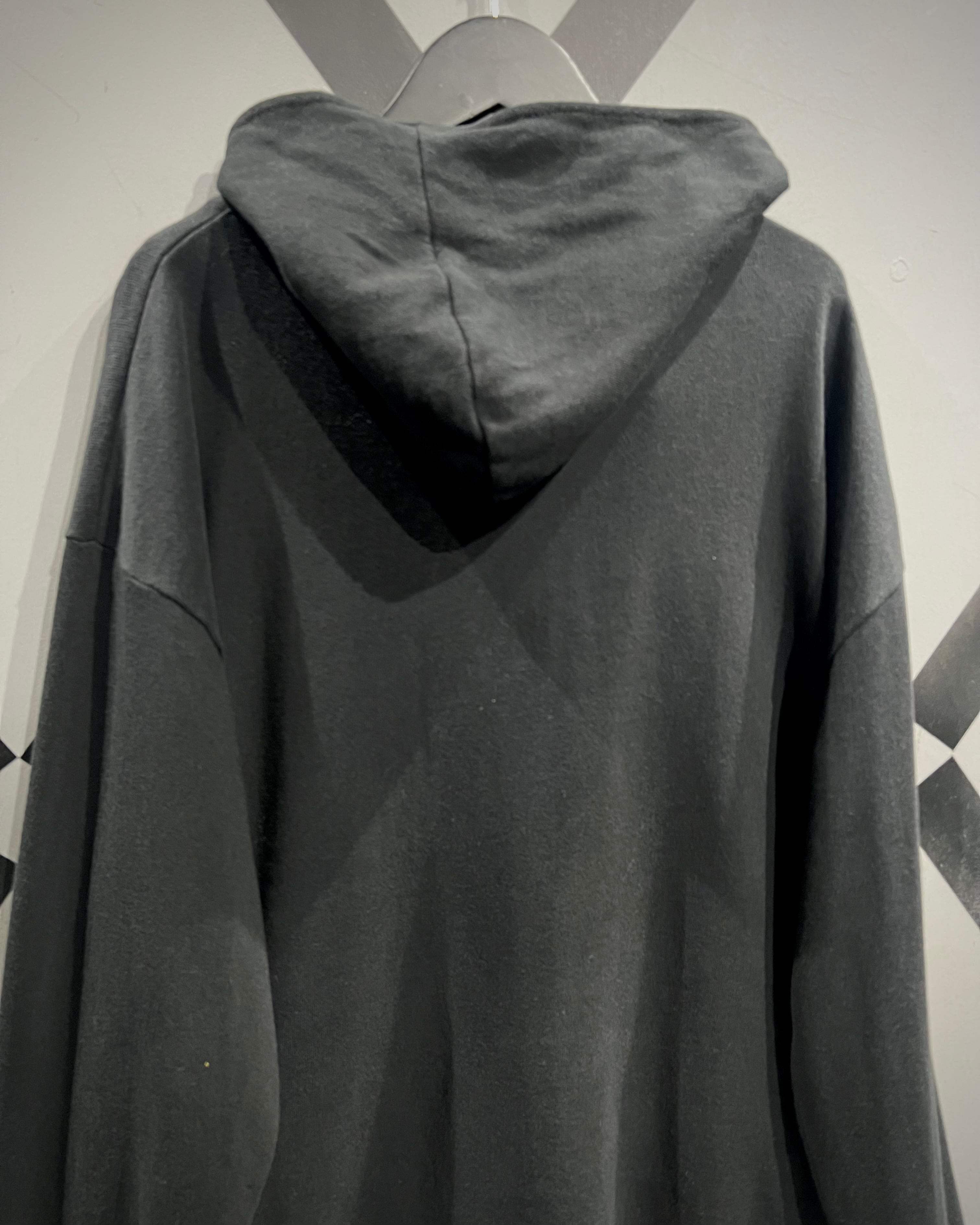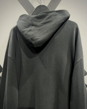 柔らかなスウェット素材が描くゆったりとしたドレープに、ハイネック気味のフードが加わることで立体的なフォルムを形成。機能的なディテールながらも、古着の域に収まらない高いデザイン性を誇ります。