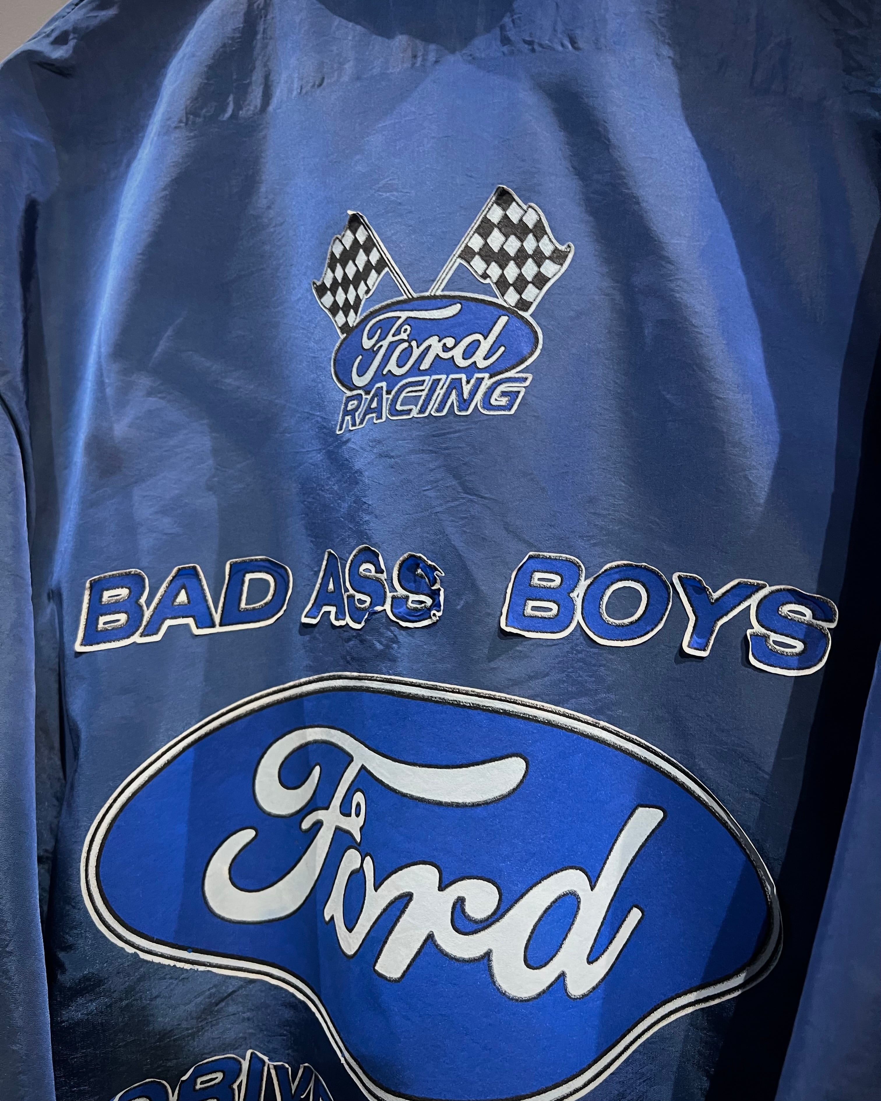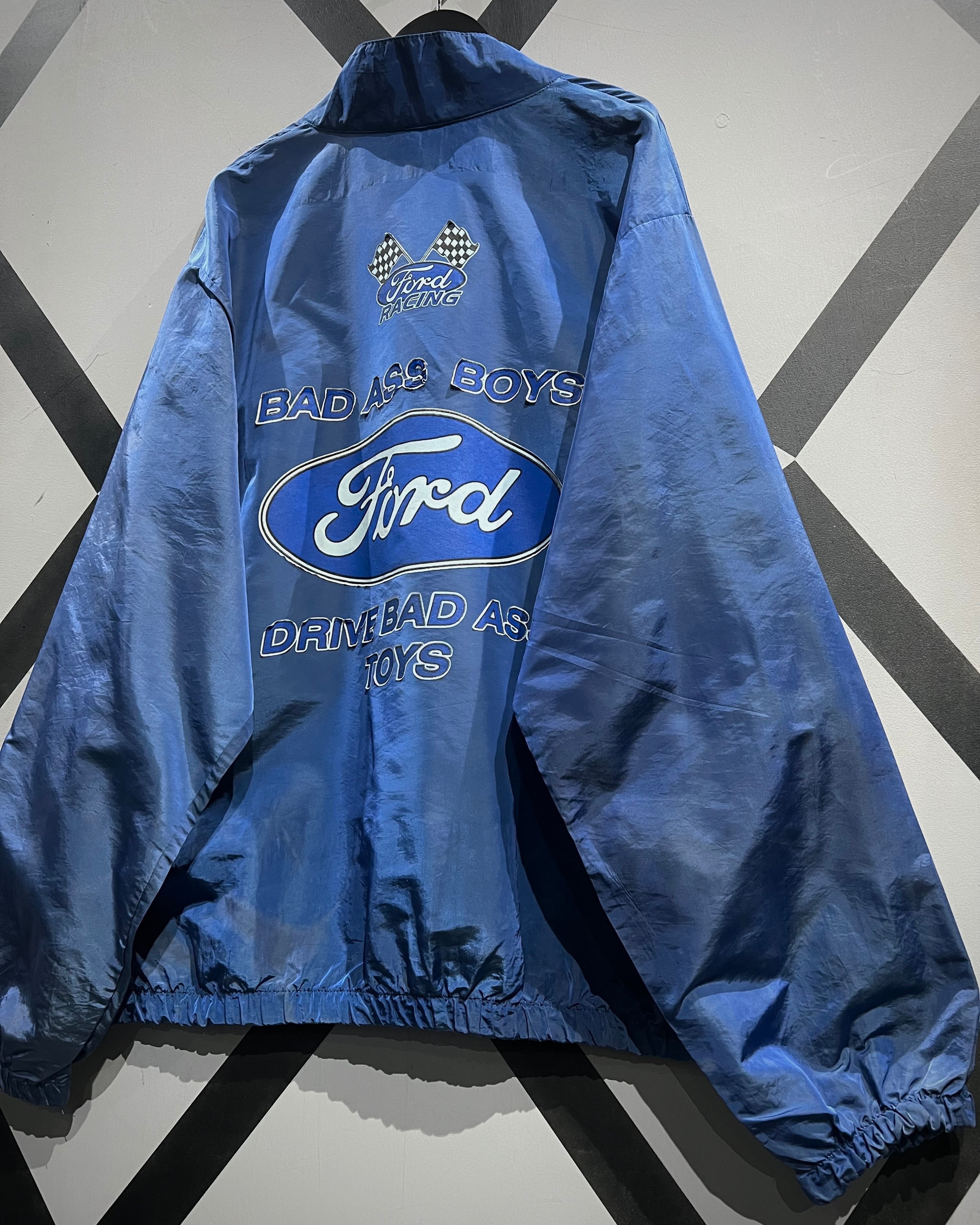 メタリックに輝くブルーのナイロンボディに、フロント、バック、スリーブへと贅沢に配置された“Ford Racing”ロゴとチェッカーフラッグが目を惹きます。