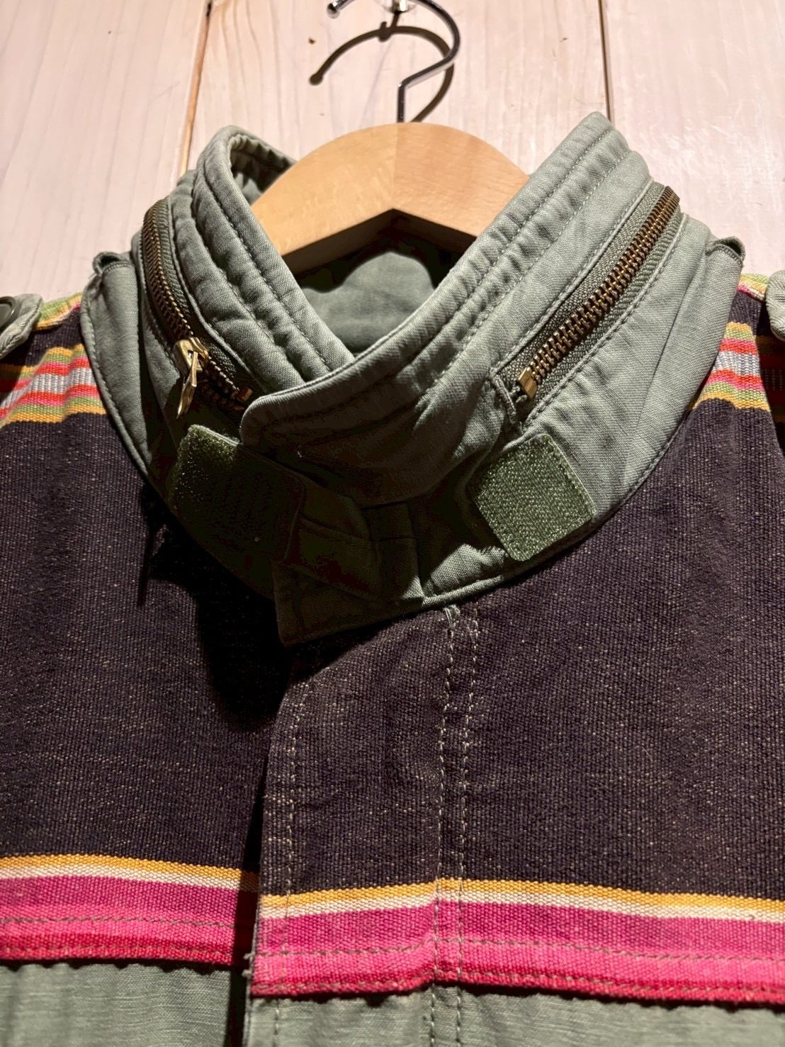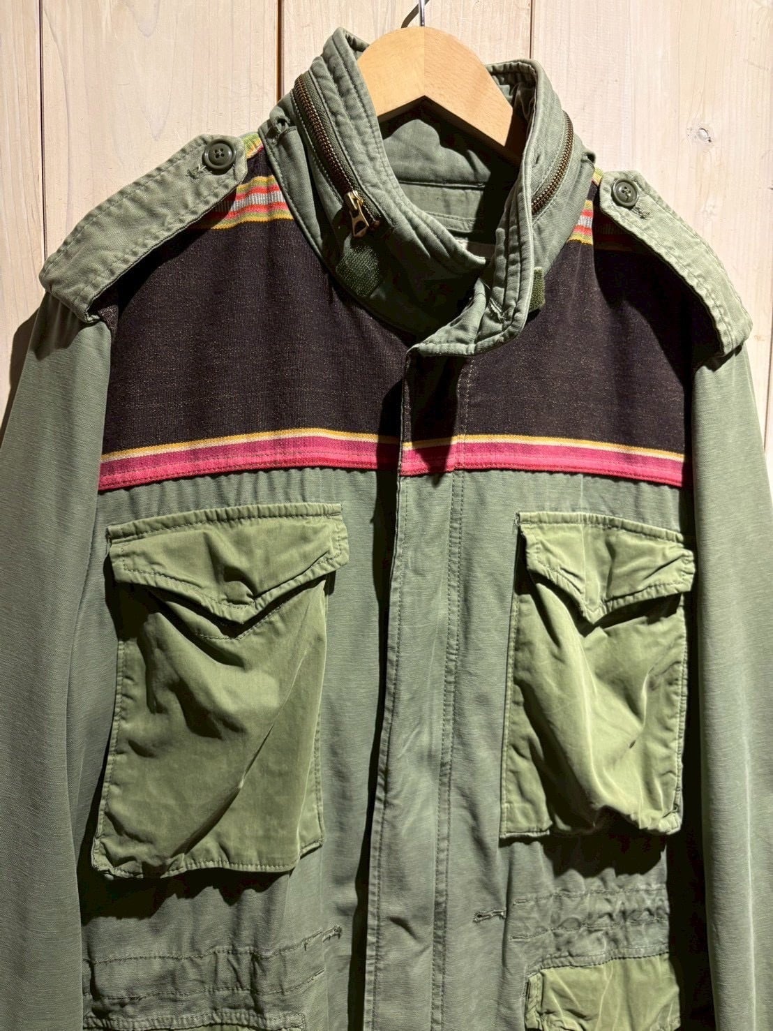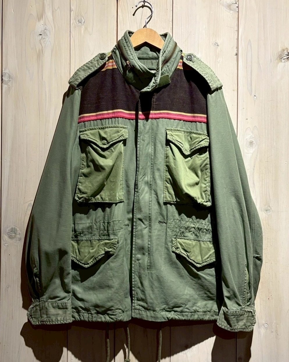US Armyの名作 M-65フィールドジャケット をモデルに採用したボディに、ヨークにかけてボーダー柄のテキスタイルを切り替えた1着。