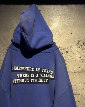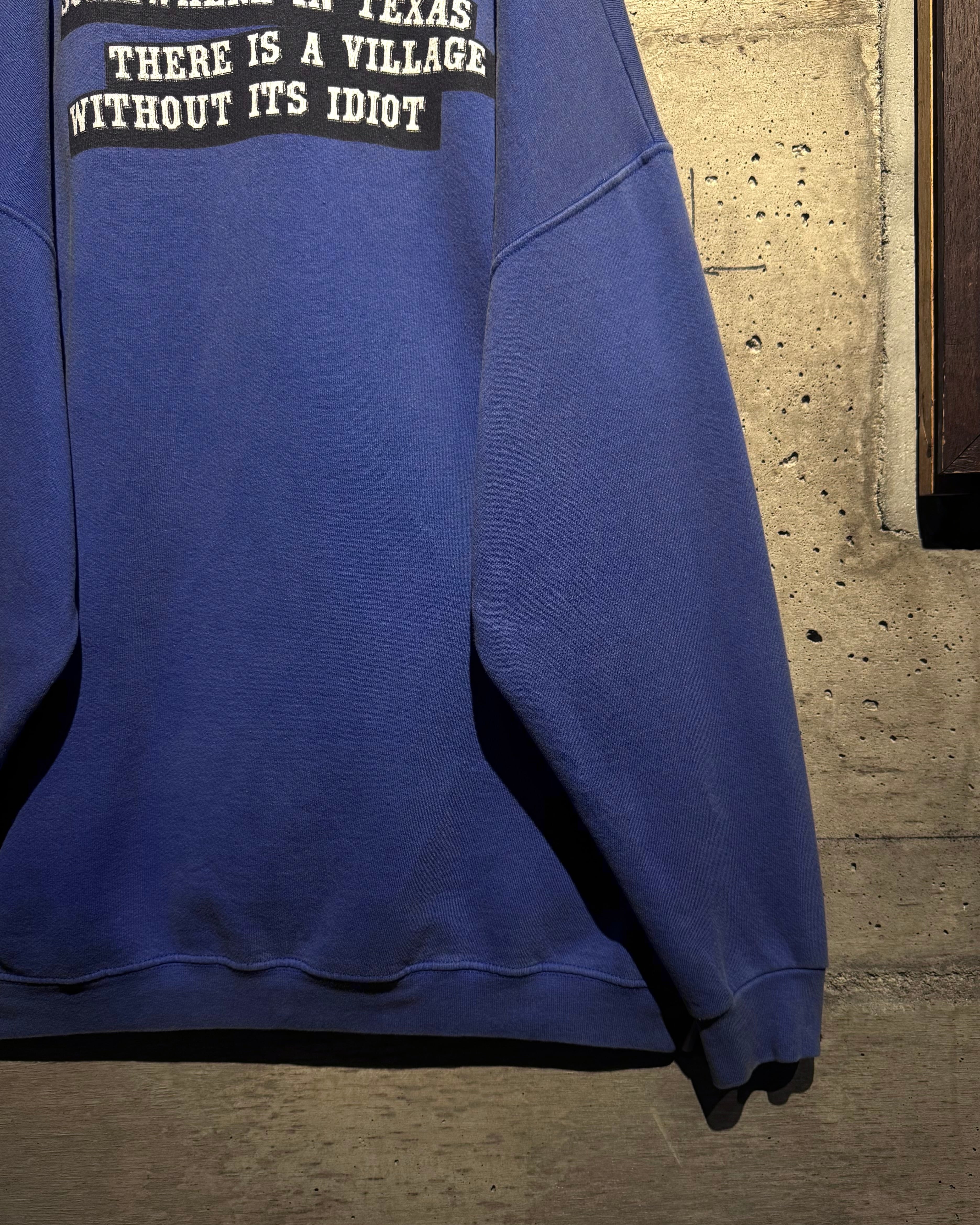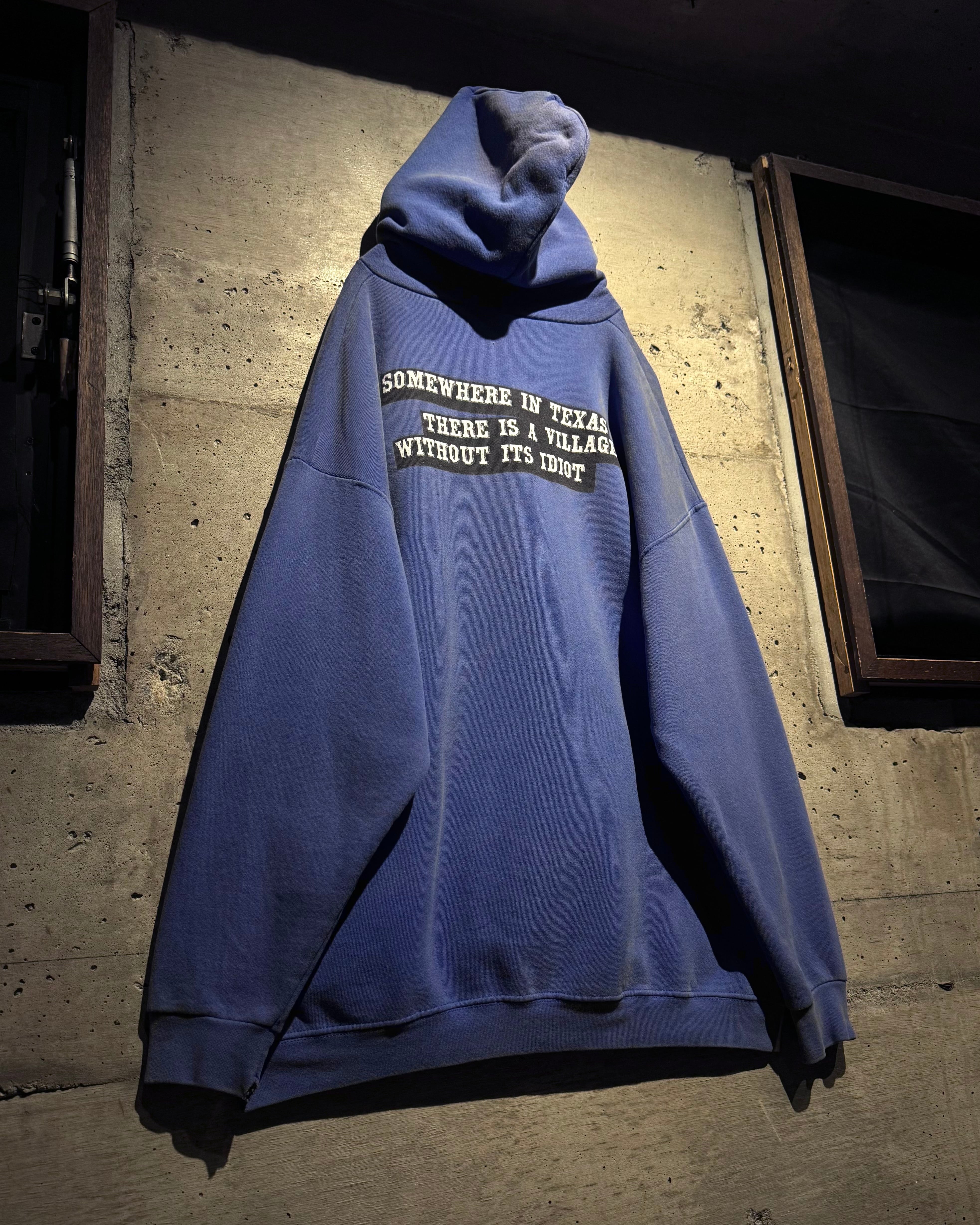 フロントには星条旗をモチーフにした大胆なプリントと、当時の風刺的メッセージを象徴するアートワーク。背面には「Somewhere in Texas there is a village without its idiot」の文字を配置し、当時のアメリカ社会を痛烈に皮肉るメッセージを強烈に放つデザインに仕上げられています。