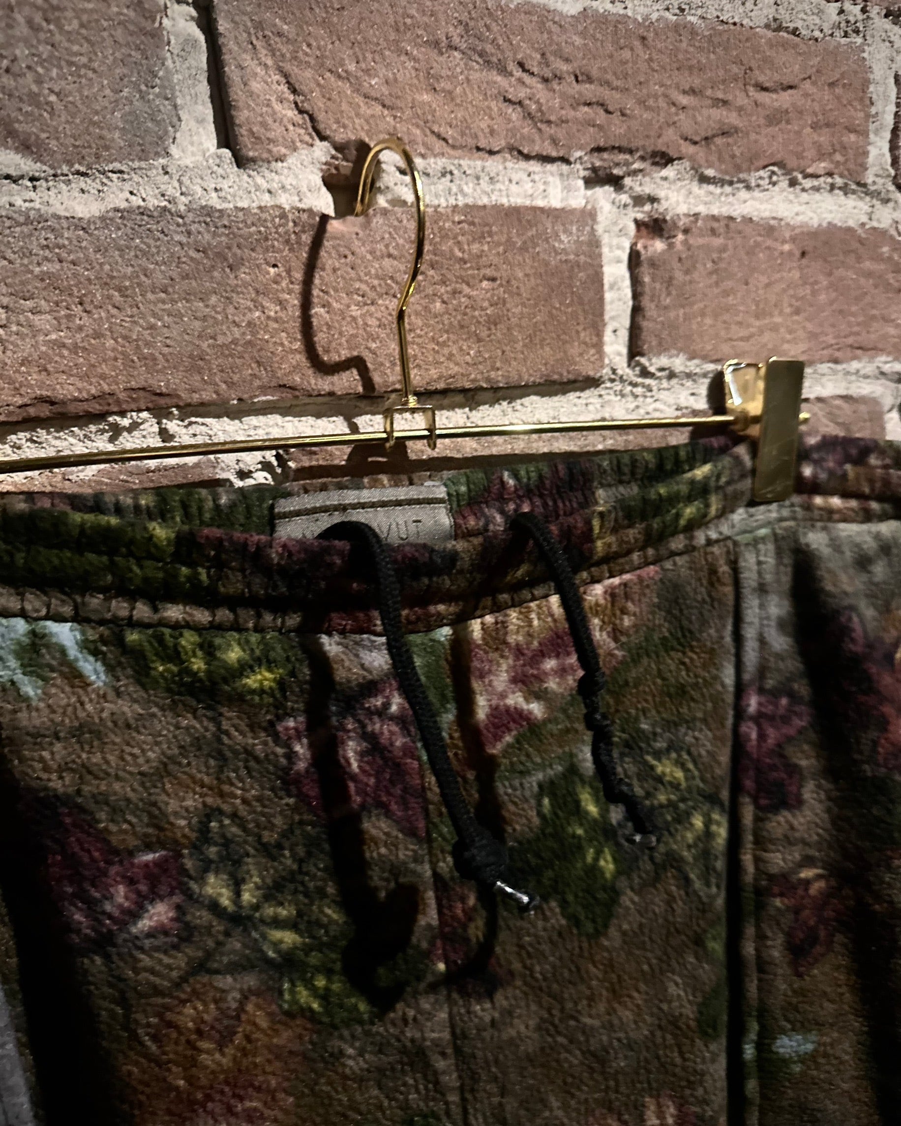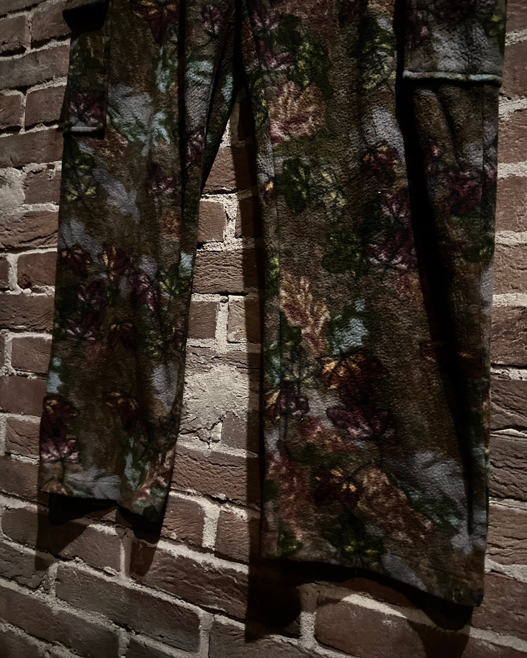 落ち葉や草木をモチーフにしたボタニカルパターンが全面に描かれたフリースカーゴパンツ。