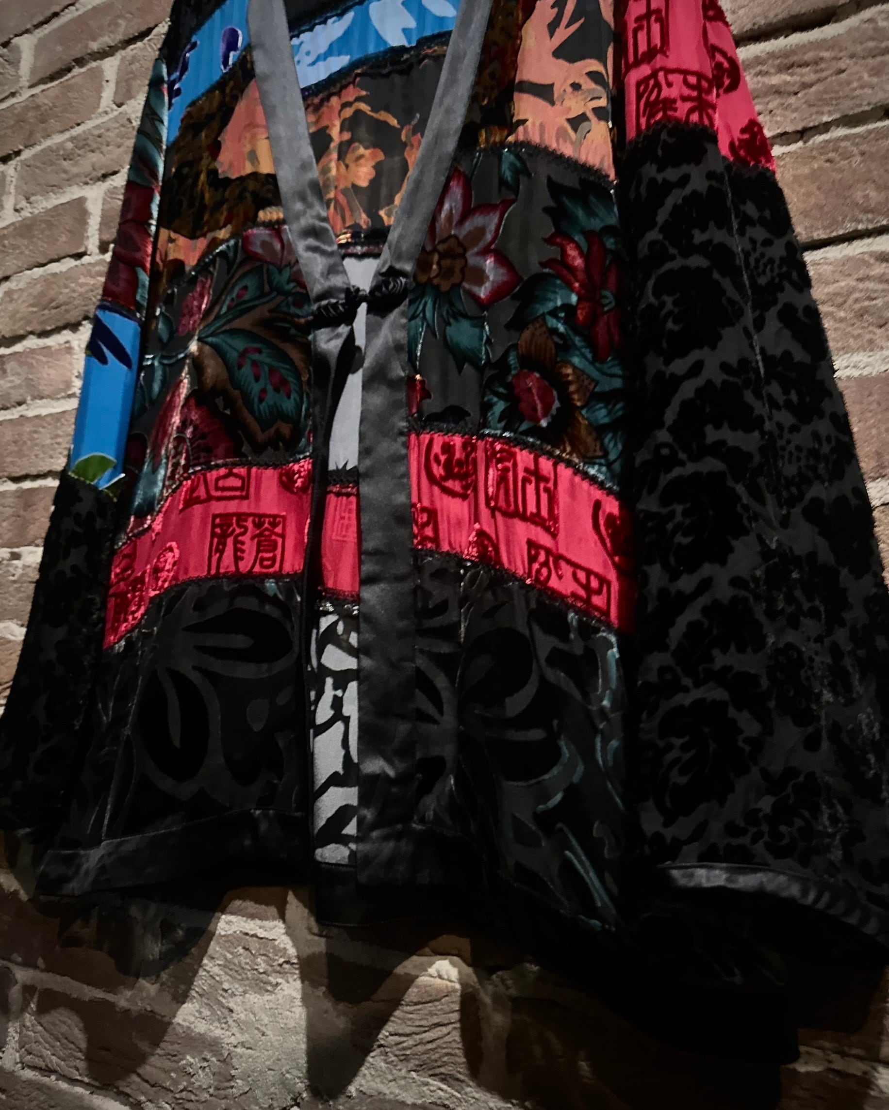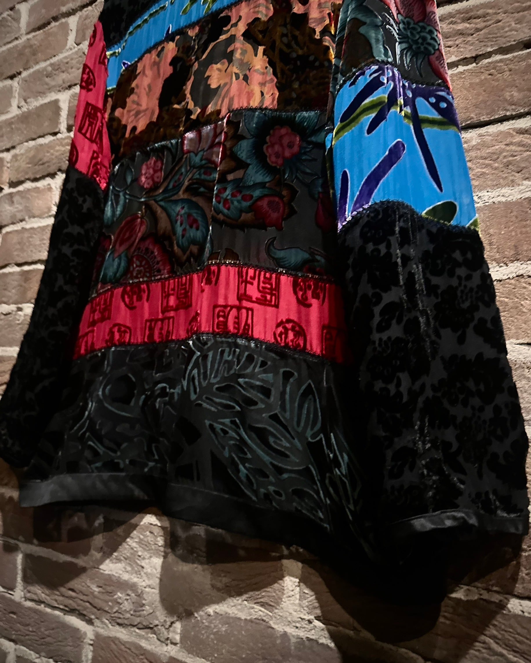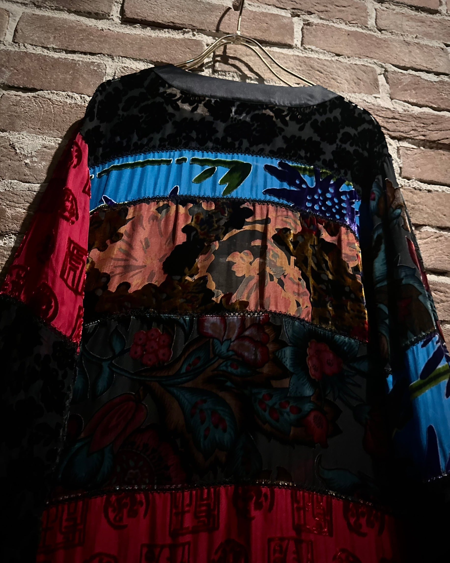 ブルー、レッド、ブラック、オレンジなど多彩なカラーを切り替えで構成し、ボタニカルなど様々なモチーフを織り交ぜた仕上がり。ベロアやシアー素材を組み合わせ、光の角度によって様々な表情を見せ、深みのある1着に。