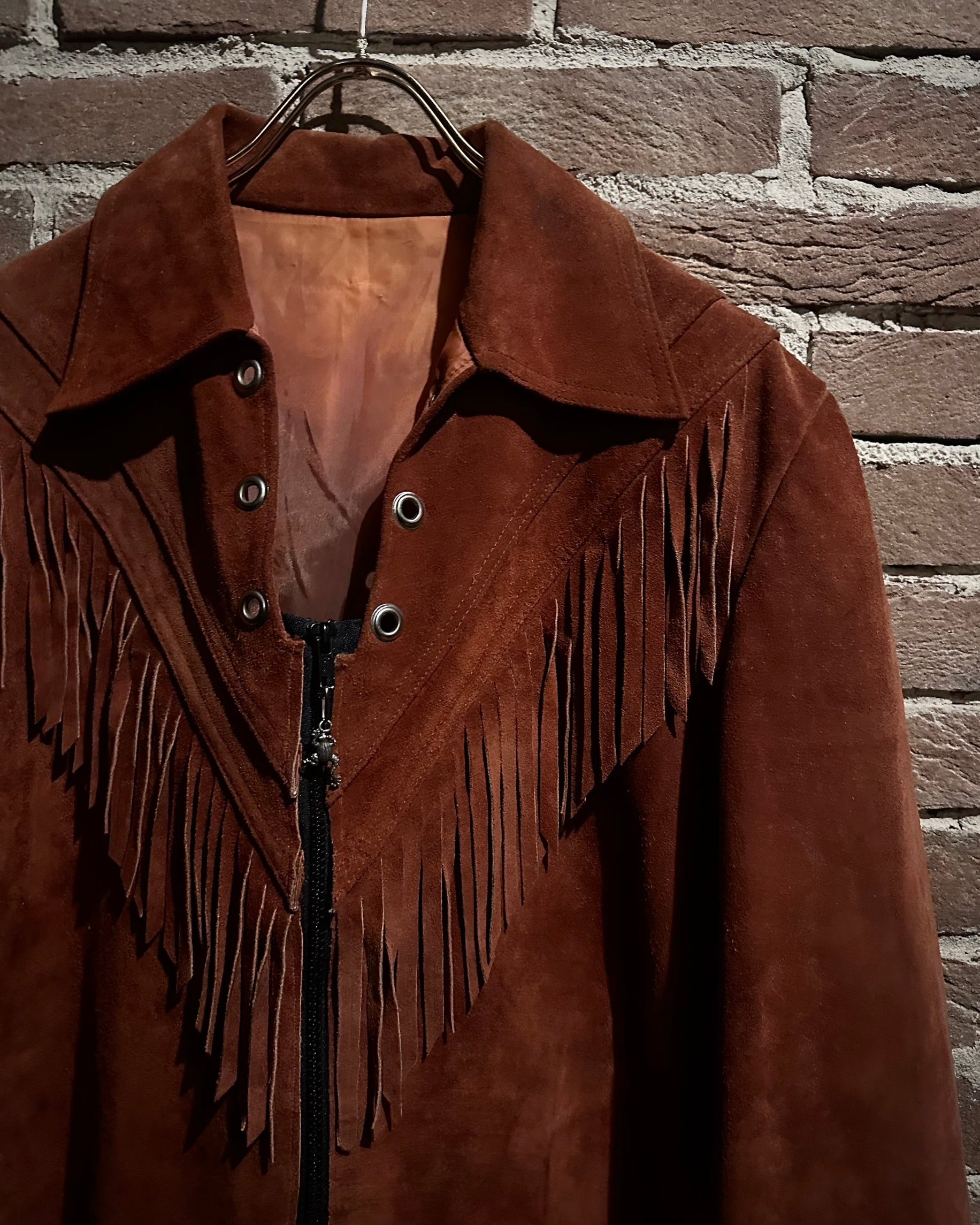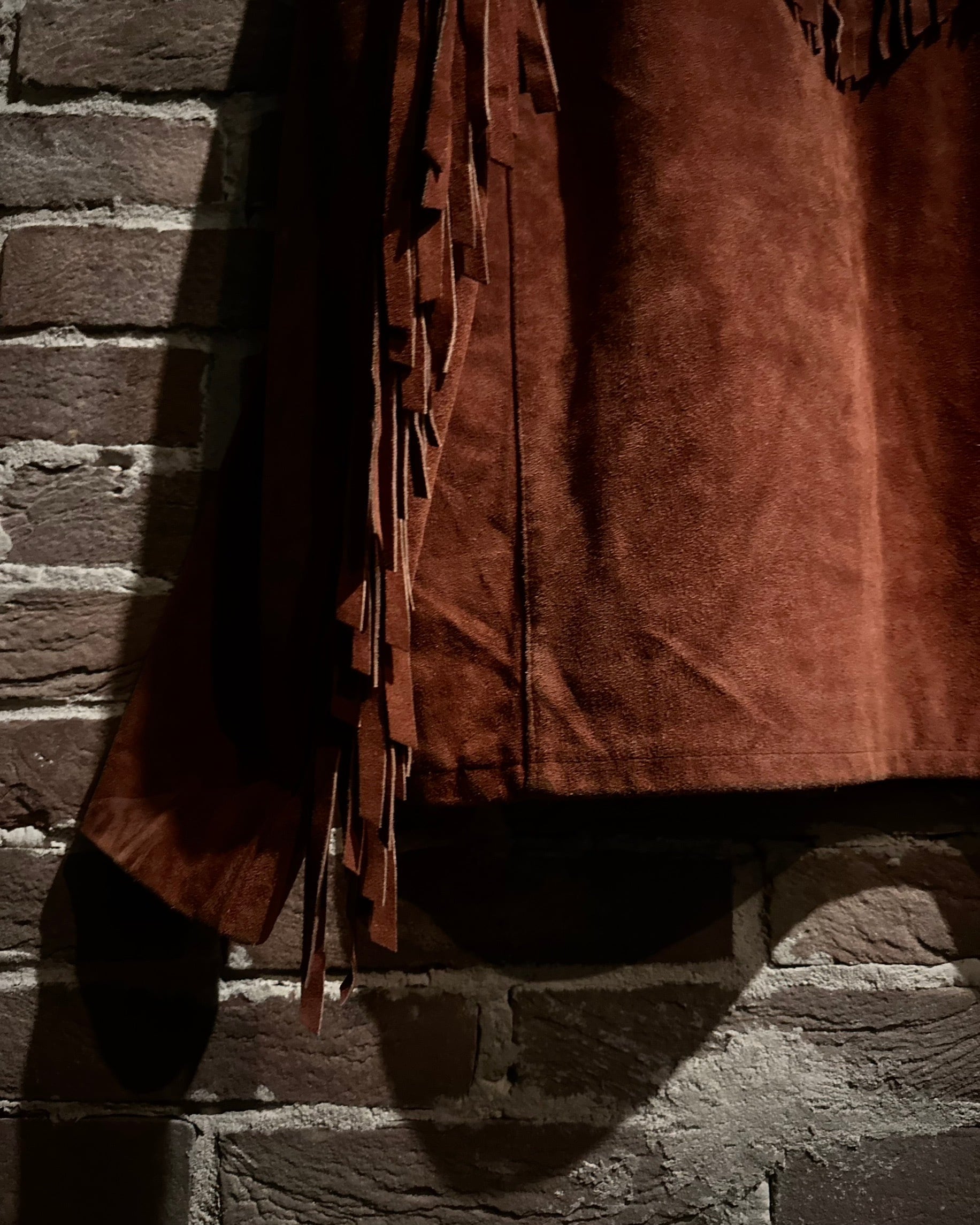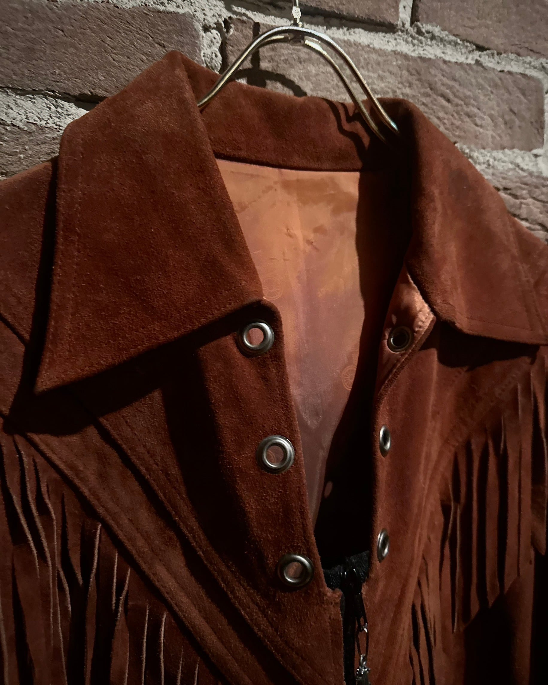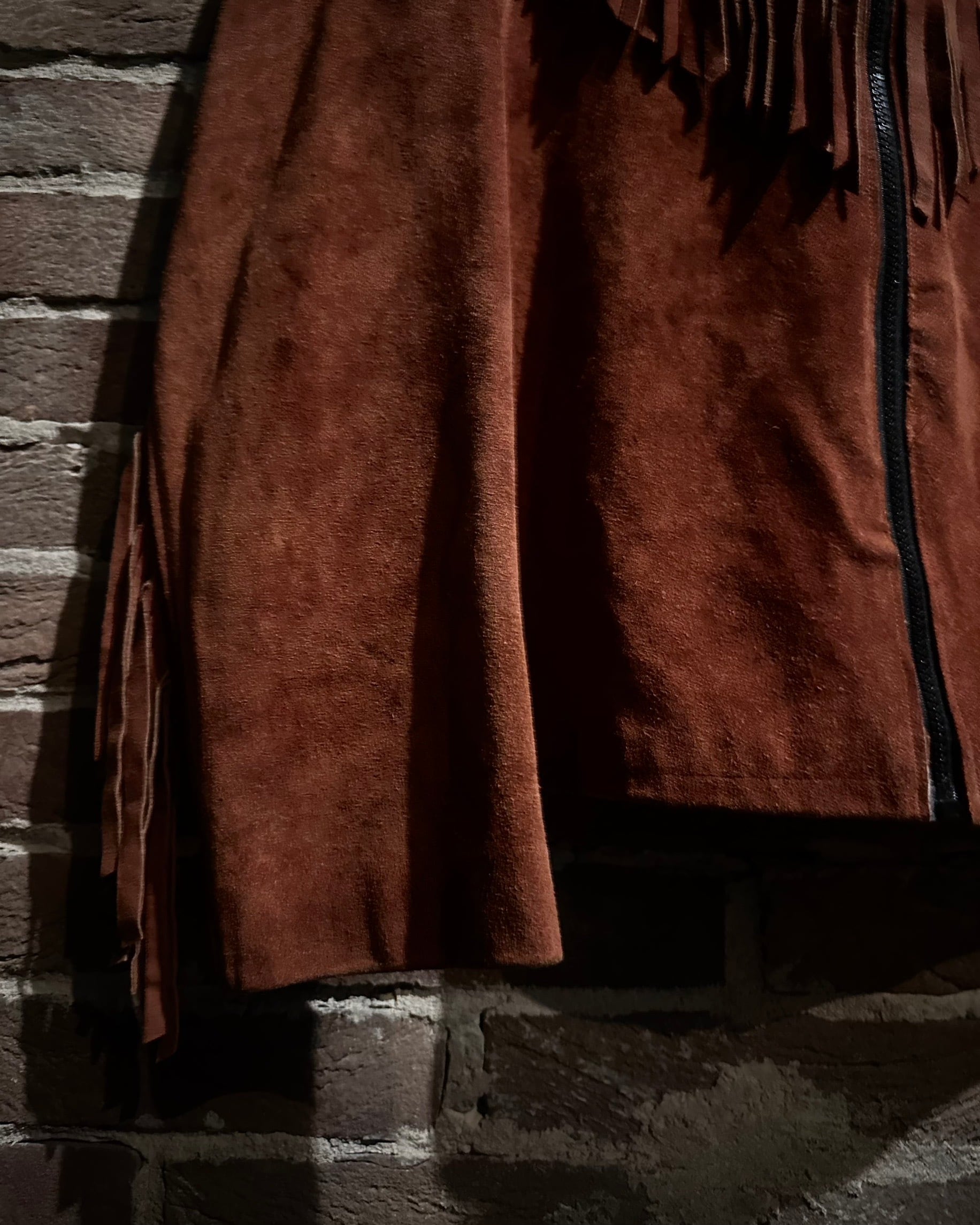 深みのあるブラウンスエードを贅沢に使用し、前所有者のカスタムが施された70'sヴィンテージのフリンジジャケット。