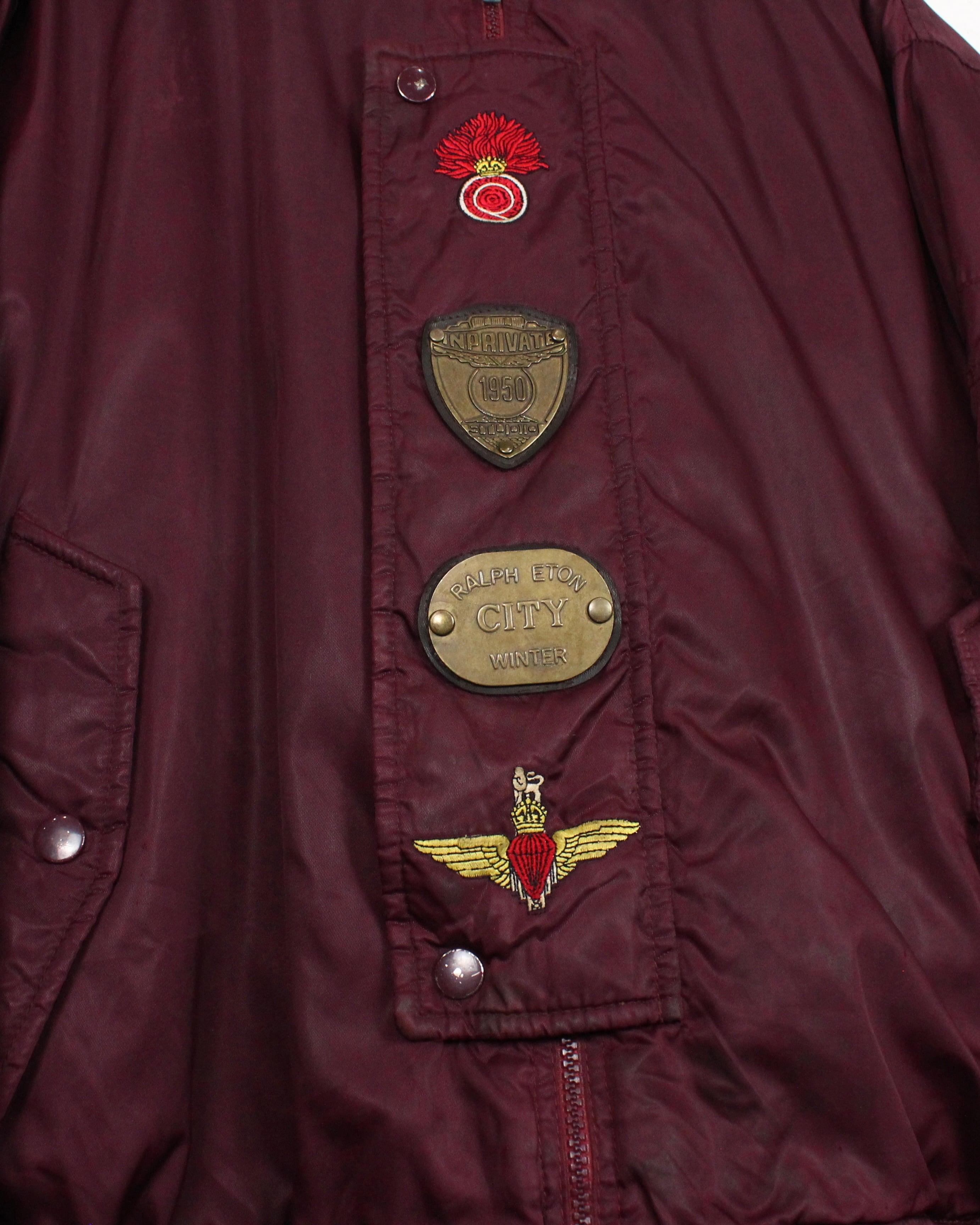 深みのあるバーガンディーカラーが印象的な、MA-1フライトジャケット。