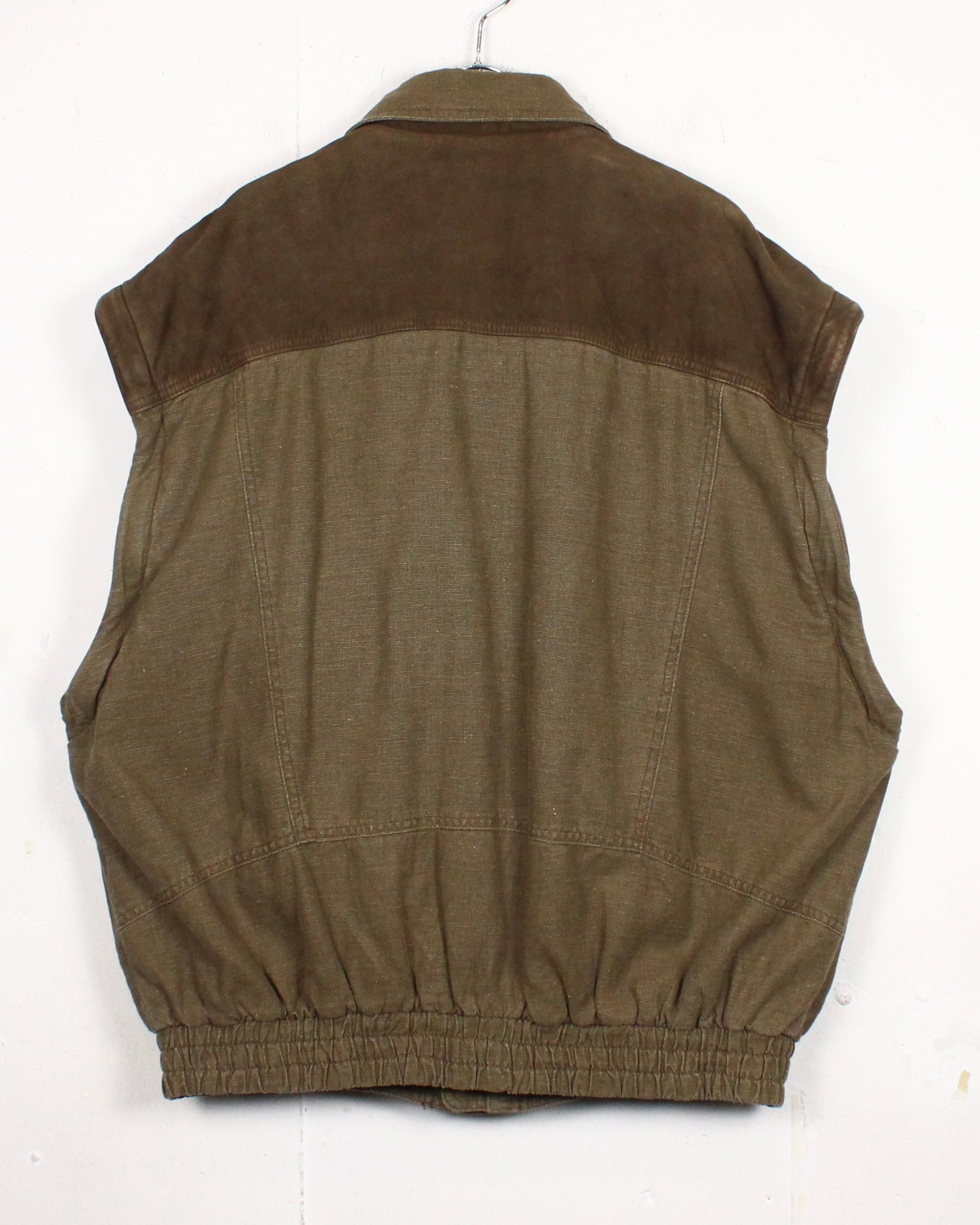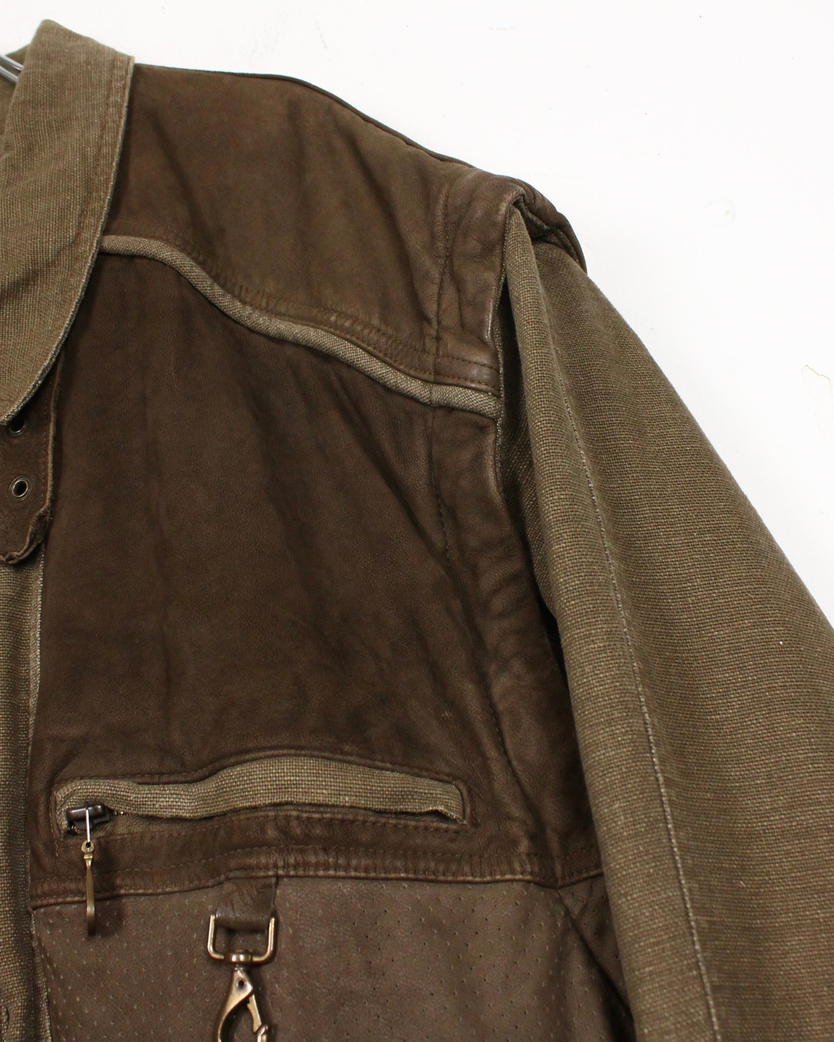 ドライな質感のジャケットのボディに、レザーベストを重ねたような、レイヤード風のデザインに仕上げられた逸品。