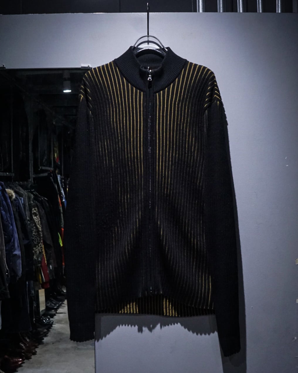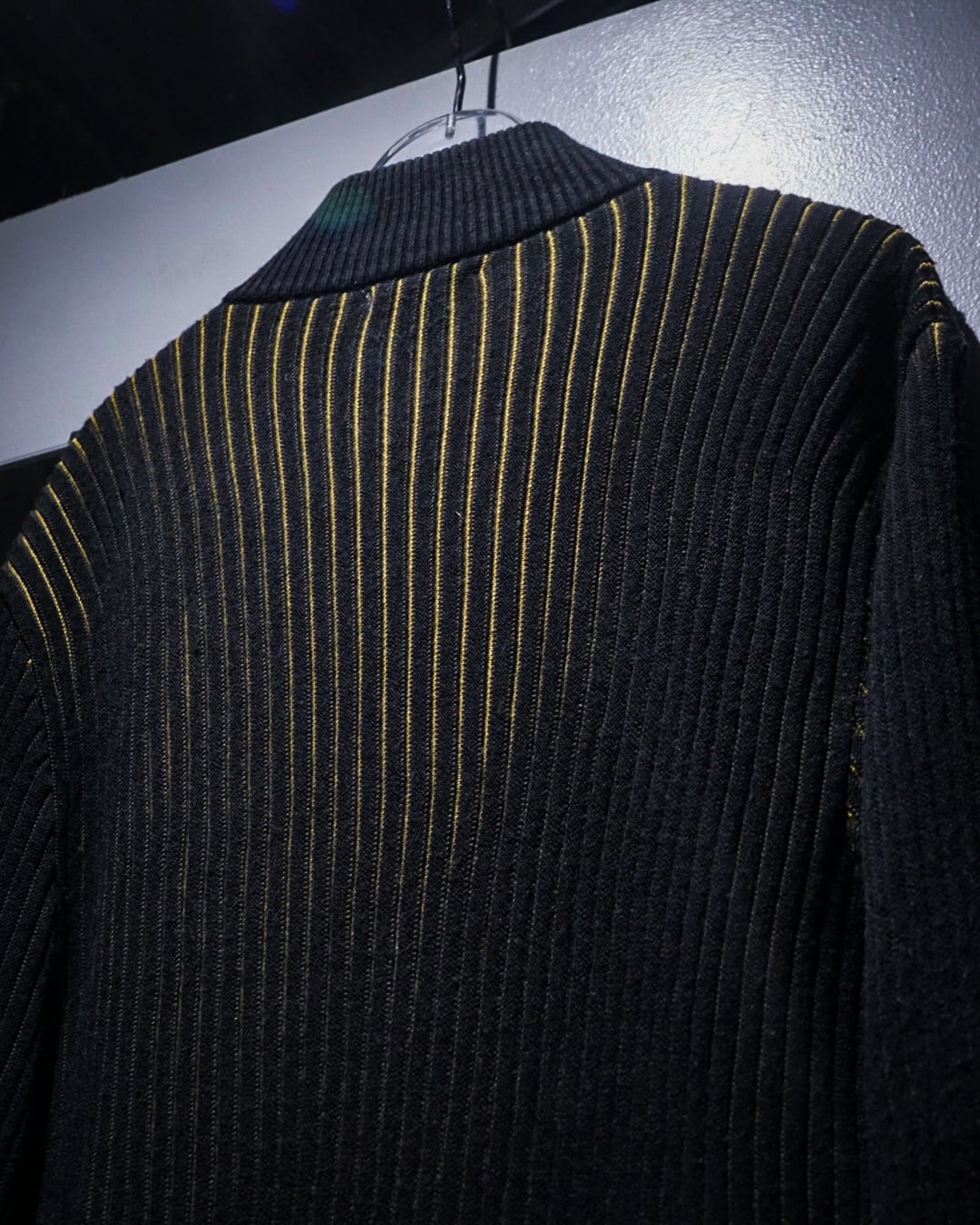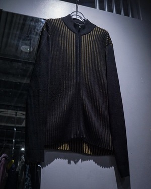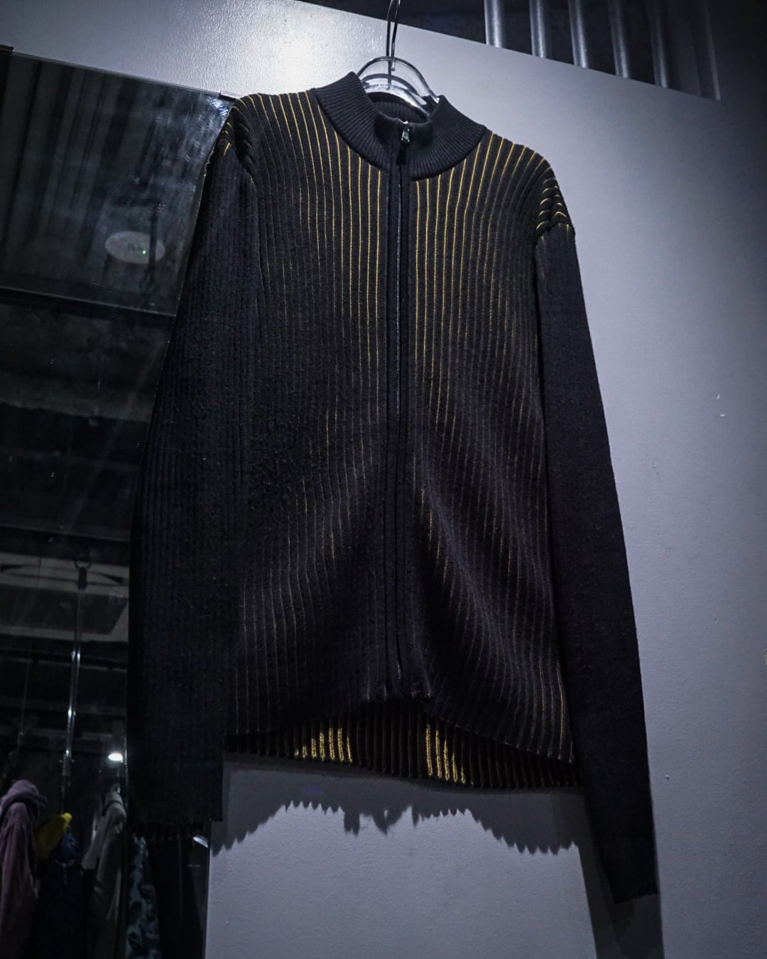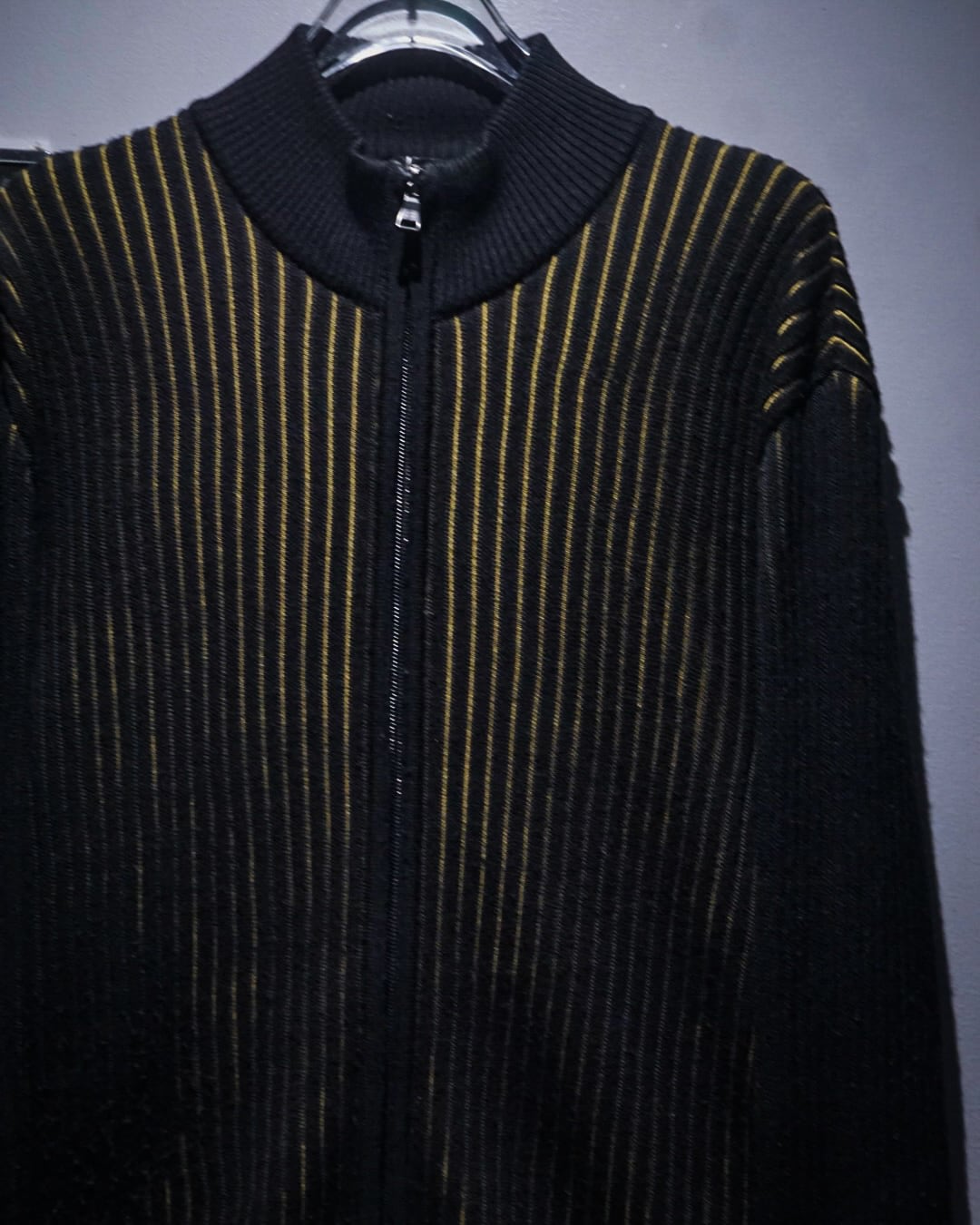 黒のボディにブラウン、ゴールドのピンストライプを走らせた、立体感のあるジップアップニット。