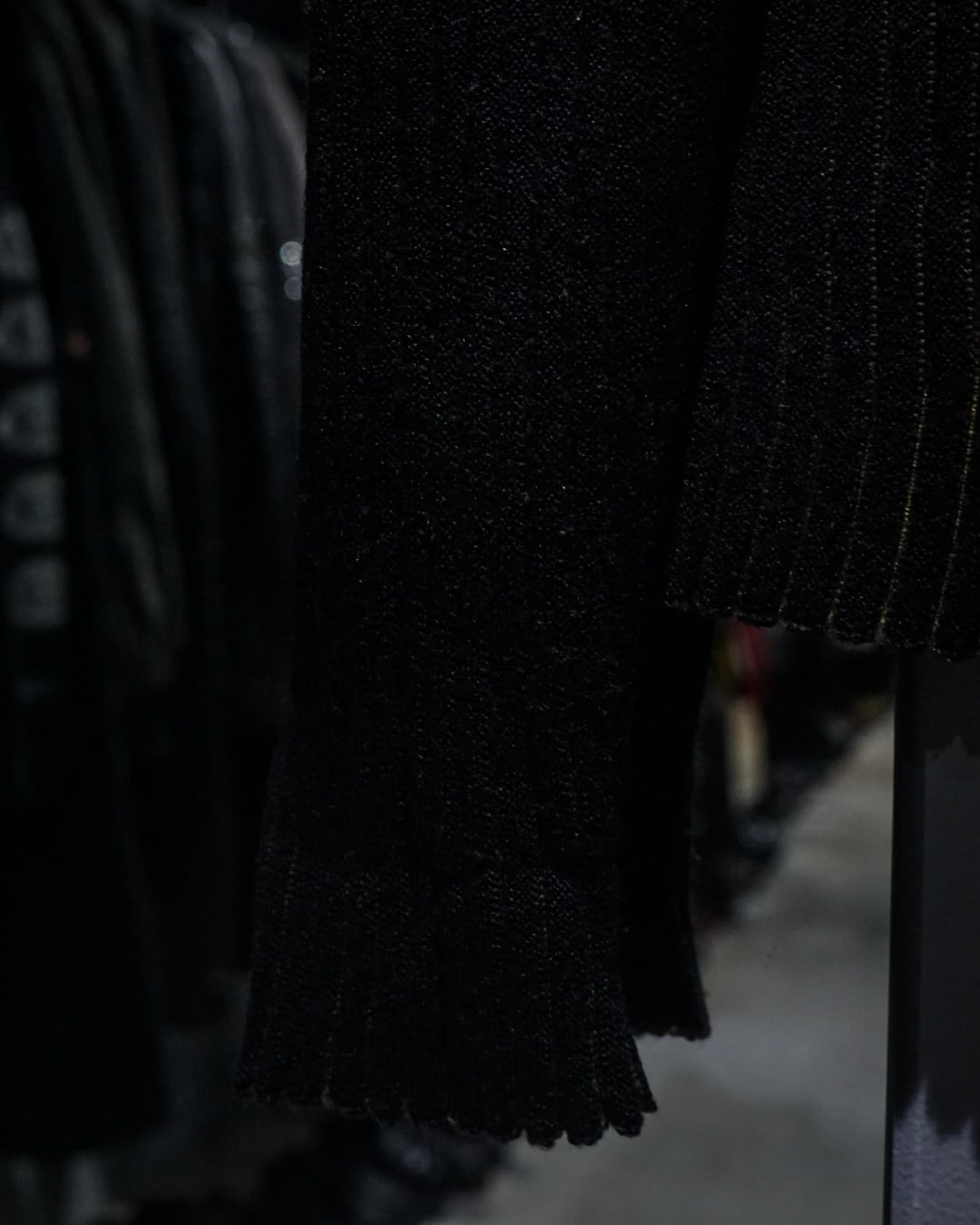 首元は立ち上がりのあるモックネック仕様で、ミニマルなデザインながら存在感のある佇まい。ボディはリブ編みで構成され、自然な伸縮性と柔らかなフィット感を実現しています。