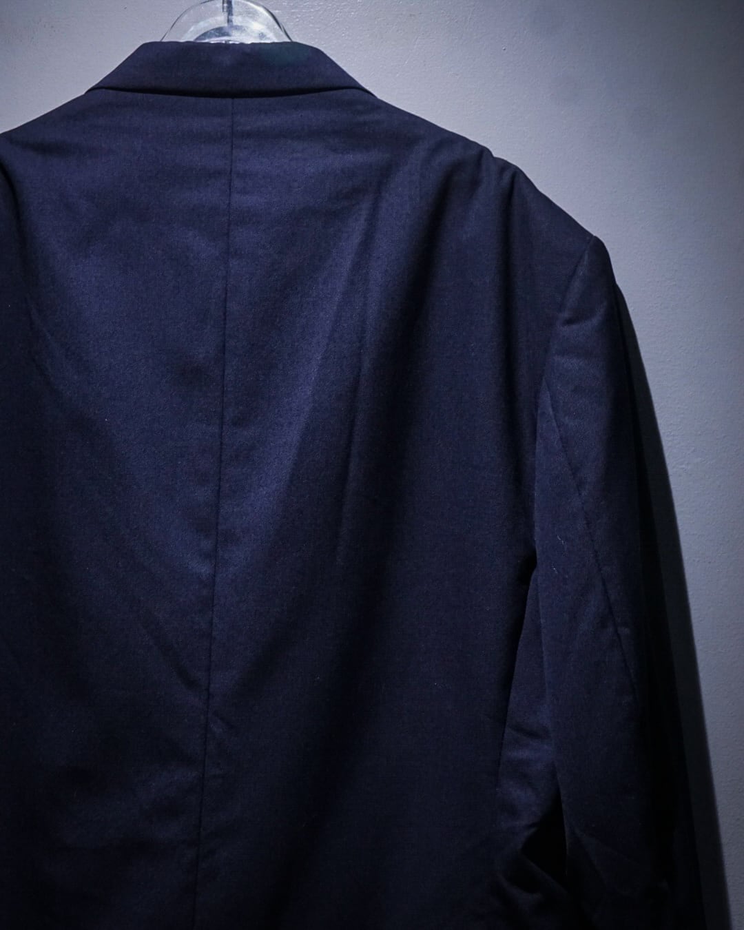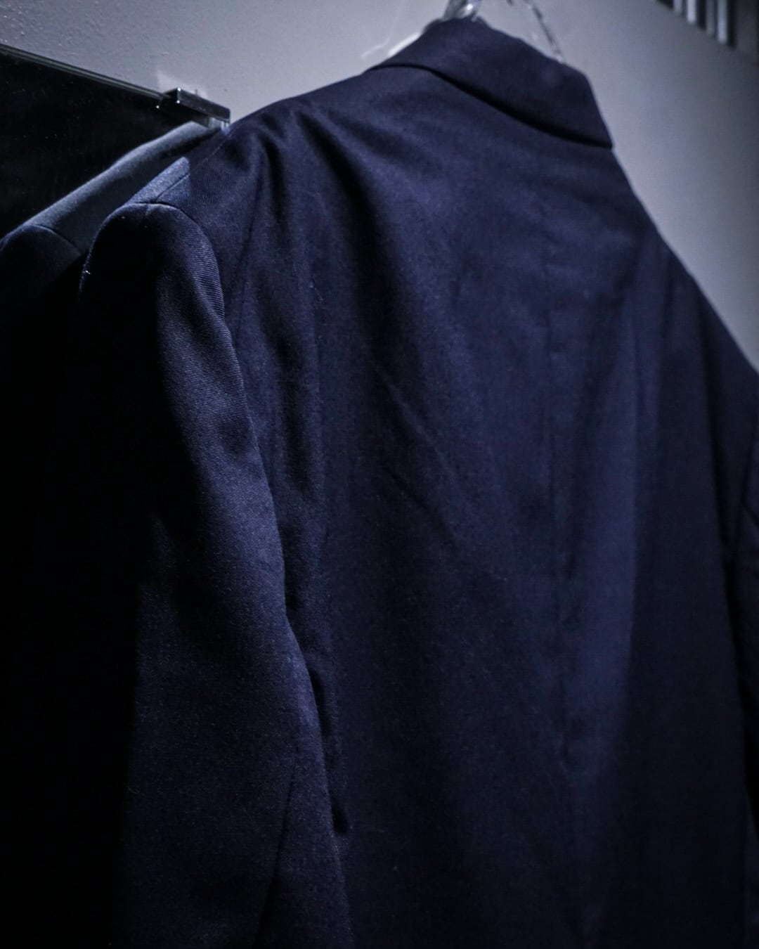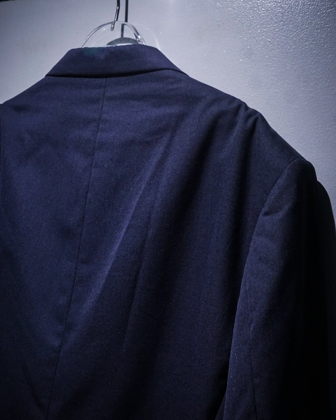 深みのあるネイビーカラーの生地は、ほのかに光沢を帯びた上質な風合い。力強いショルダーラインとワイドなピークドラペルが印象的で、端正な佇まいに仕上げられています。