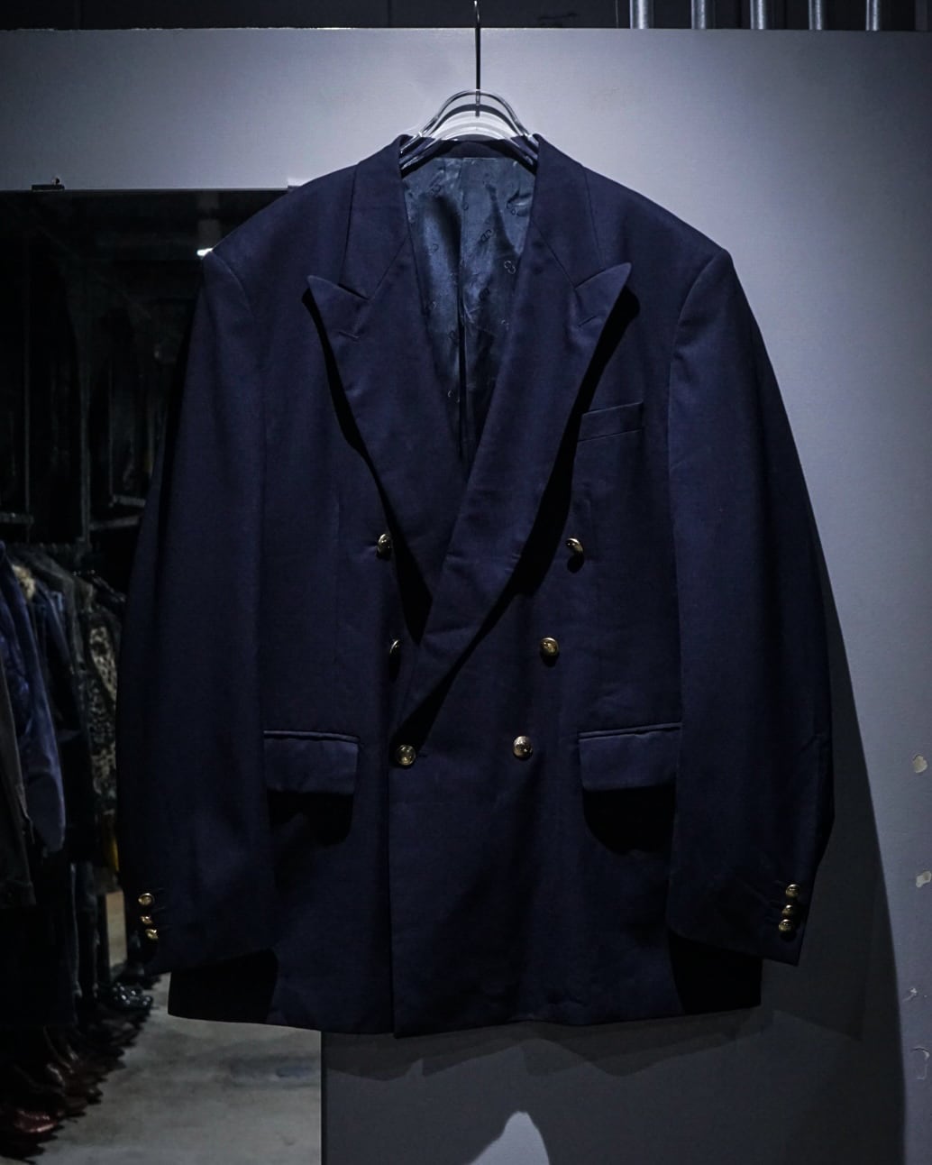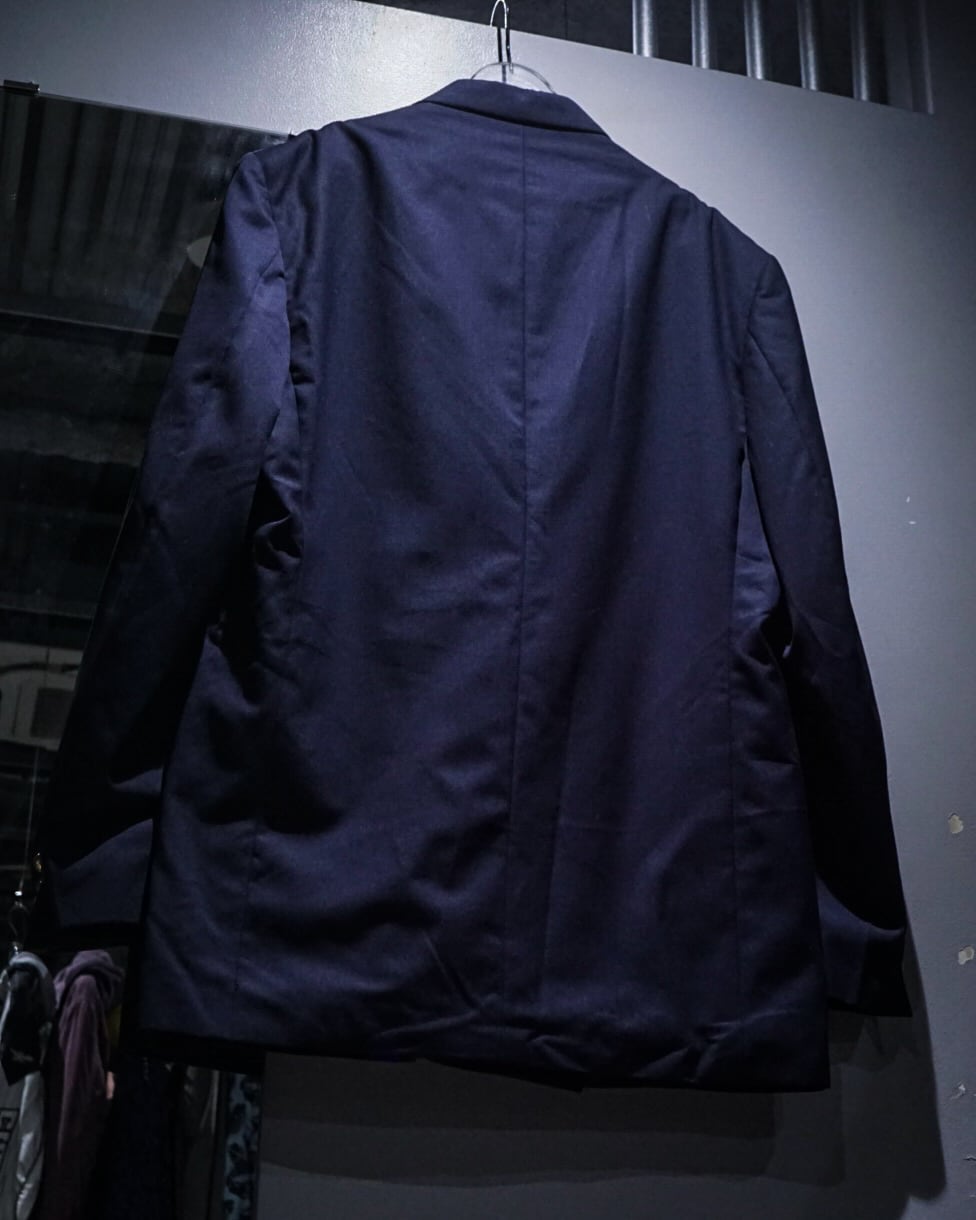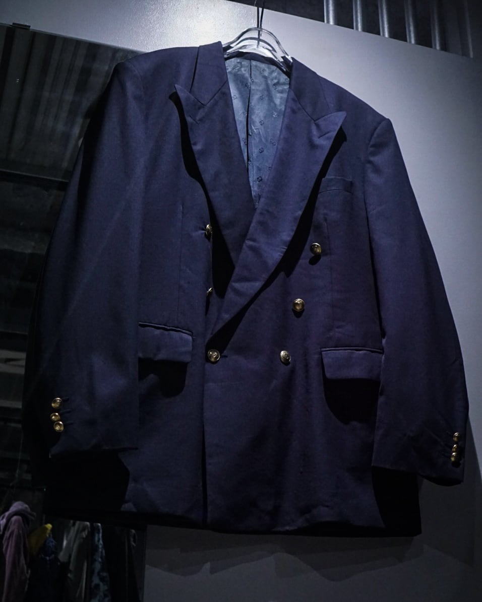 深みのあるネイビーカラーの生地は、ほのかに光沢を帯びた上質な風合い。力強いショルダーラインとワイドなピークドラペルが印象的で、端正な佇まいに仕上げられています。