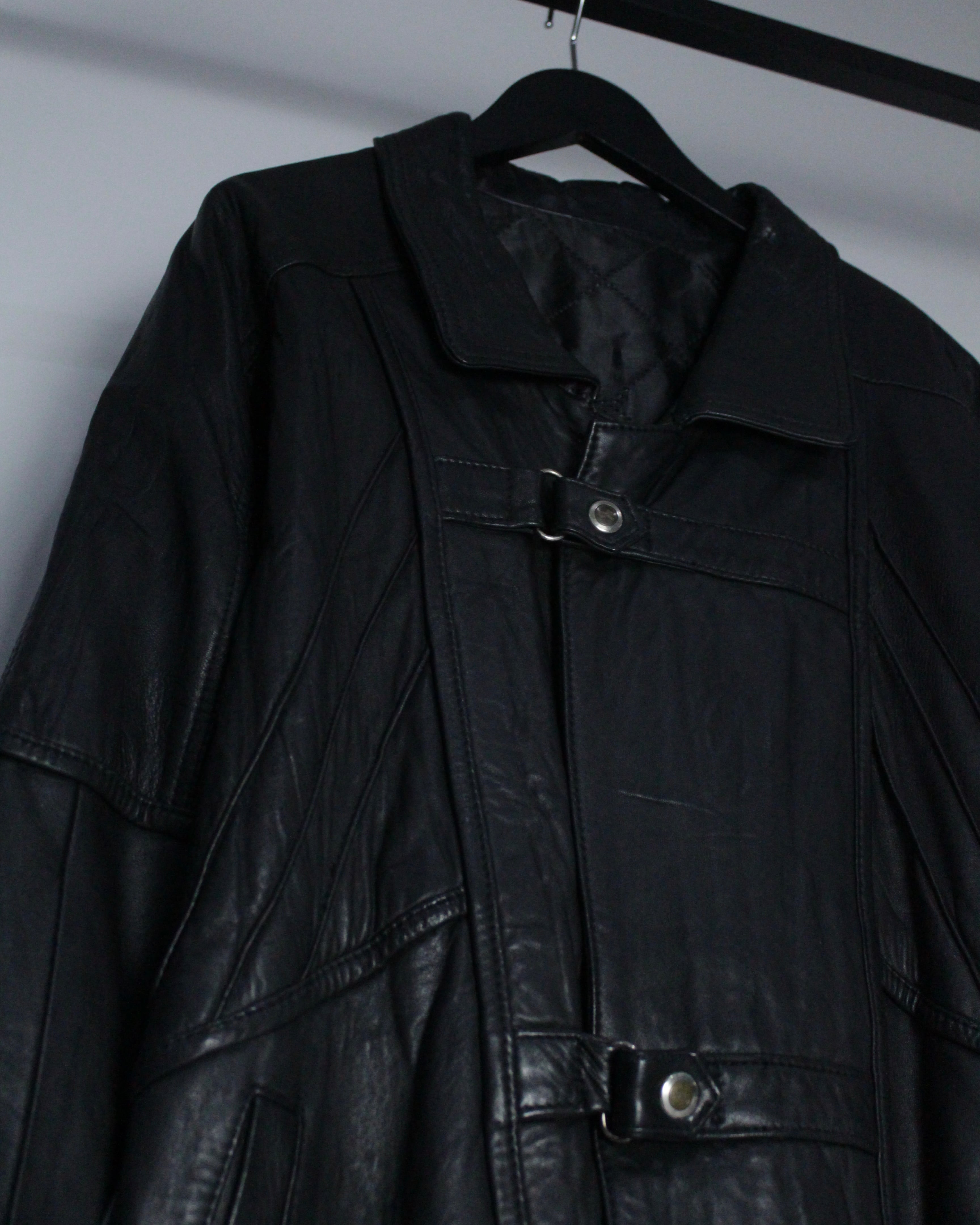肩から袖にかけて大きく取られたドルマンスリーブが特徴で、丸みを帯びた独特のシルエットが体を包み込み、レザーの重厚感に対して抜けのあるシルエットが◎