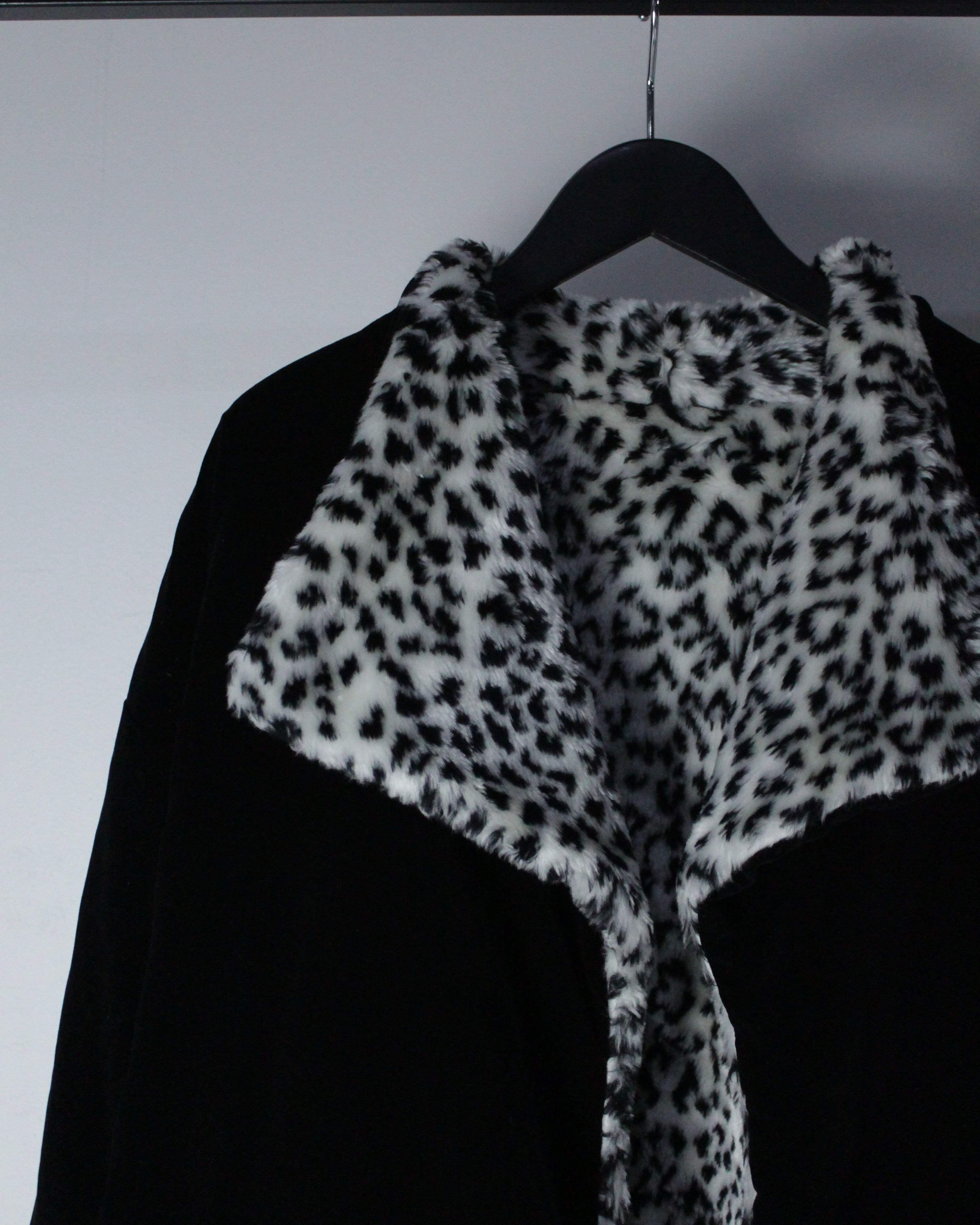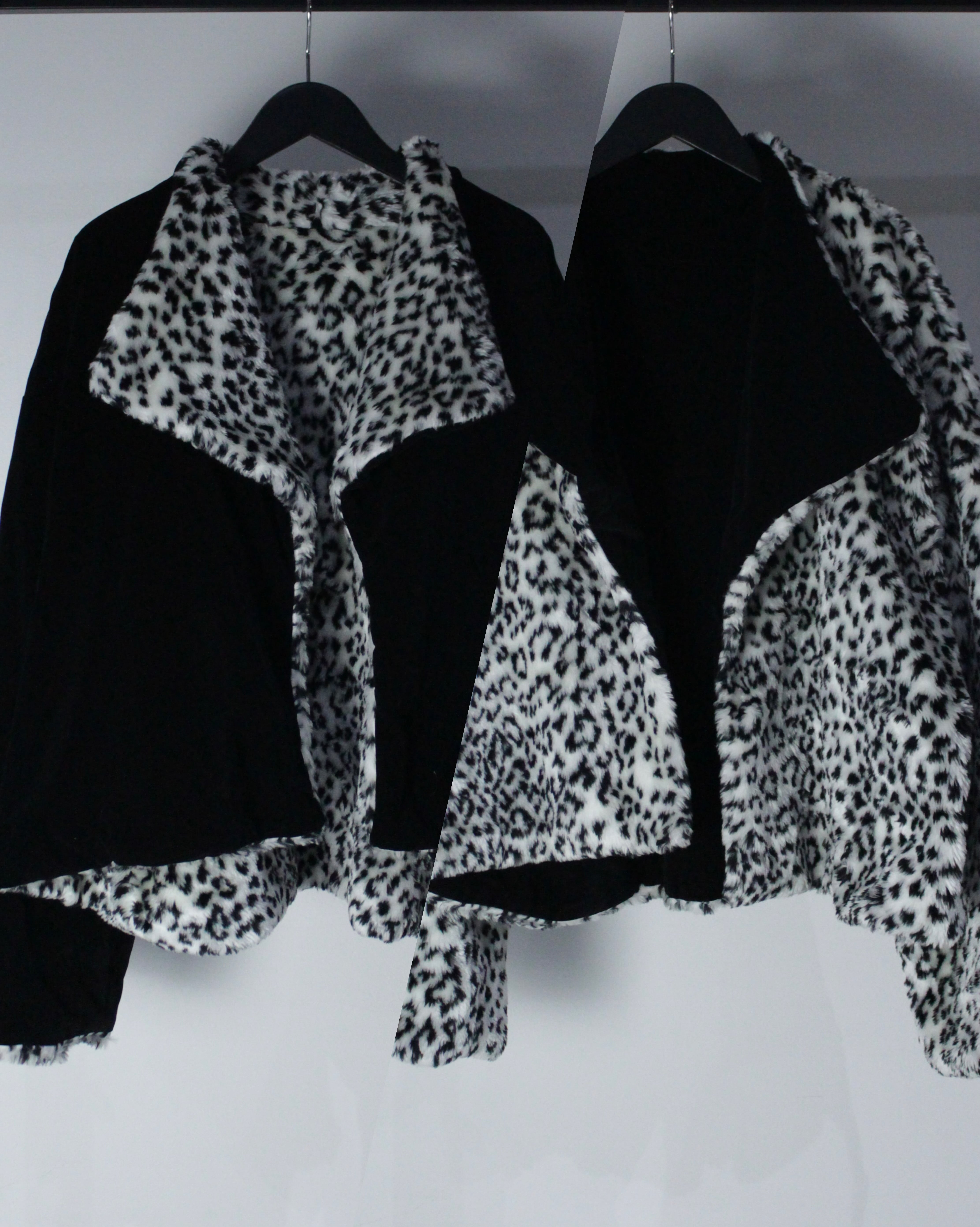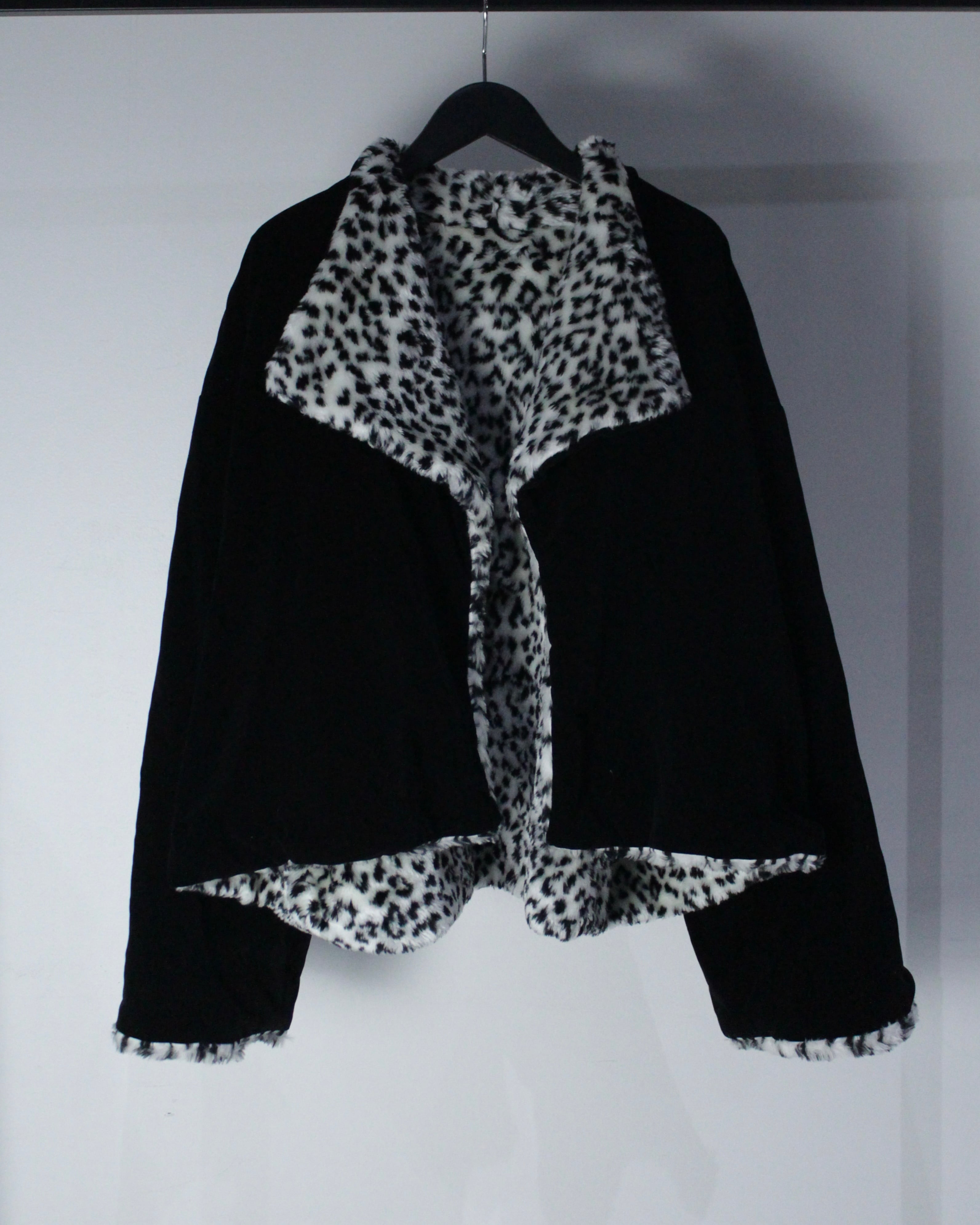 モノトーンのレオパードフェイクファーと、光沢を抑えたブラックベルベットを組み合わせたリバーシブル仕様のジャケット。