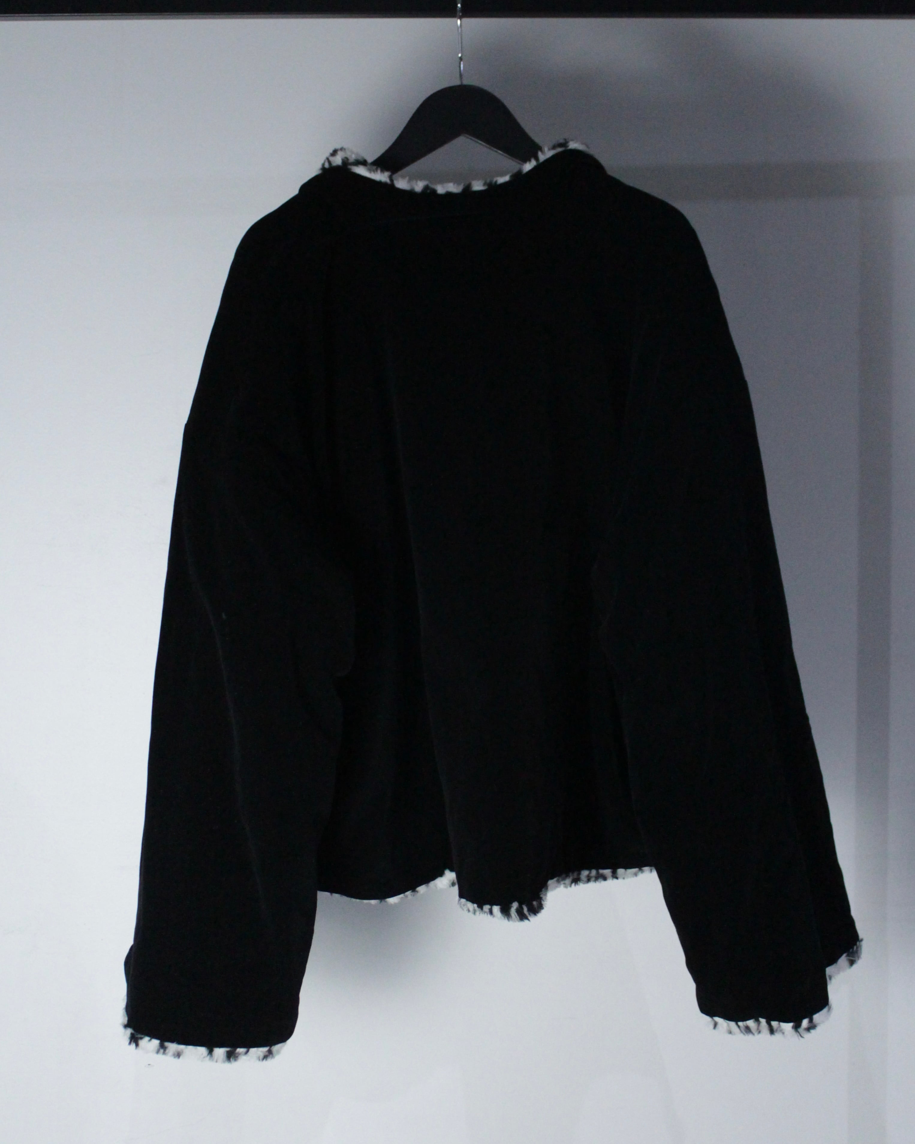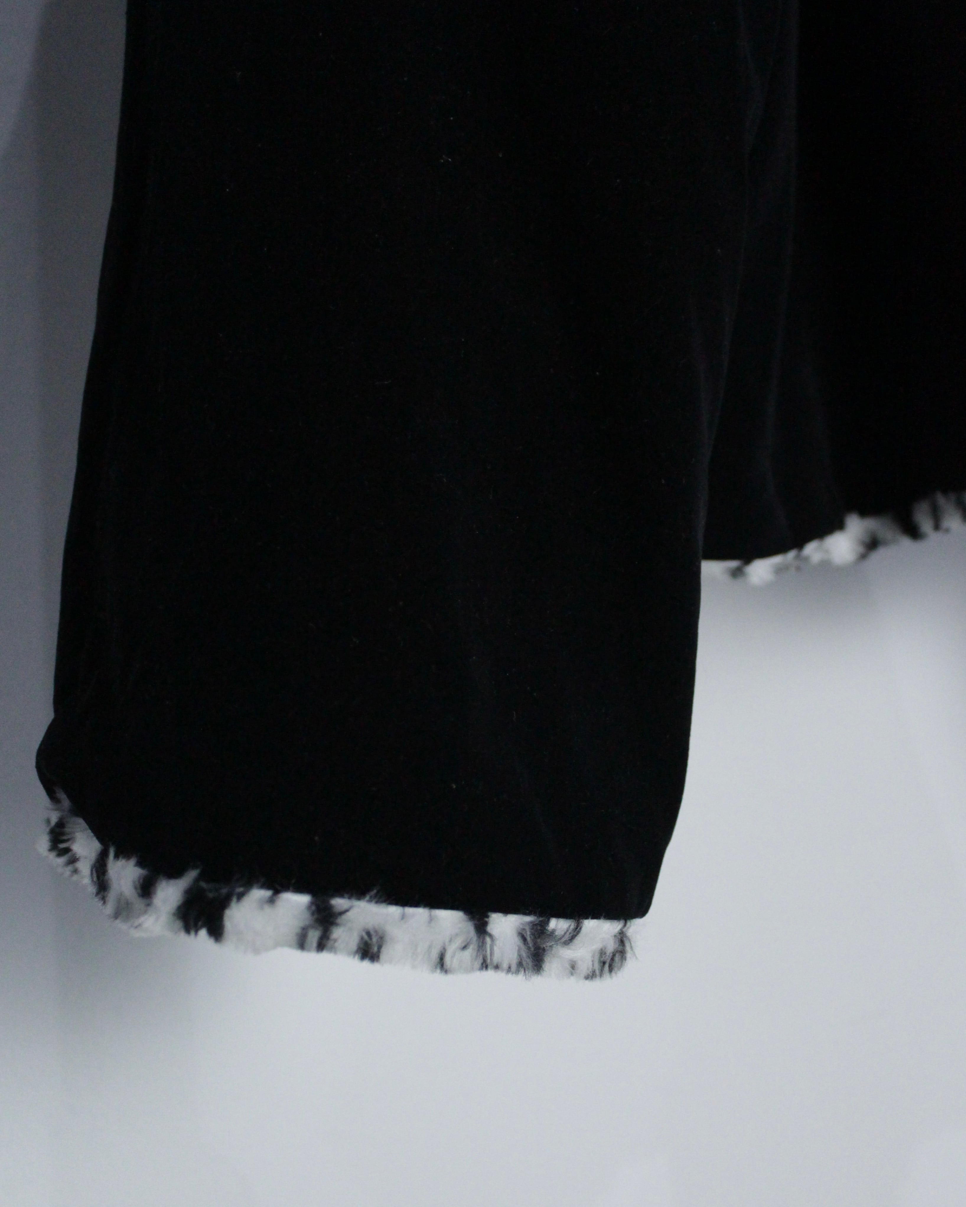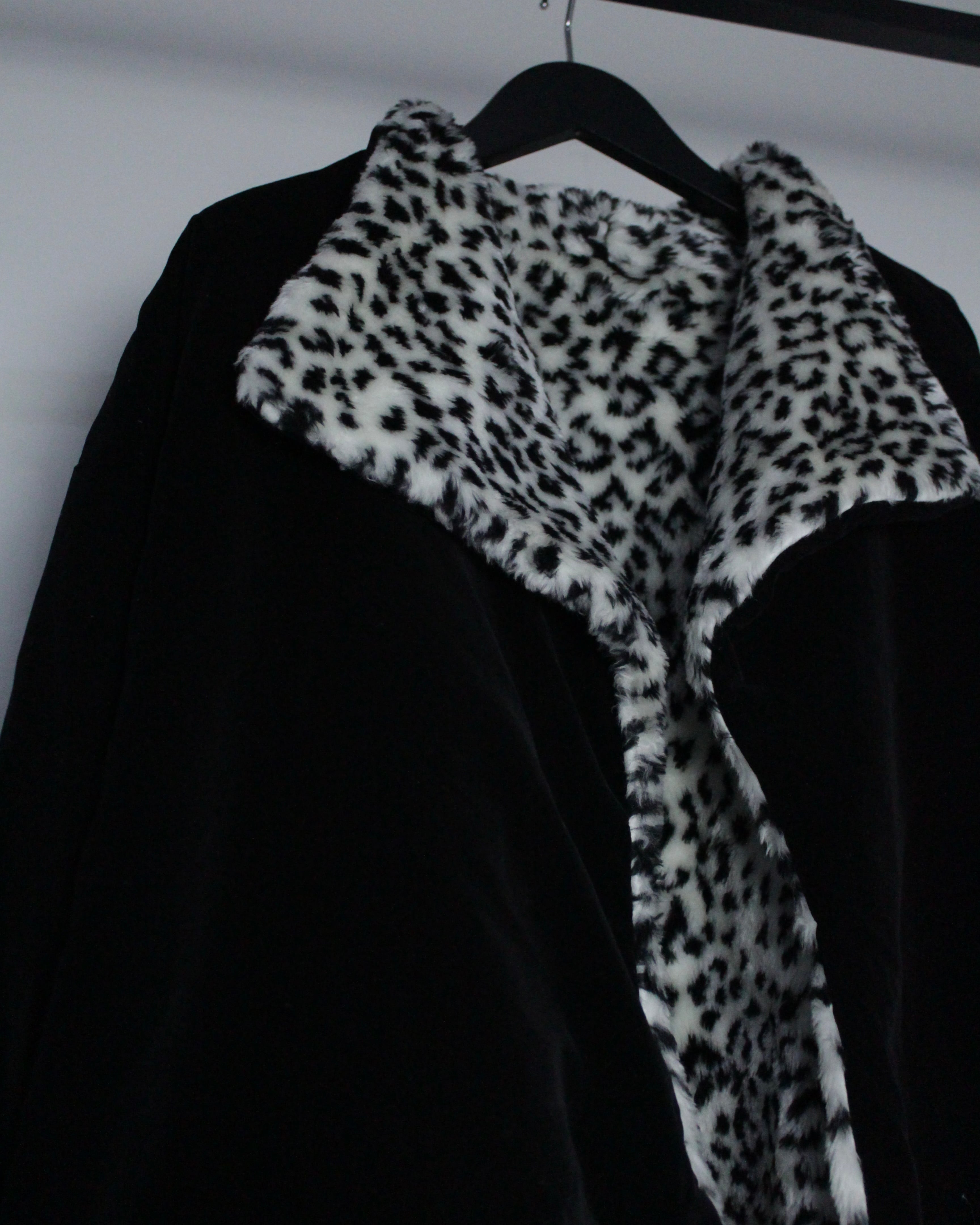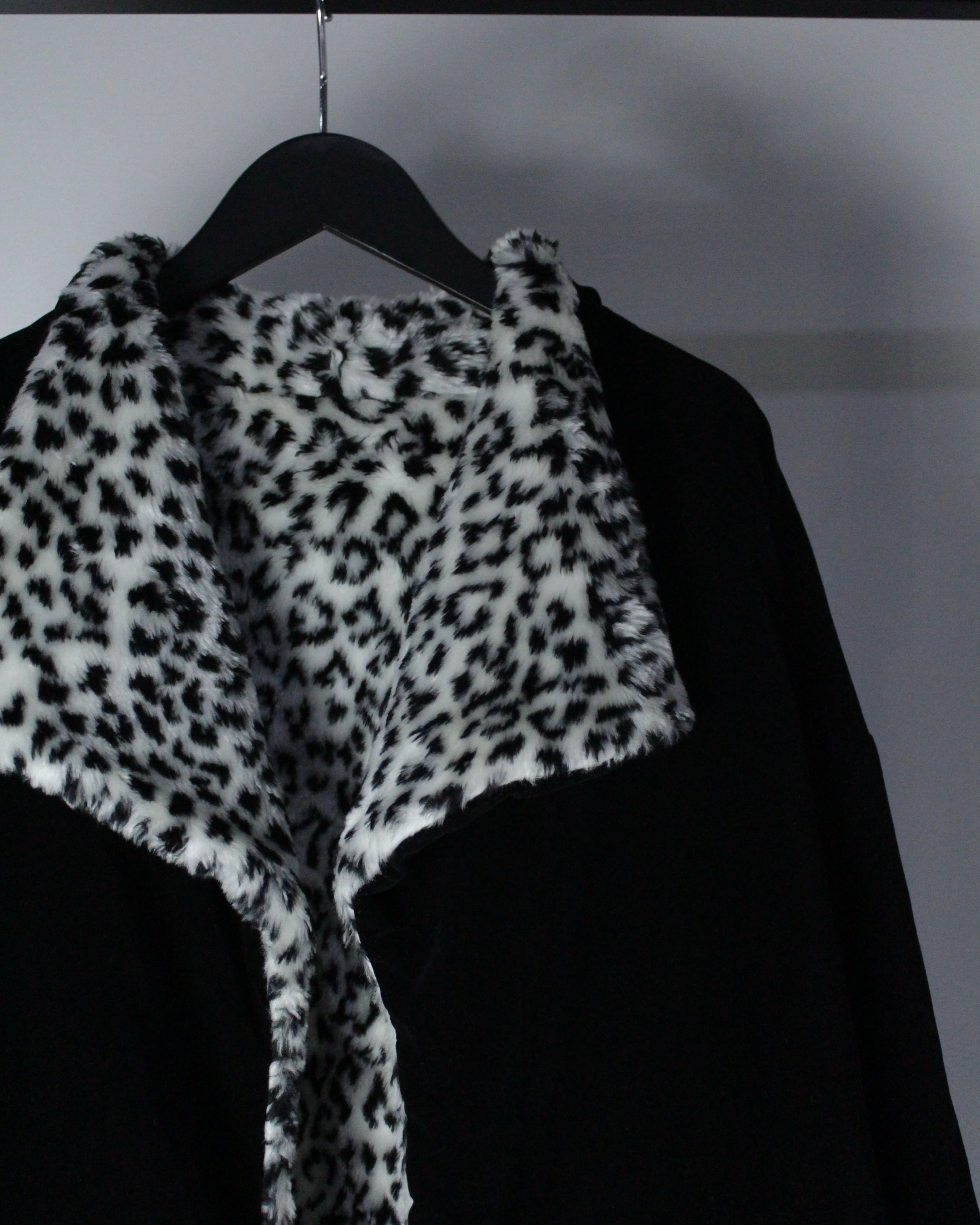 モノトーンのレオパードフェイクファーと、光沢を抑えたブラックベルベットを組み合わせたリバーシブル仕様のジャケット。