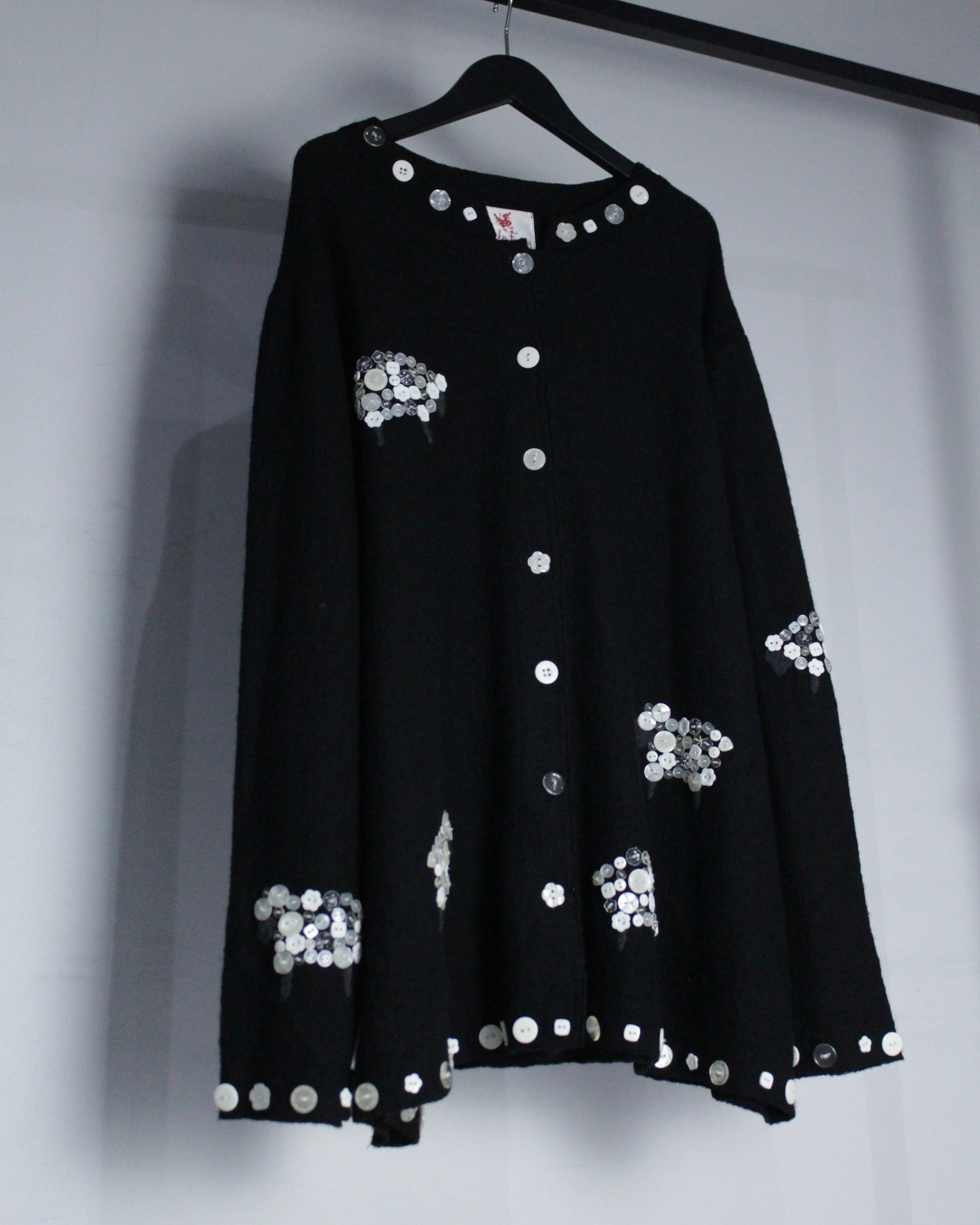 遊び心とクラフト感が見事にマッチしたボタンで装飾を施したウールカーディガンをご紹介いたします。
