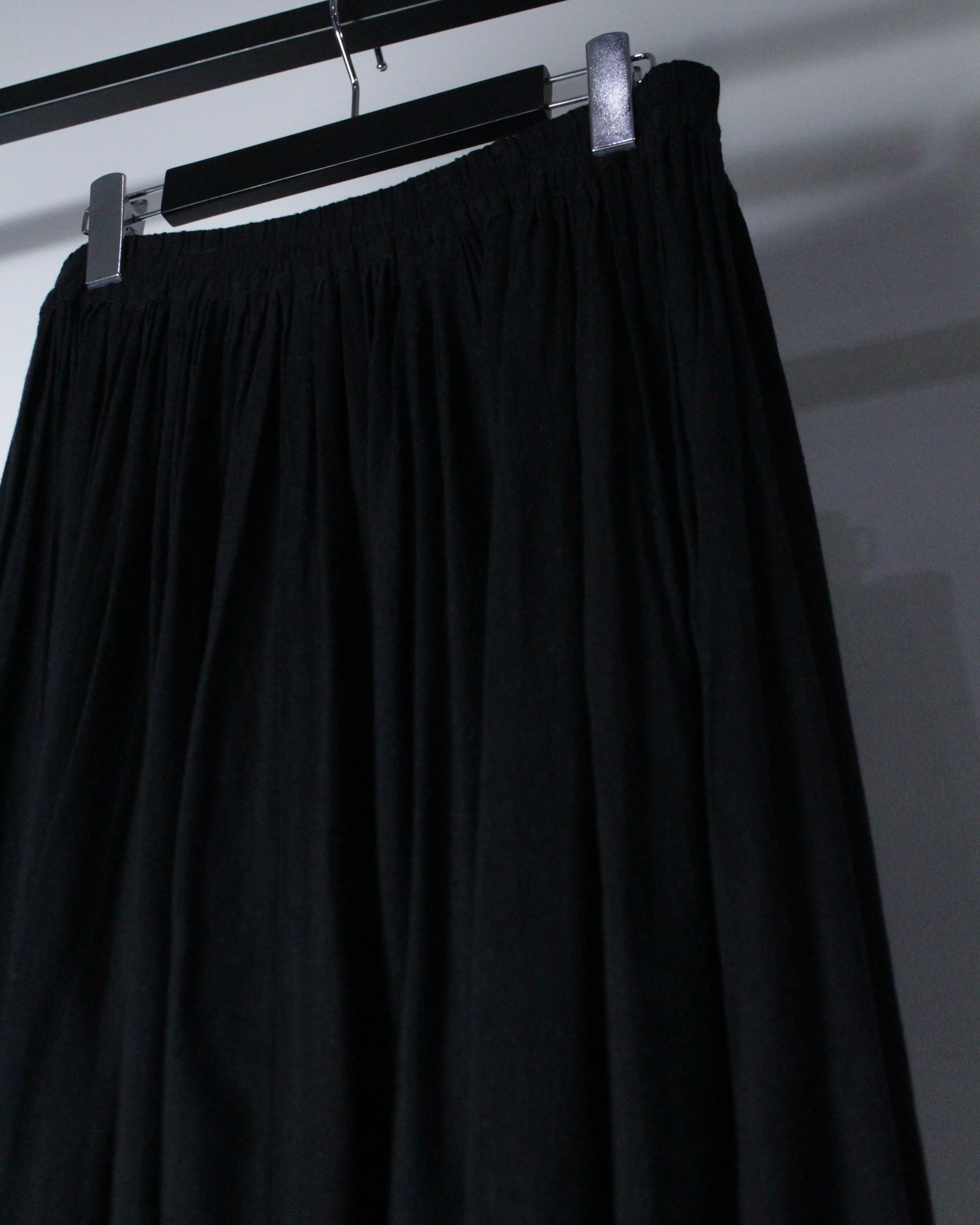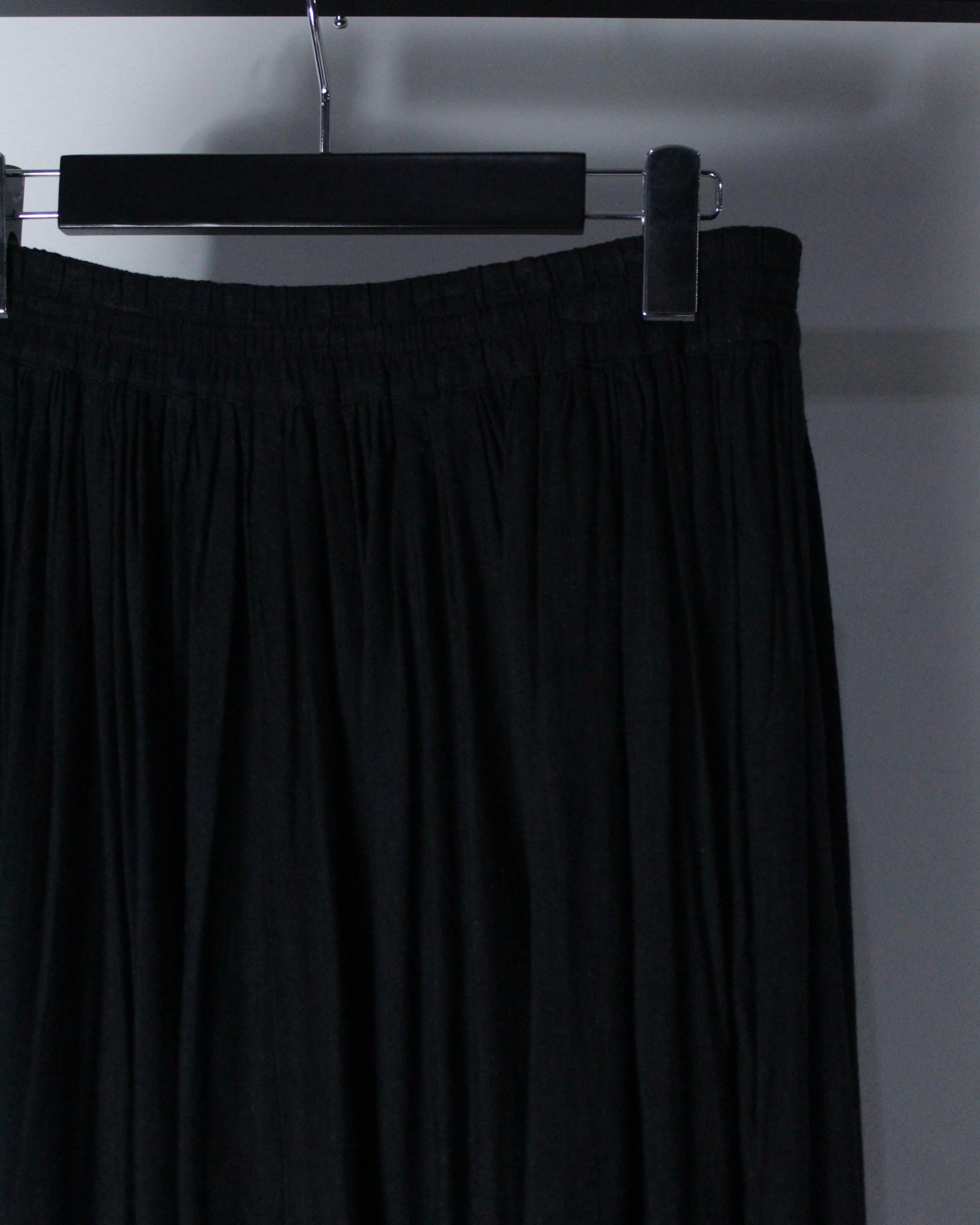 全体にたっぷりとギャザーを寄せ、柔らかなドレープを描くロングスカート。