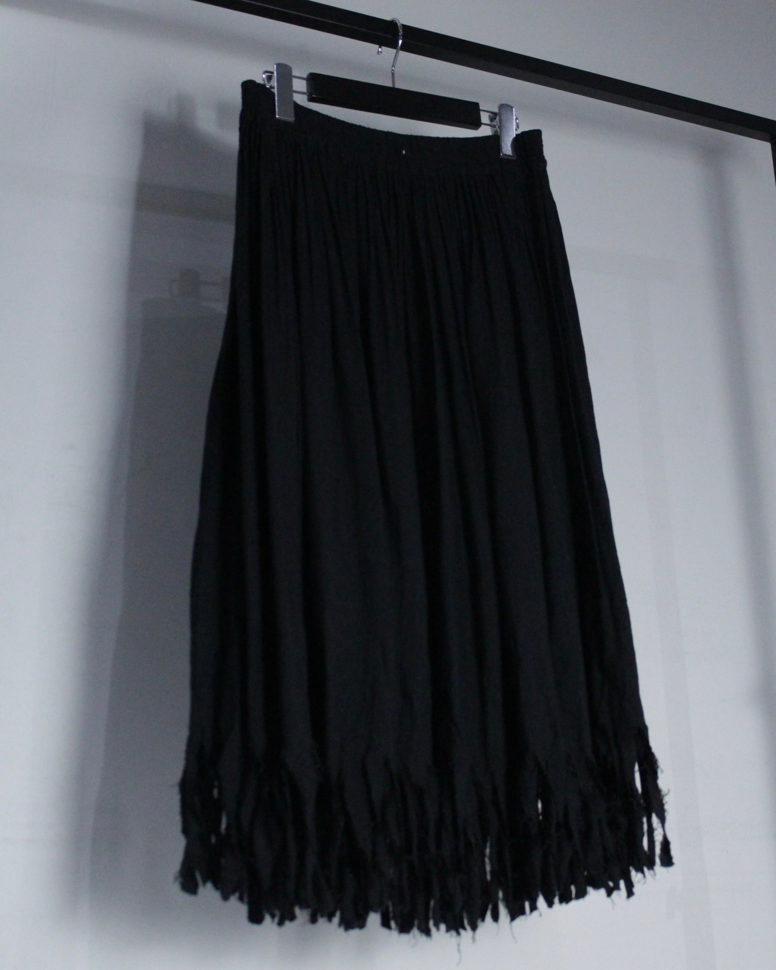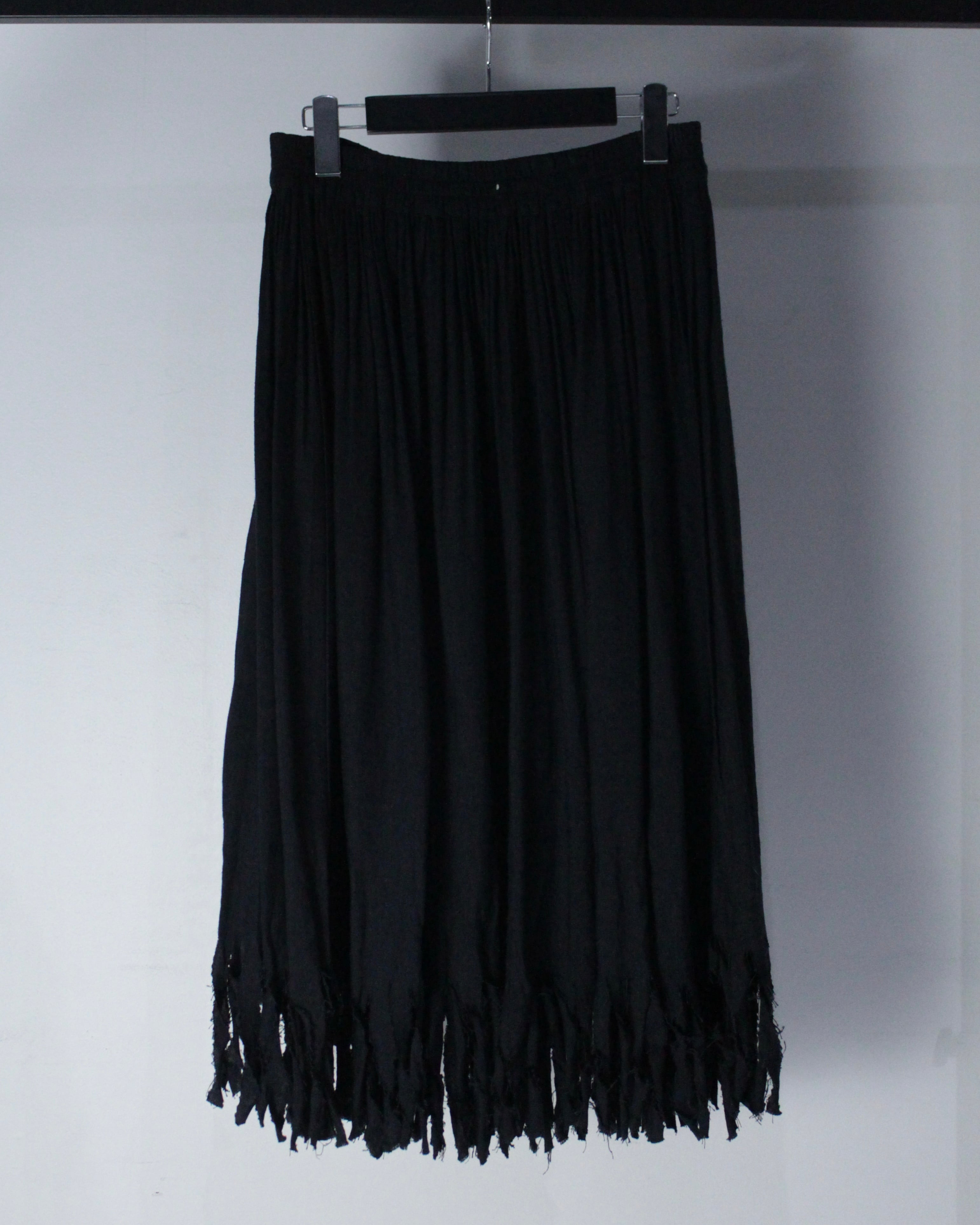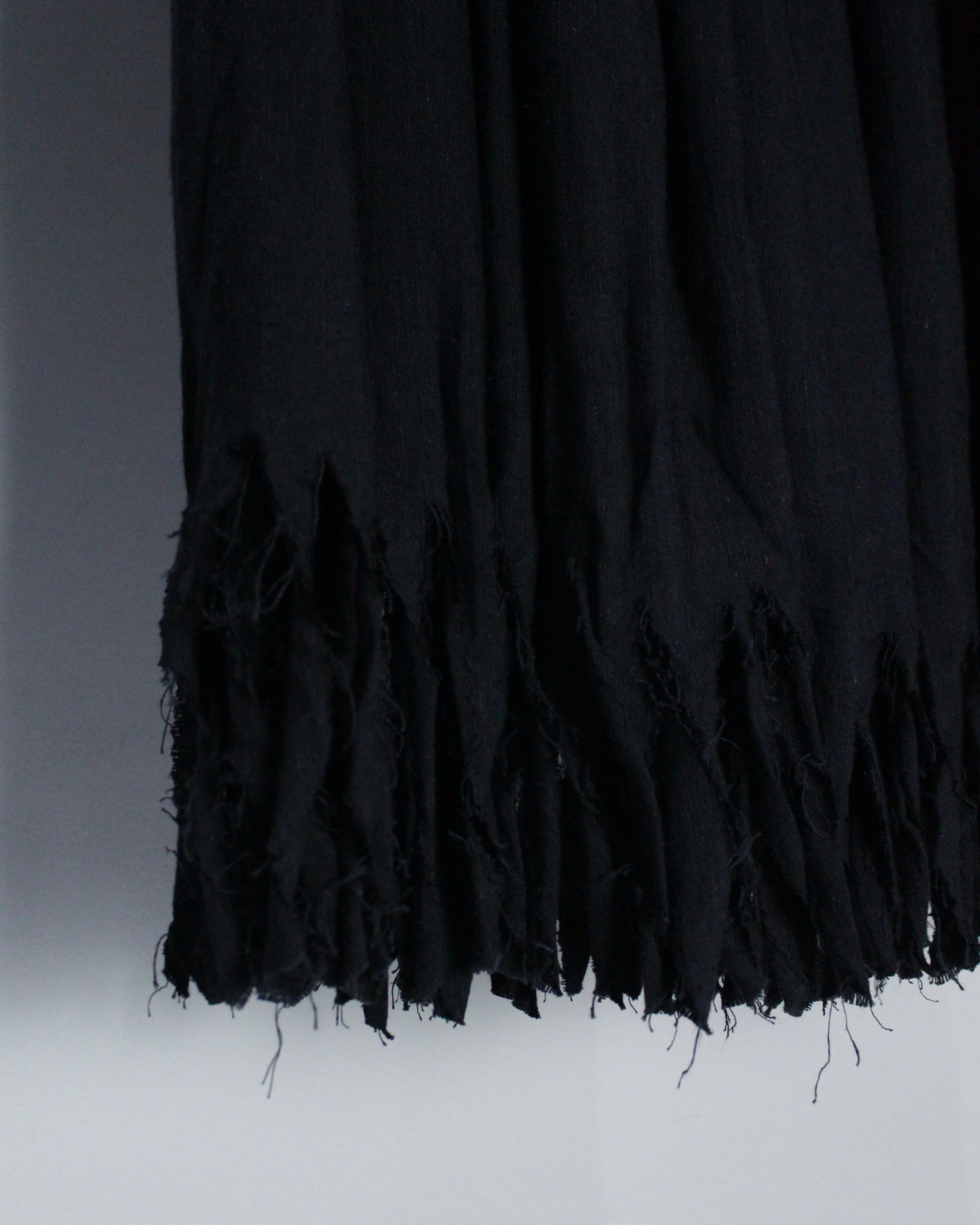 ブラックのワントーンながらも、裾に向かって大胆にカットオフされたフリンジデザインが印象的で、オールブラックのボディに動きをもたらせています。