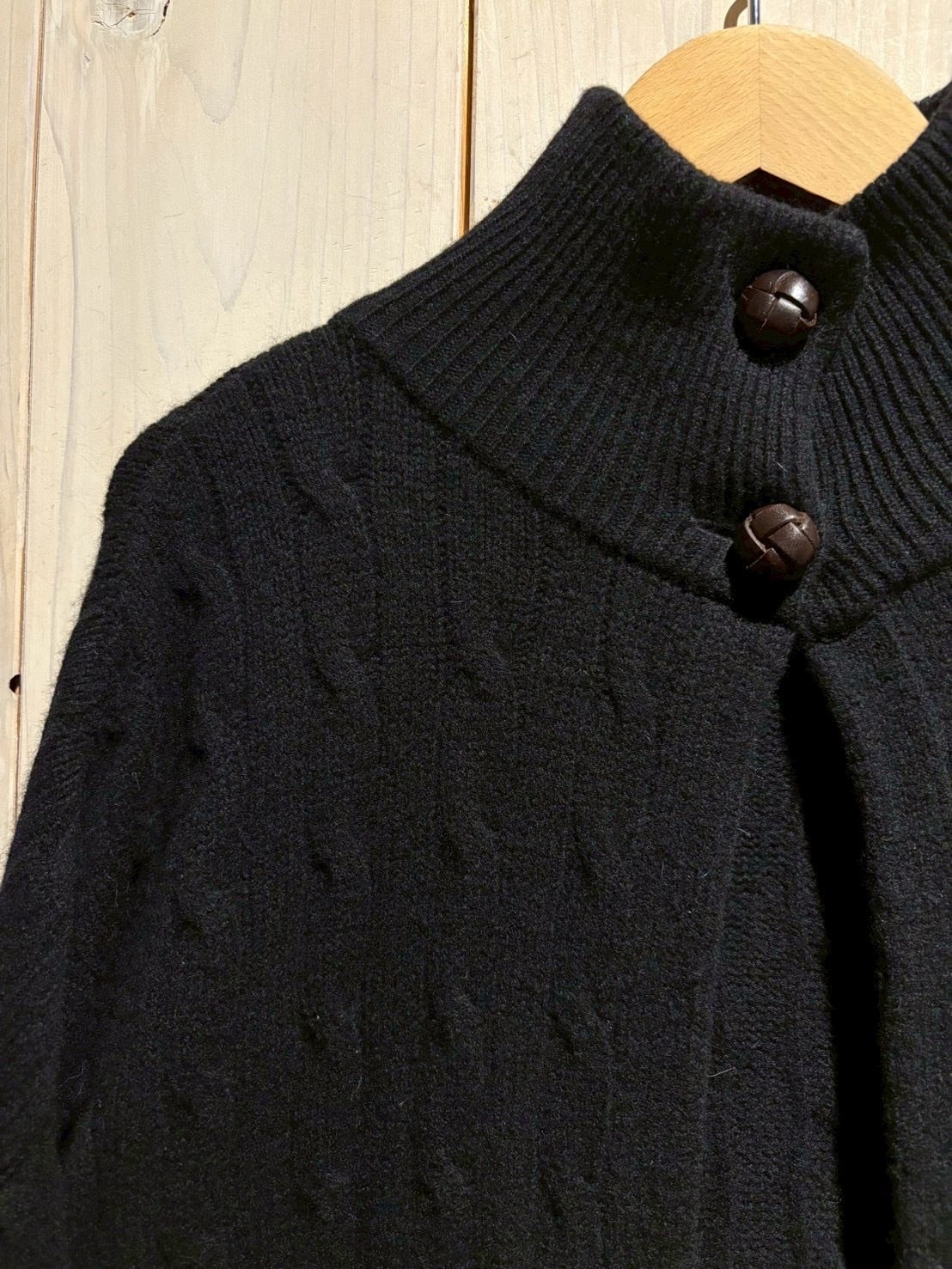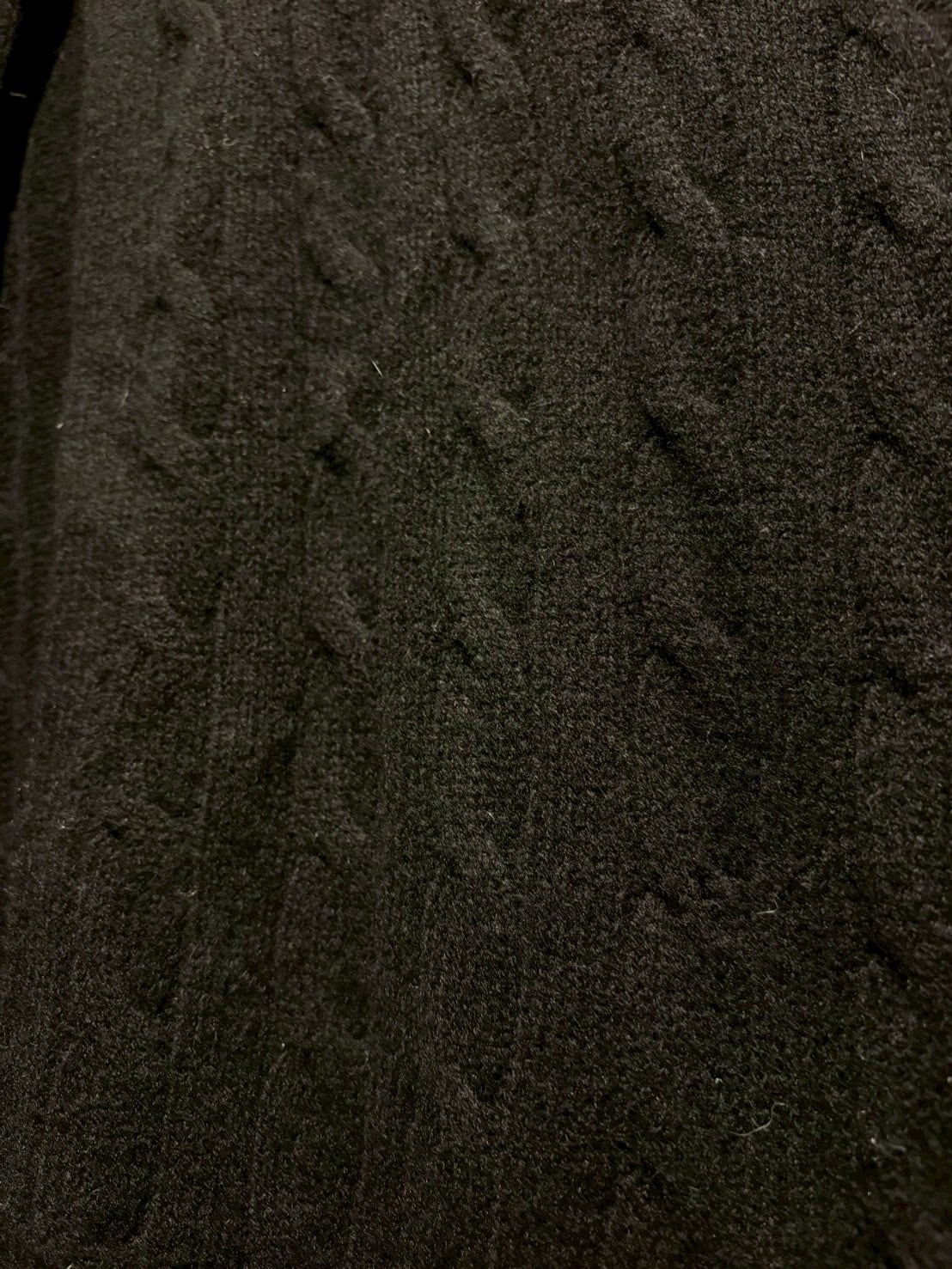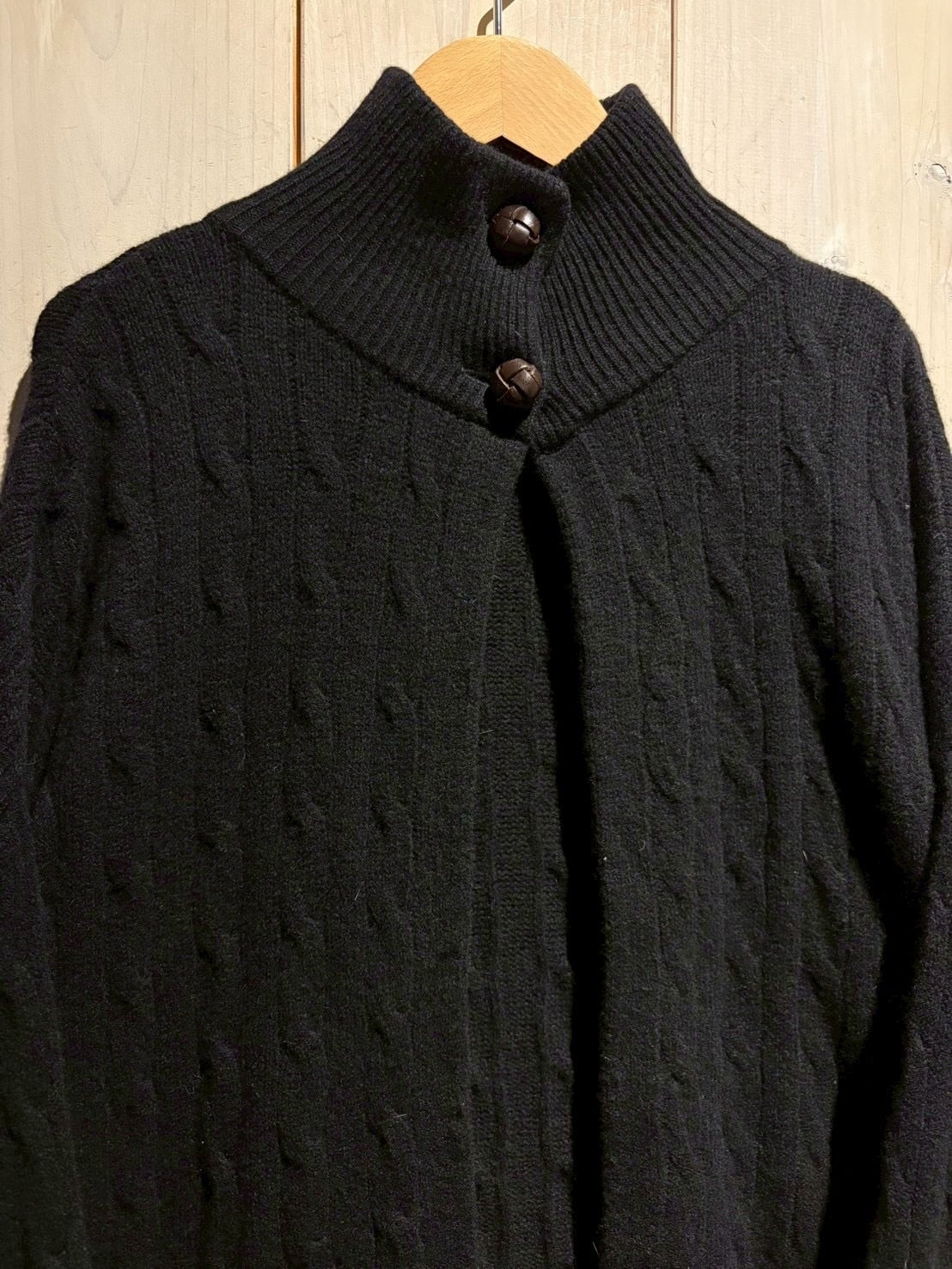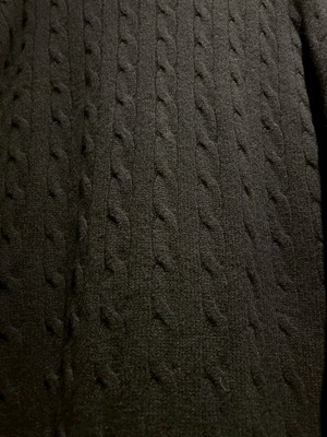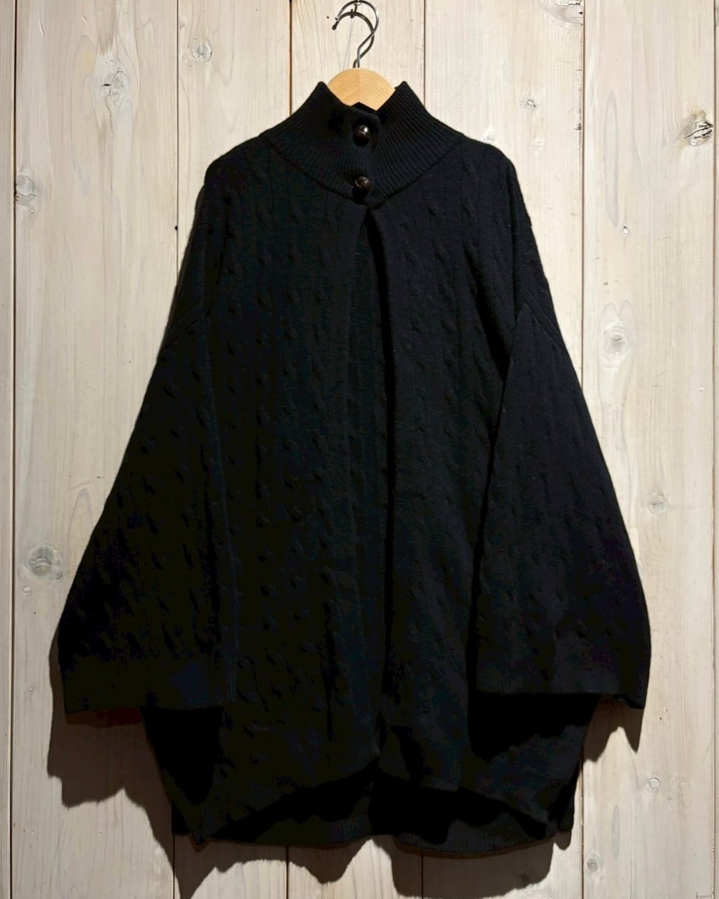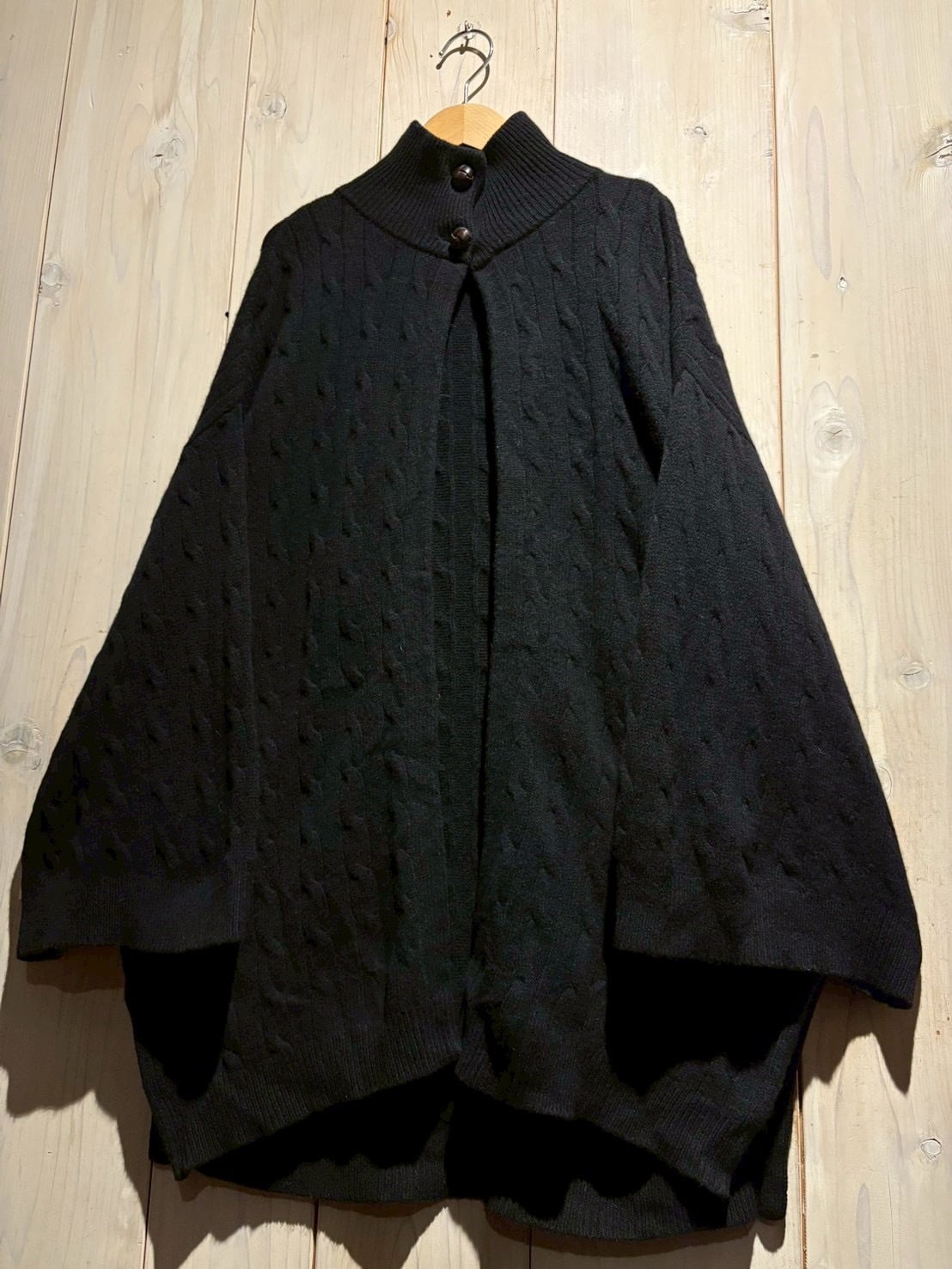 全体は緩やかなケーブル編みで構成され、程よい厚みとリラックスシルエットが特徴。インナーにシャツを重ねた上品なスタイルから、デニム合わせのカジュアルダウンまで幅広く対応。