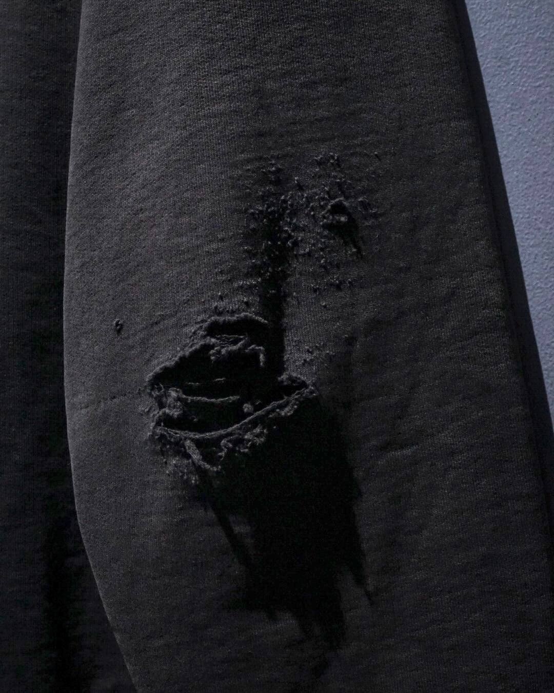 袖口やリブ、アーム部分には自然なほつれや破れが見られ、計算では出せないボロを演出。柔らかく馴染んだコットンボディが、抜け感のあるシルエットを生み出しています。