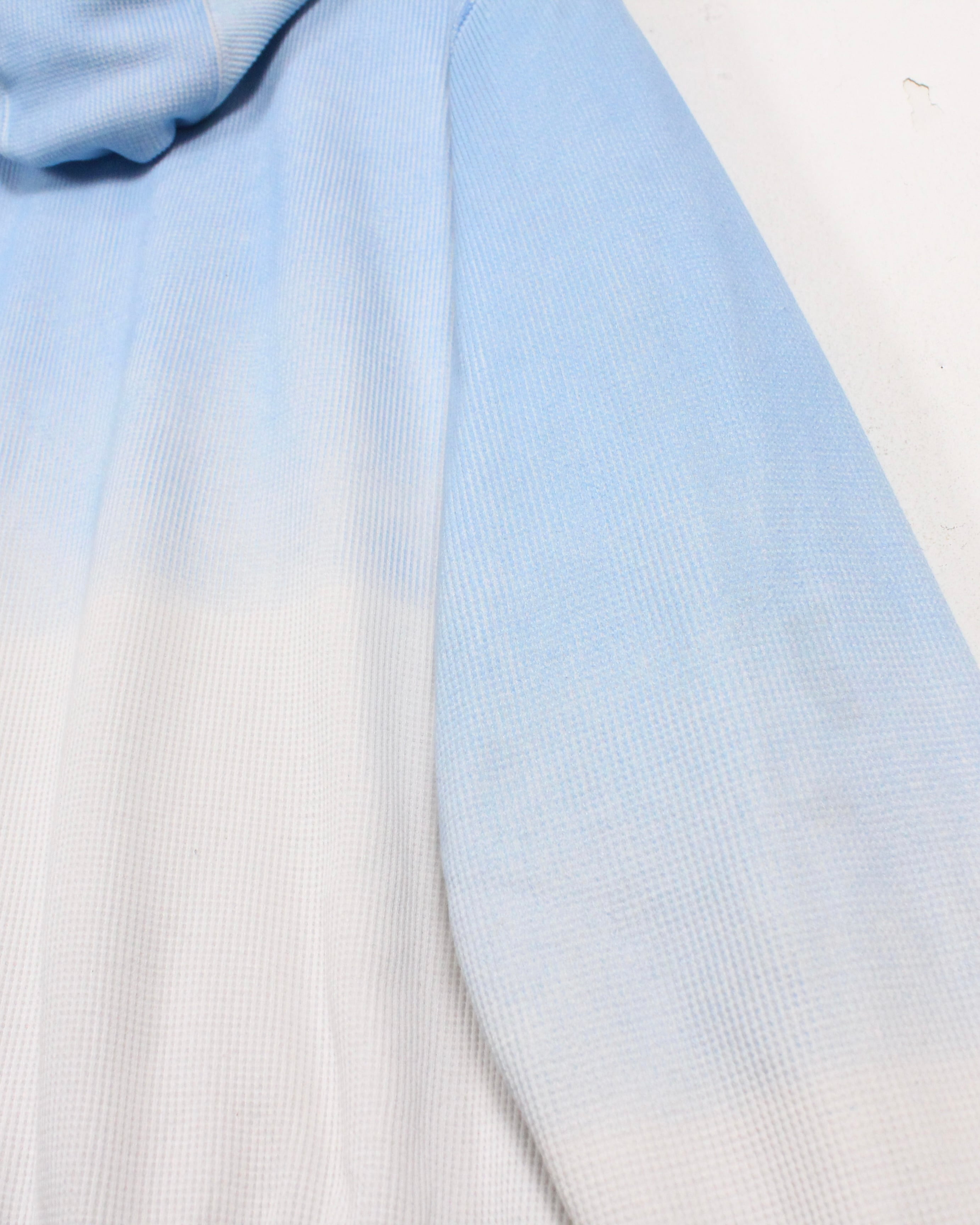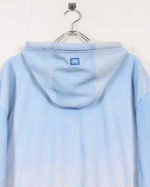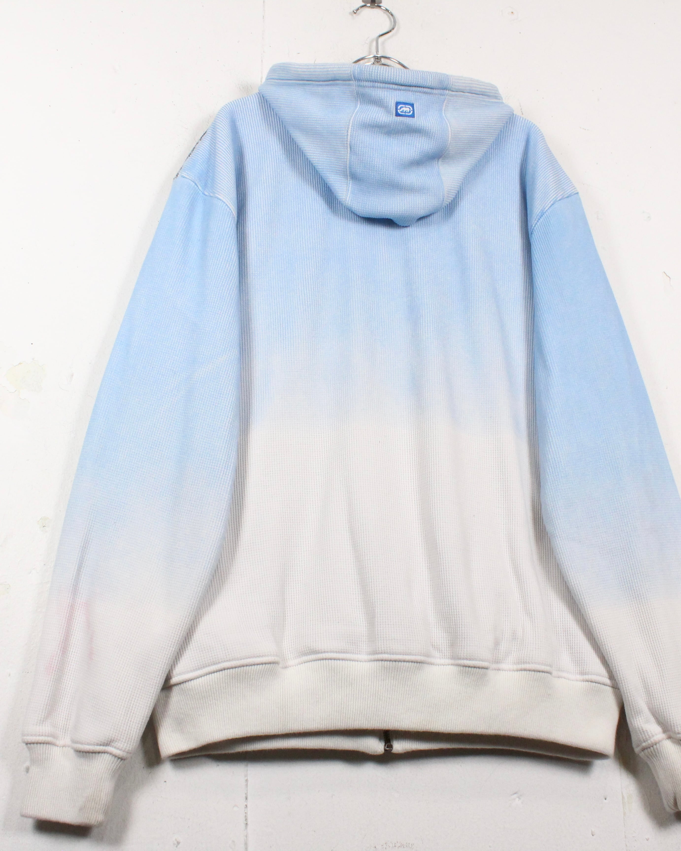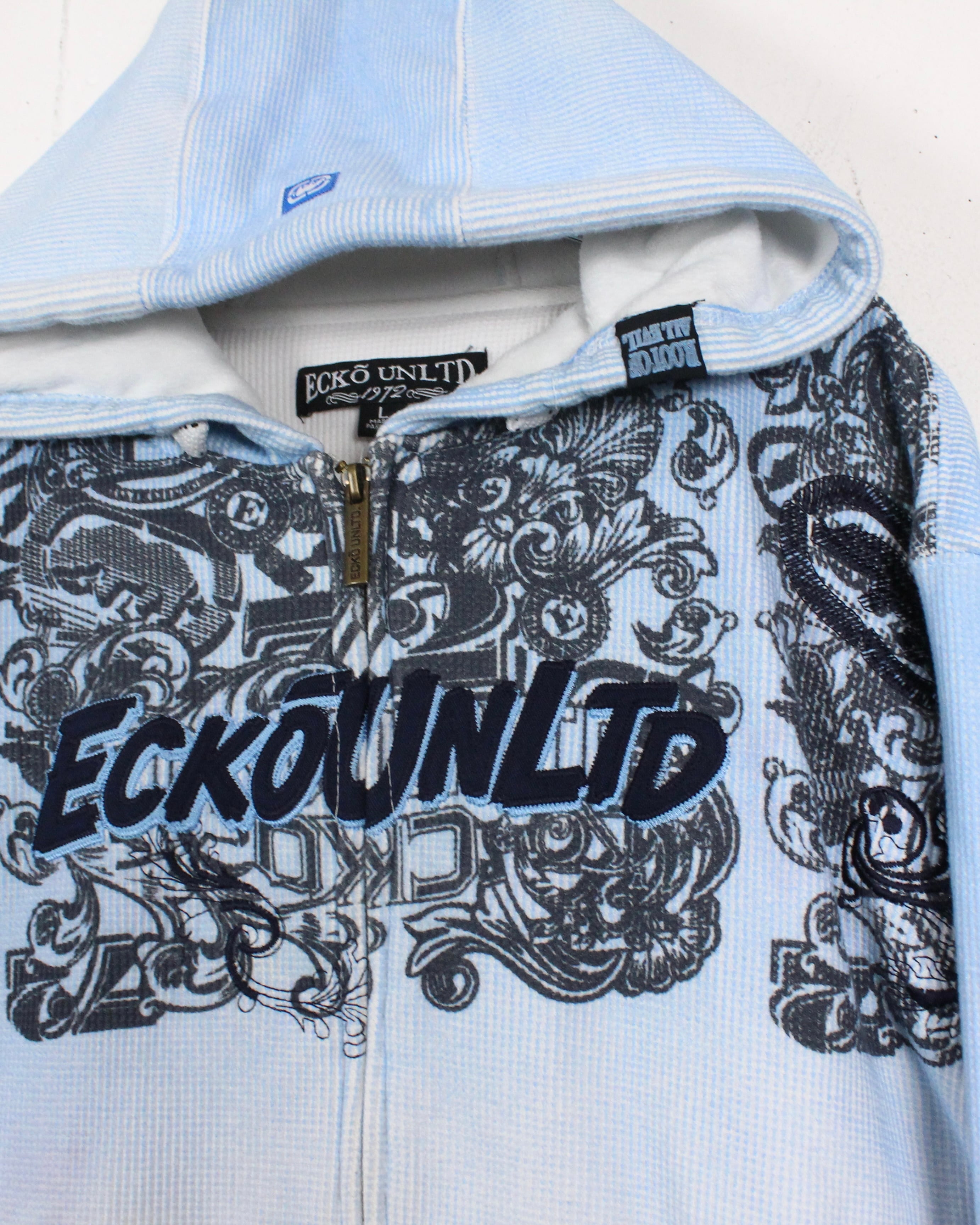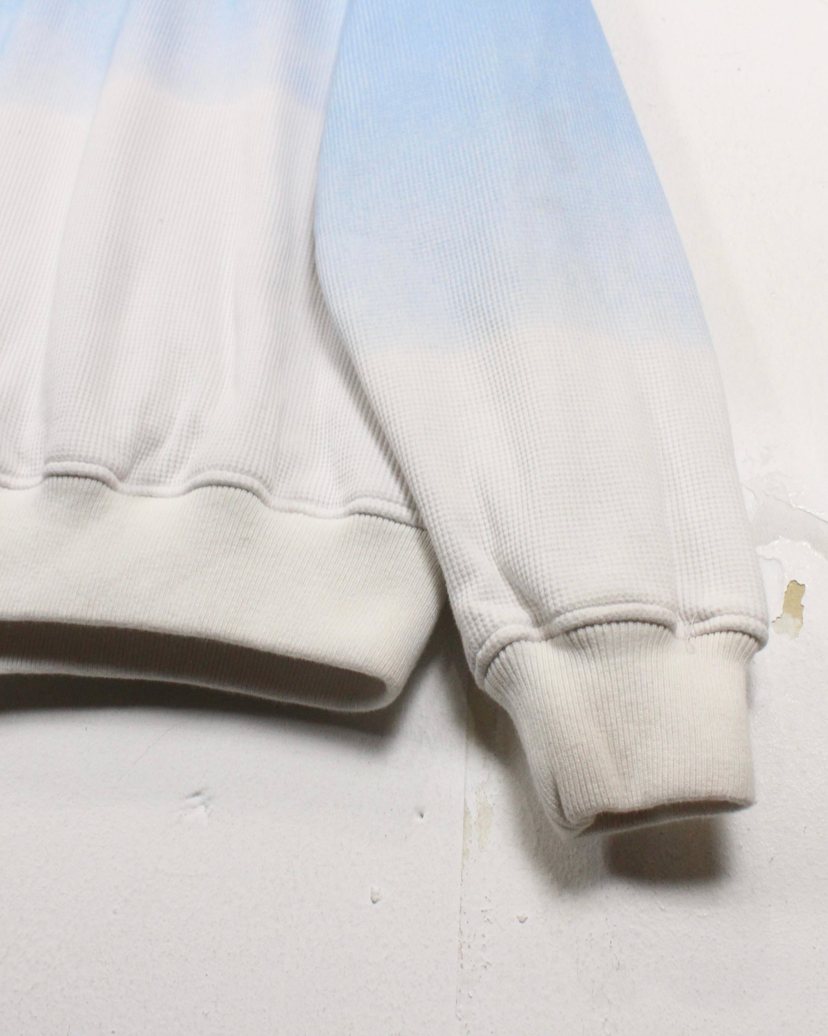 淡いブルー、ホワイトのグラデーションがかったサーマル地のボディをベースに、ゴシック風のグラフィックを大胆にレイアウトし、フロントにパッチと刺繍で施された立体的な“ECKŌ UNLTD”ロゴが載せられた1着。
