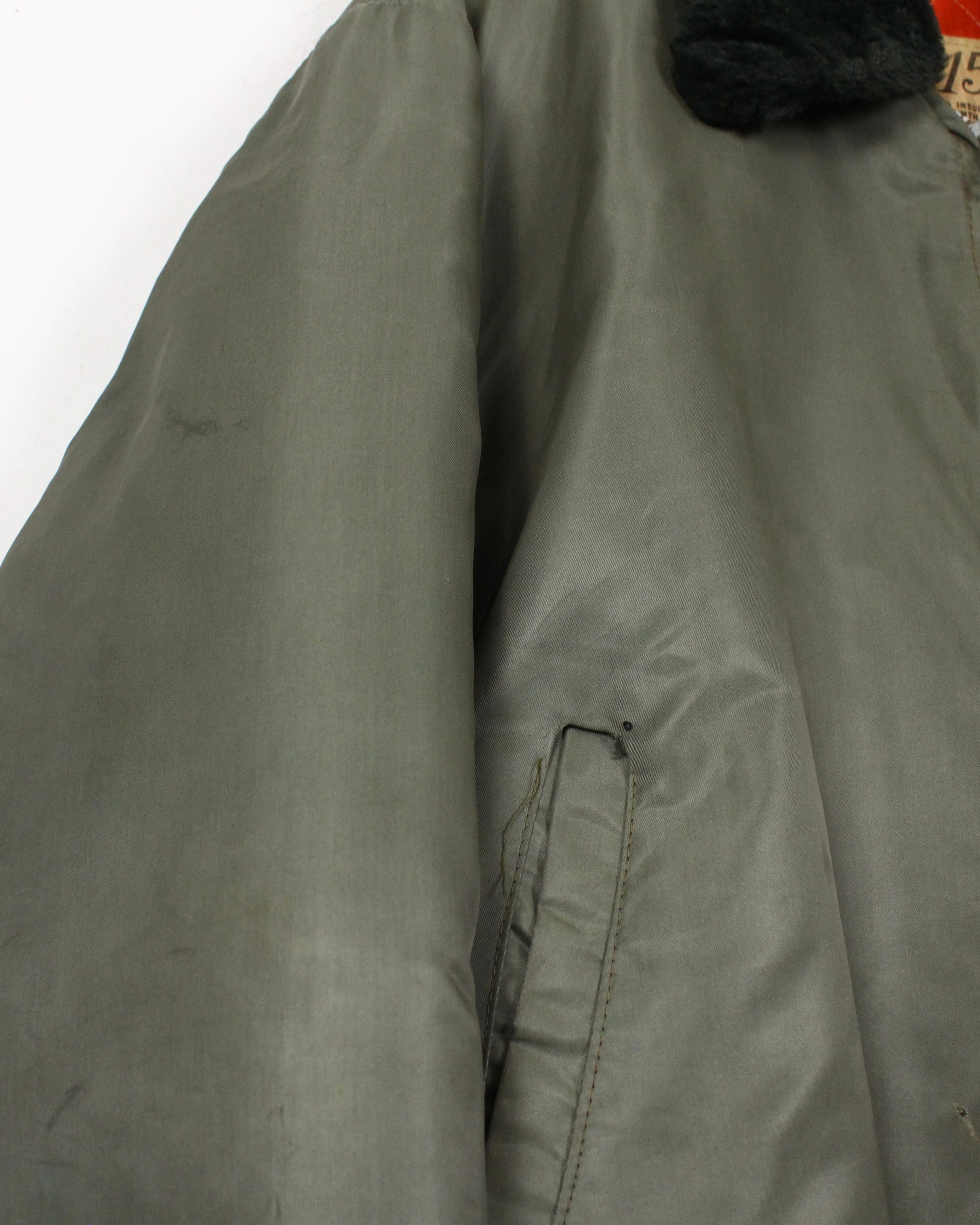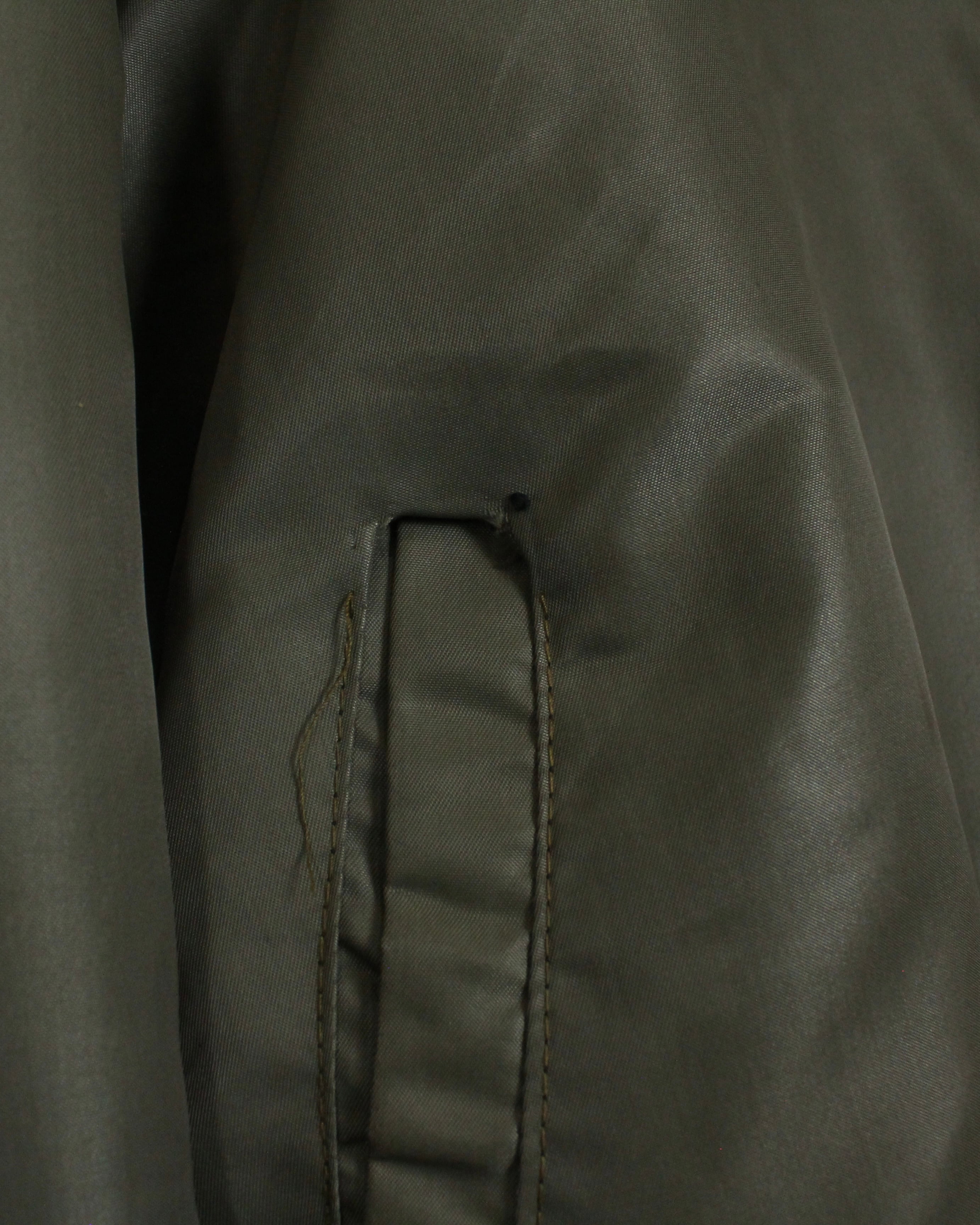 艶のあるセージグリーンのナイロンシェルのボディに、ダークグリーンボア襟がアクセントに。インナーには鮮やかなオレンジのキルティングライナーを採用し、保温性と視認性を兼ね備えた仕様で、アームポケットやヘビーデューティなジップディテールなど、当時のディテールを忠実に再現しています。