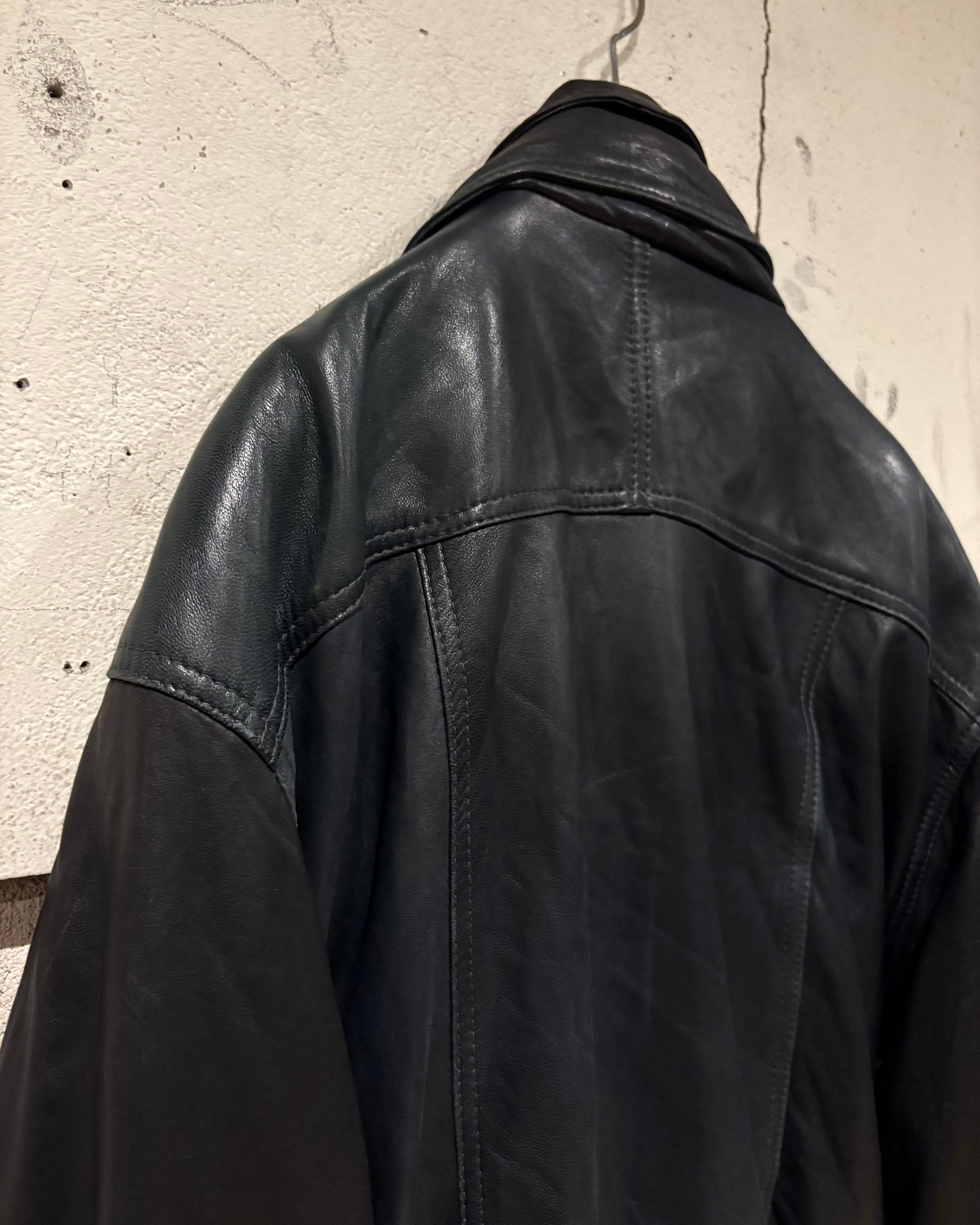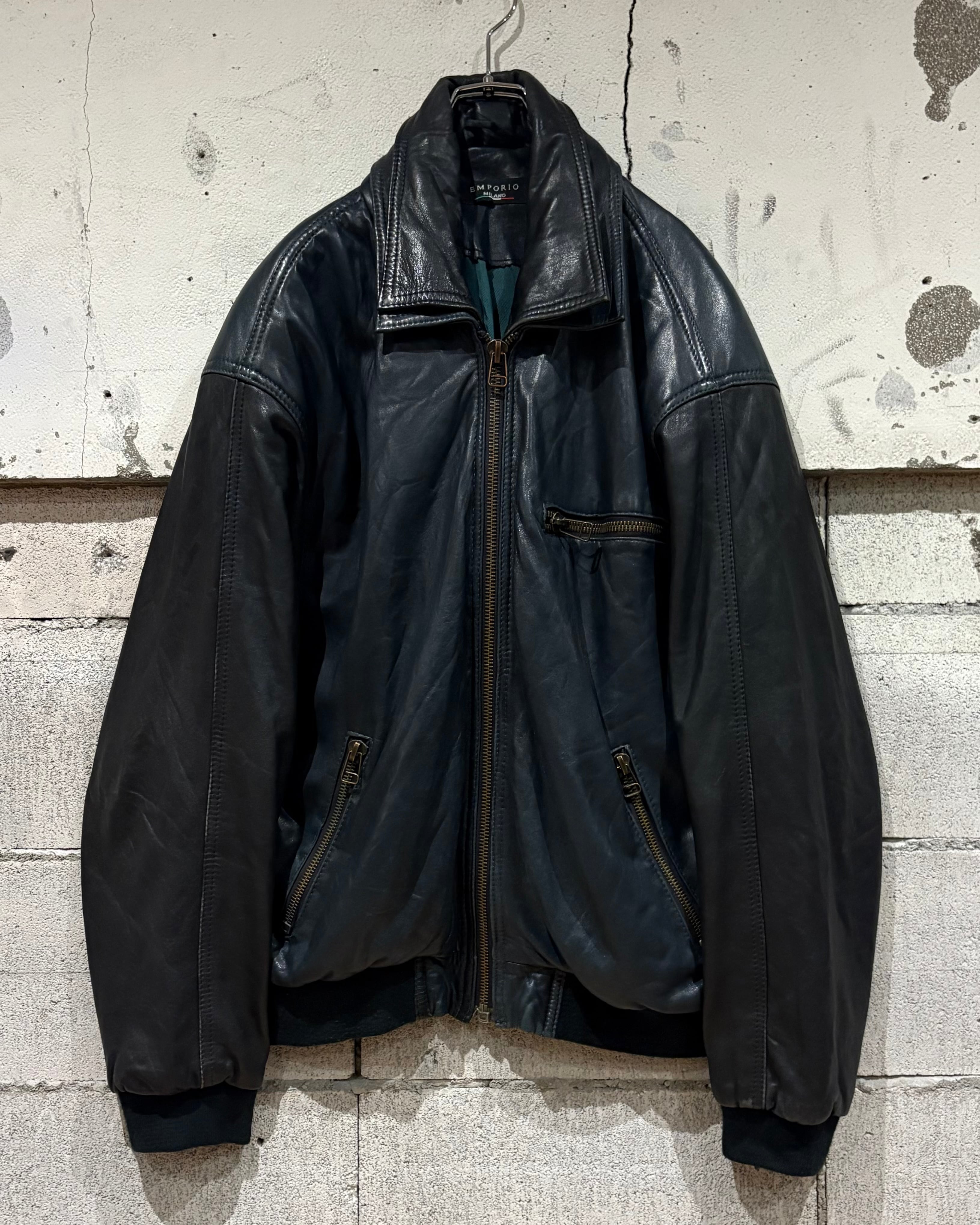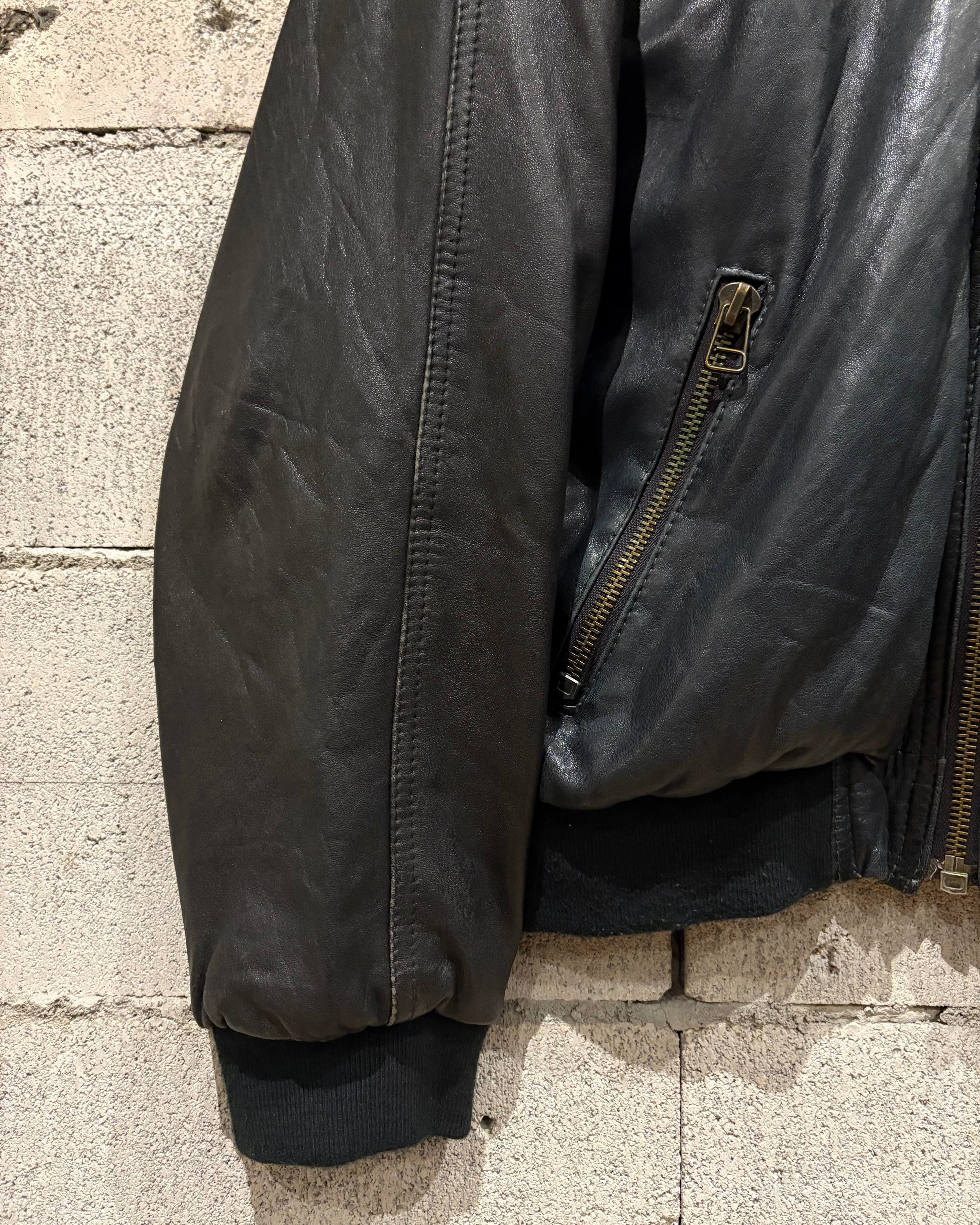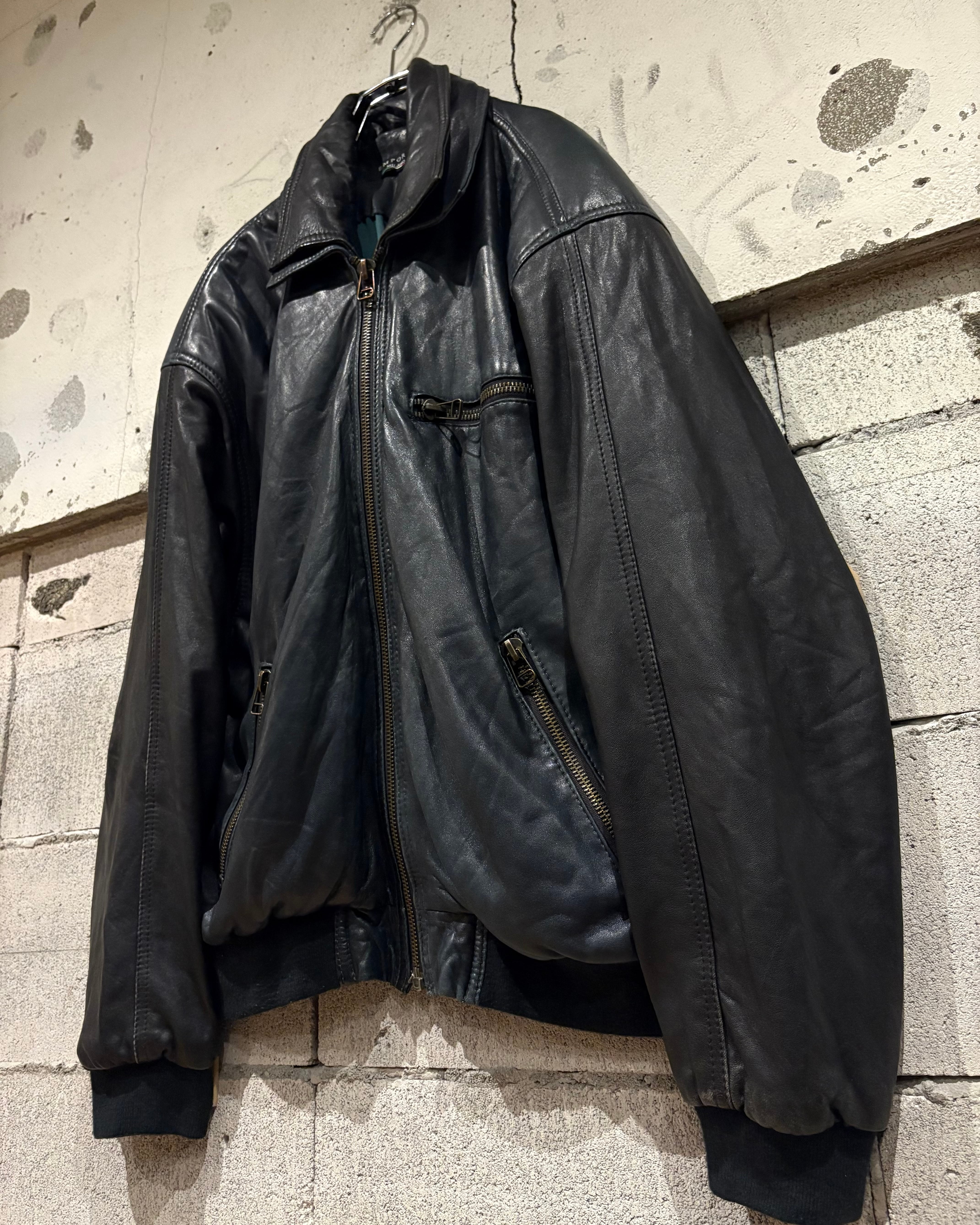 深みのあるグリーンボディに、ブラックのアームを切り替えたツートーン仕様のレザーブルゾン。