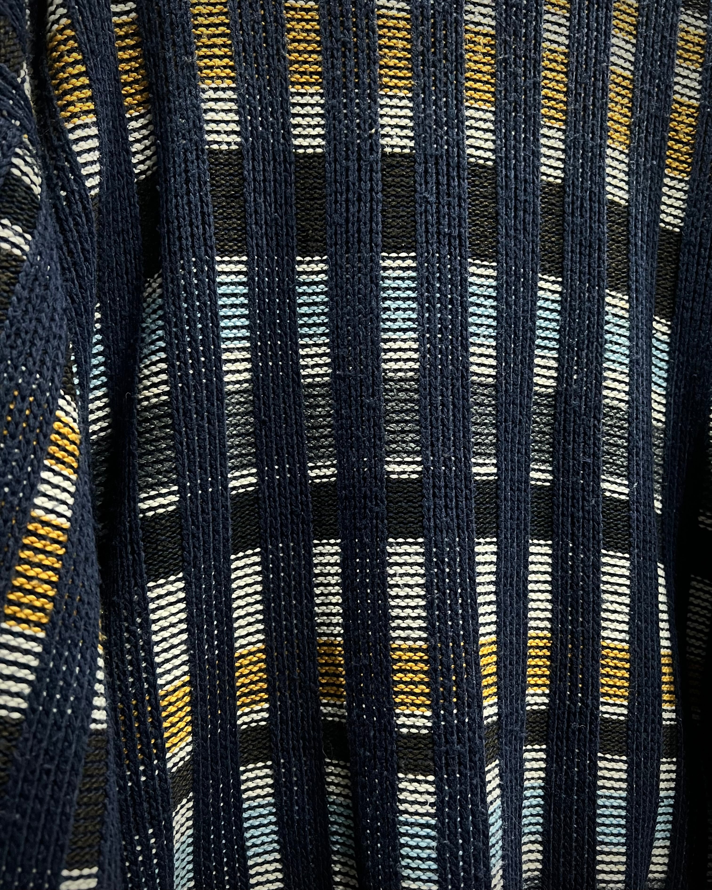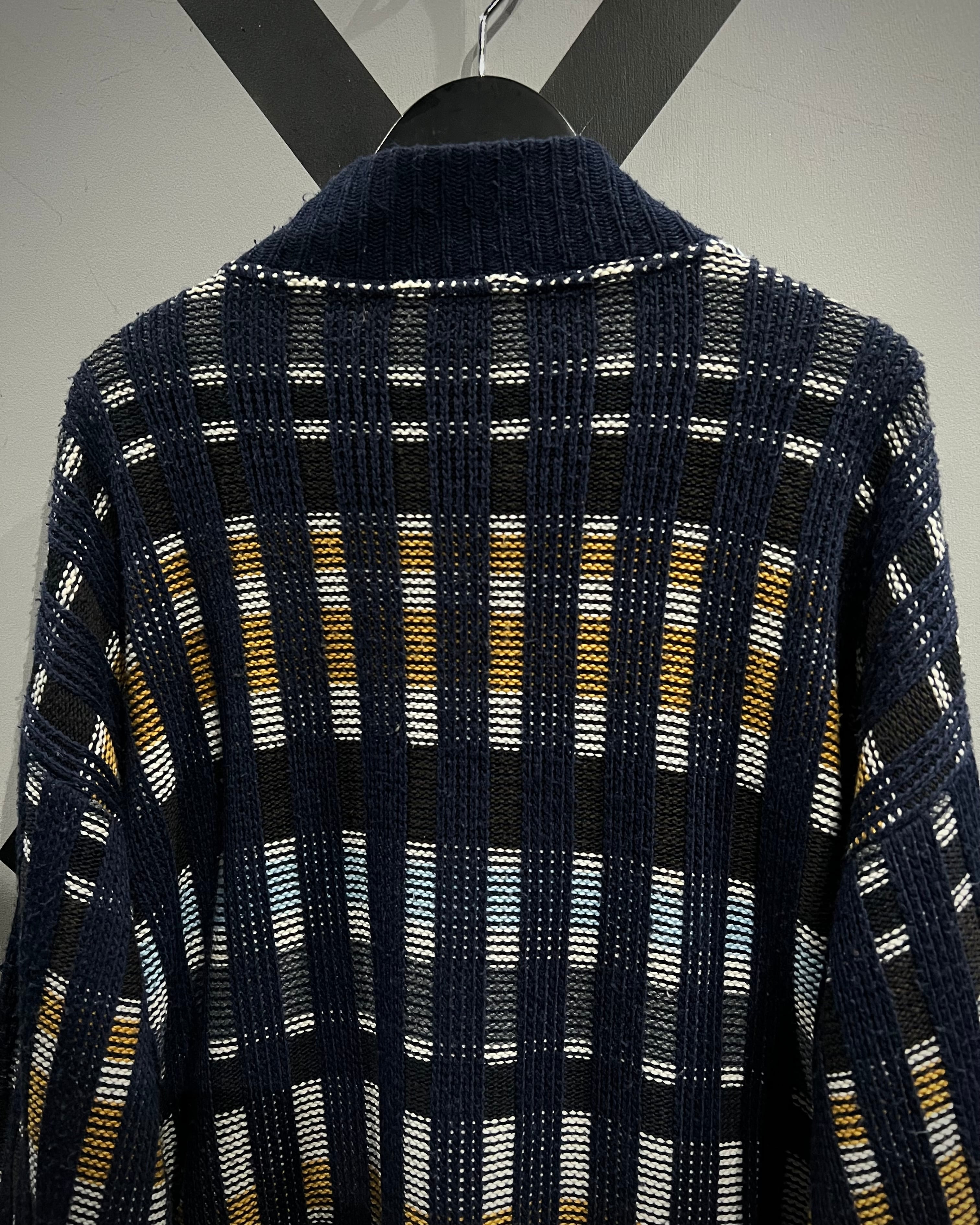 ネイビーをベースに、ホワイト、マスタード、グレーを交えたグリッドパターンが全体を構築し、落ち着いたトーンの中に確かな存在感を与えています。