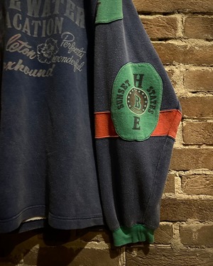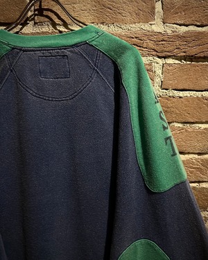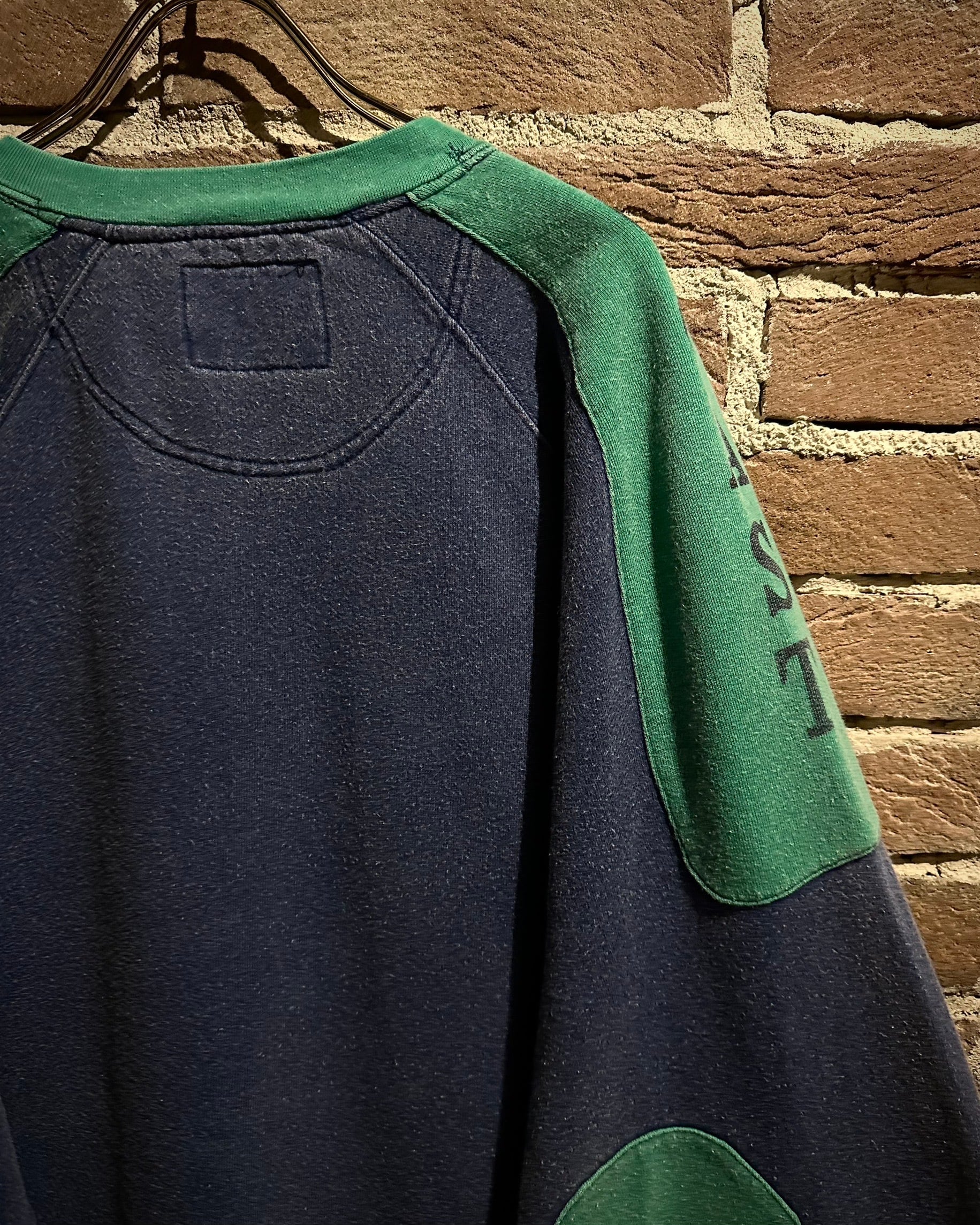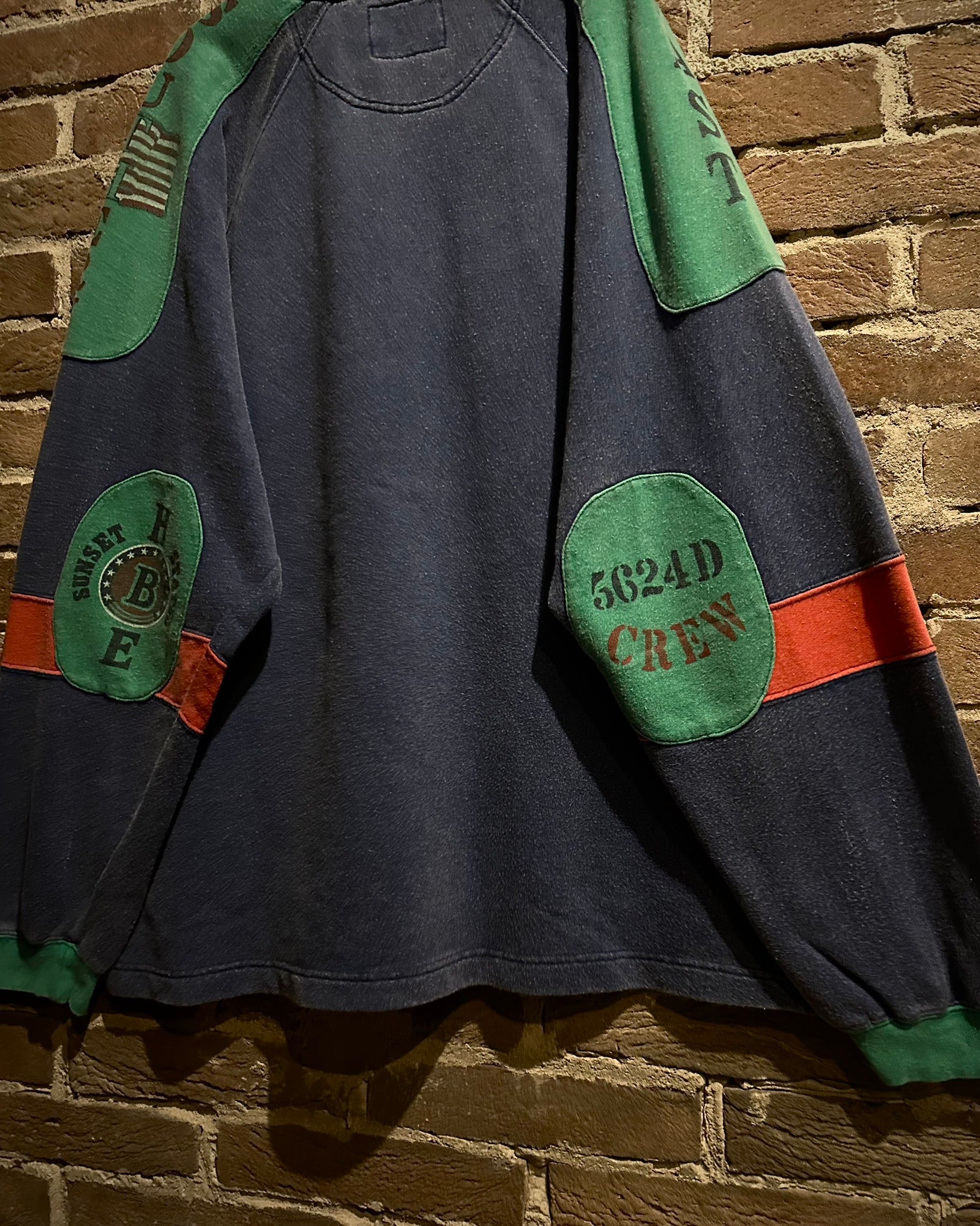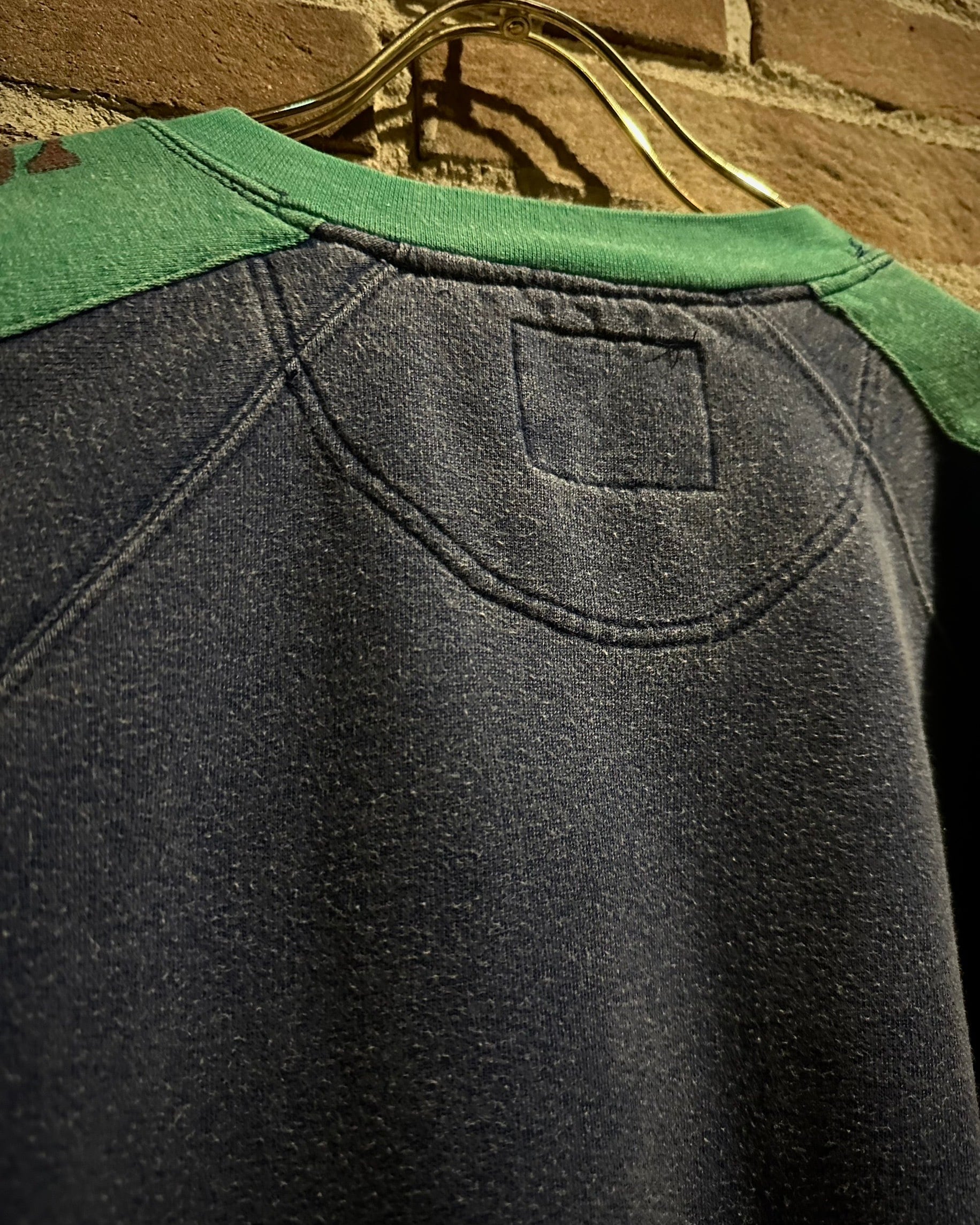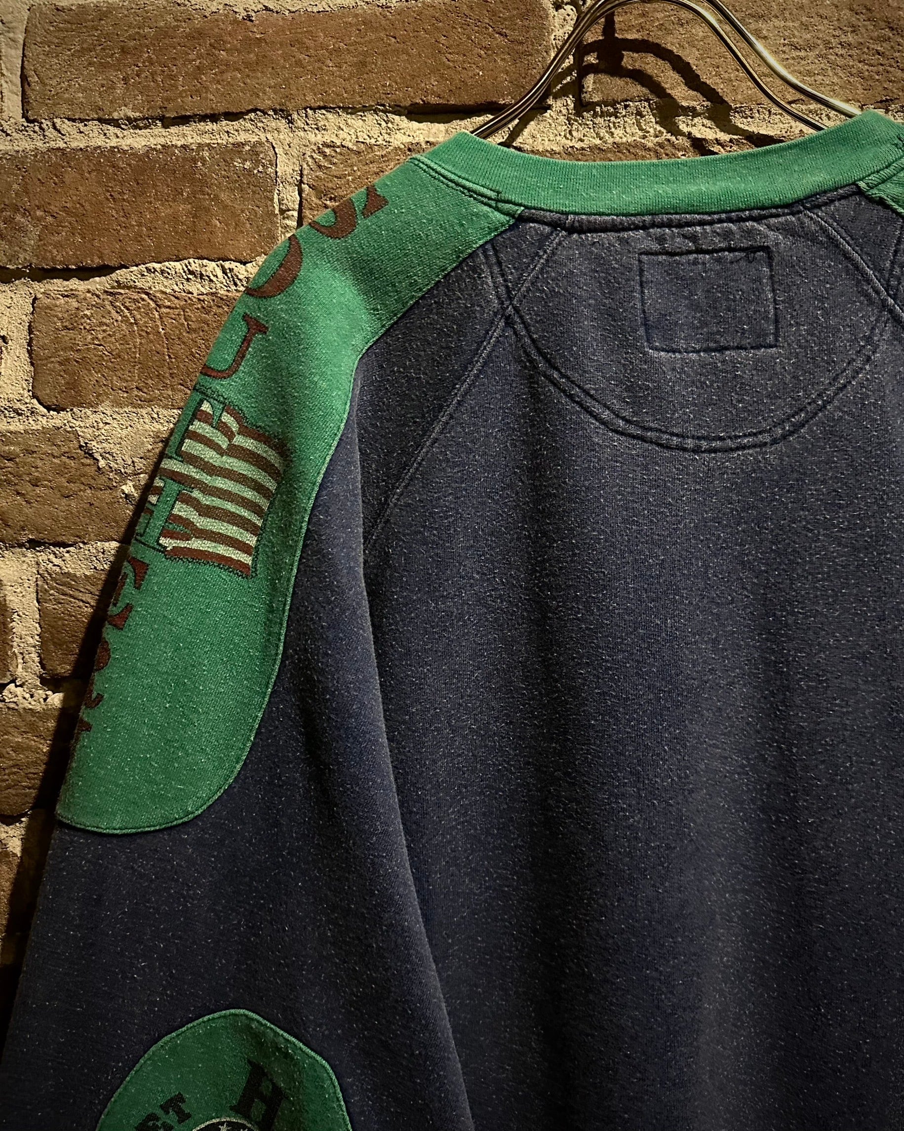 フロントにはカレッジテイストのロゴプリントを中心に、両袖にはエルボーパッチ、グラフィックやナンバリングを配置。プリントの擦れや退色が絶妙に調和しています。