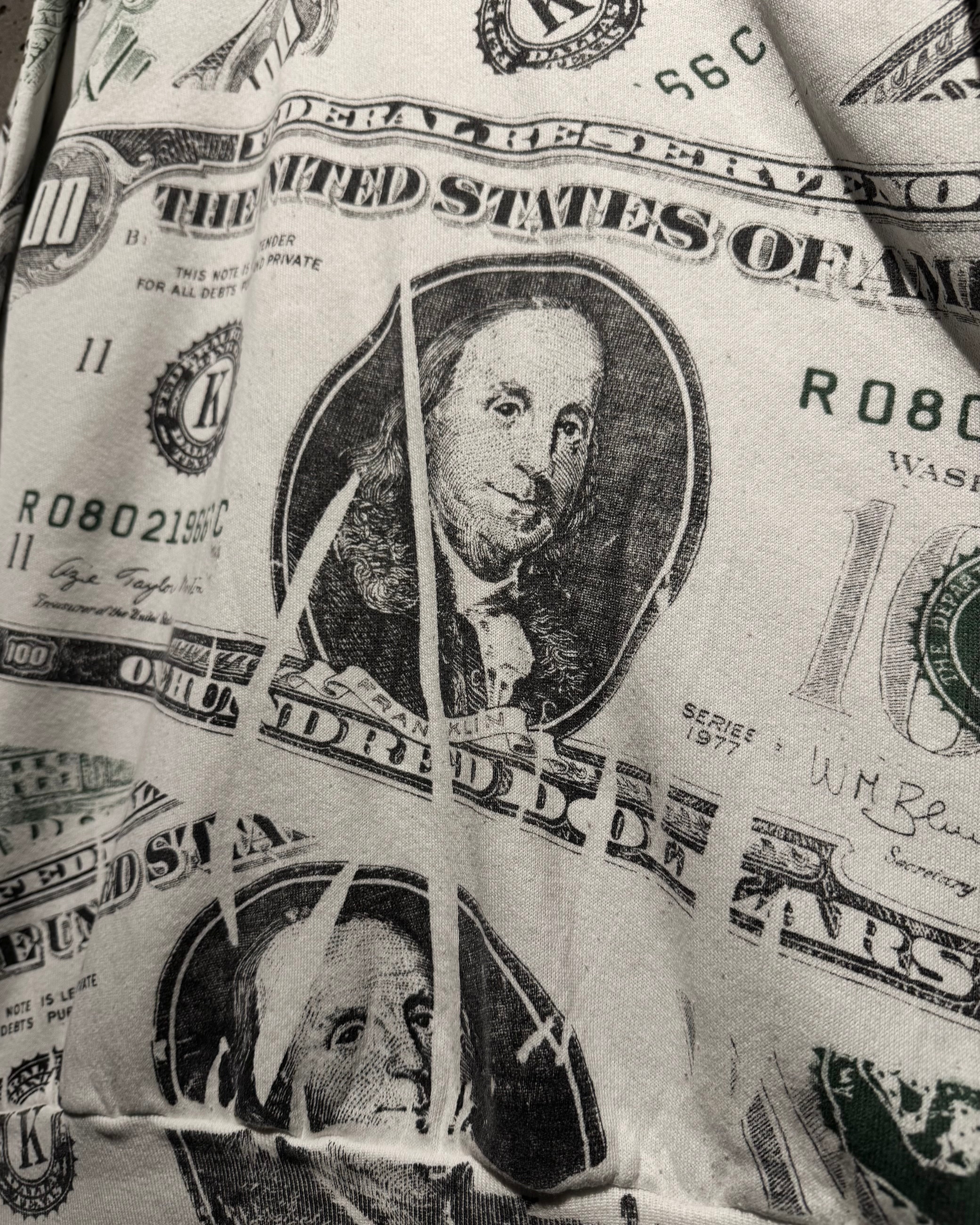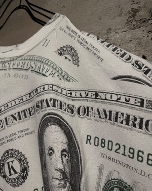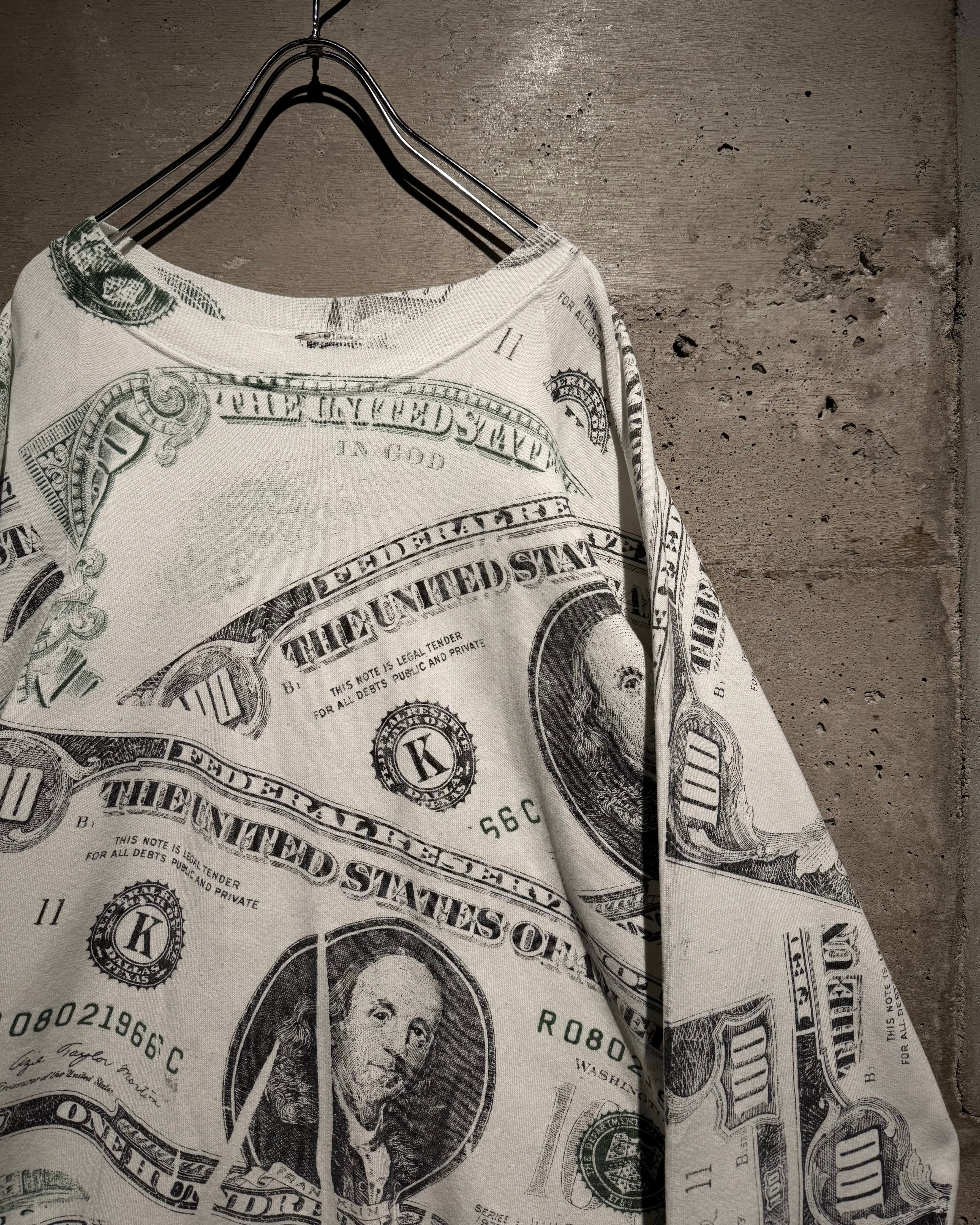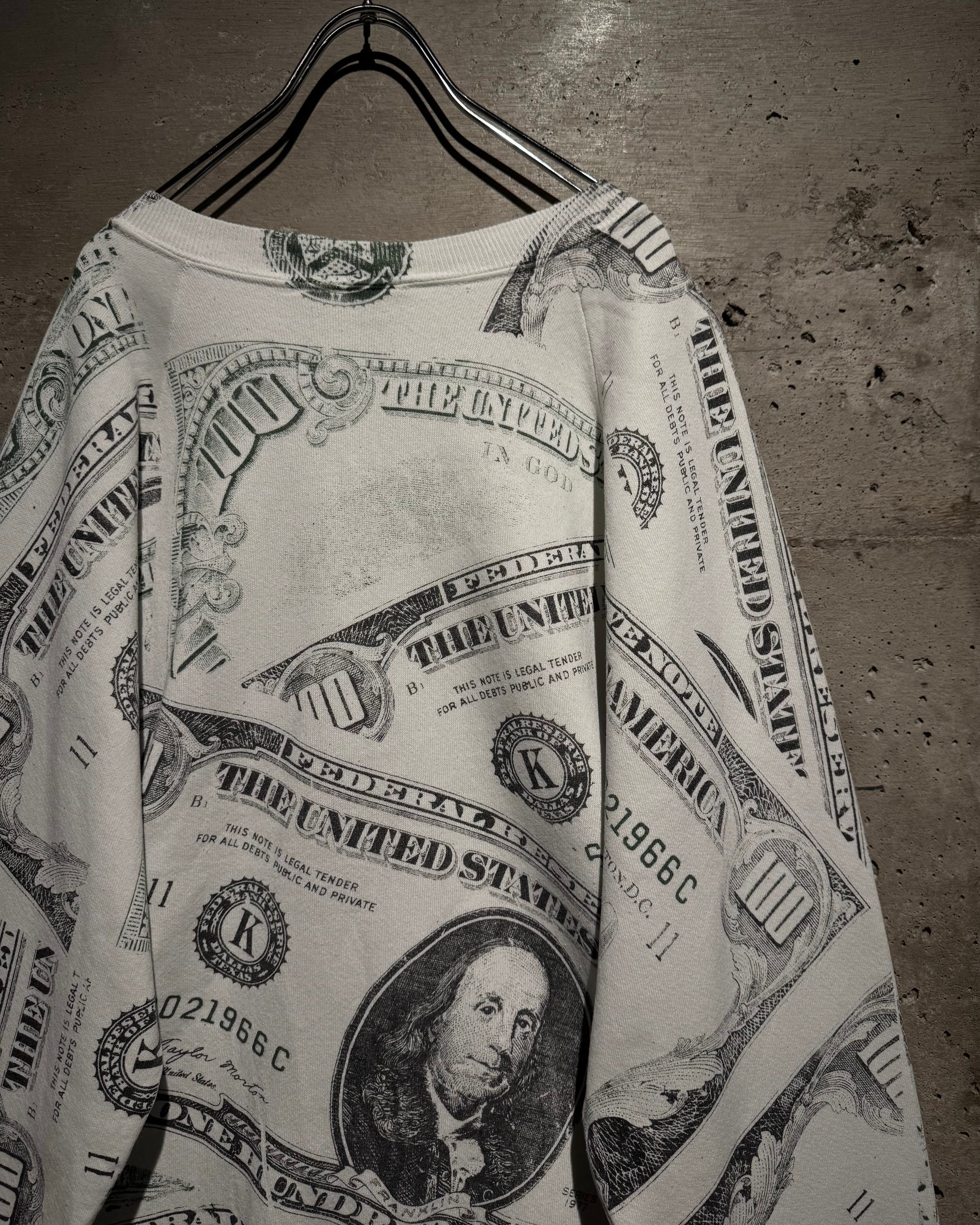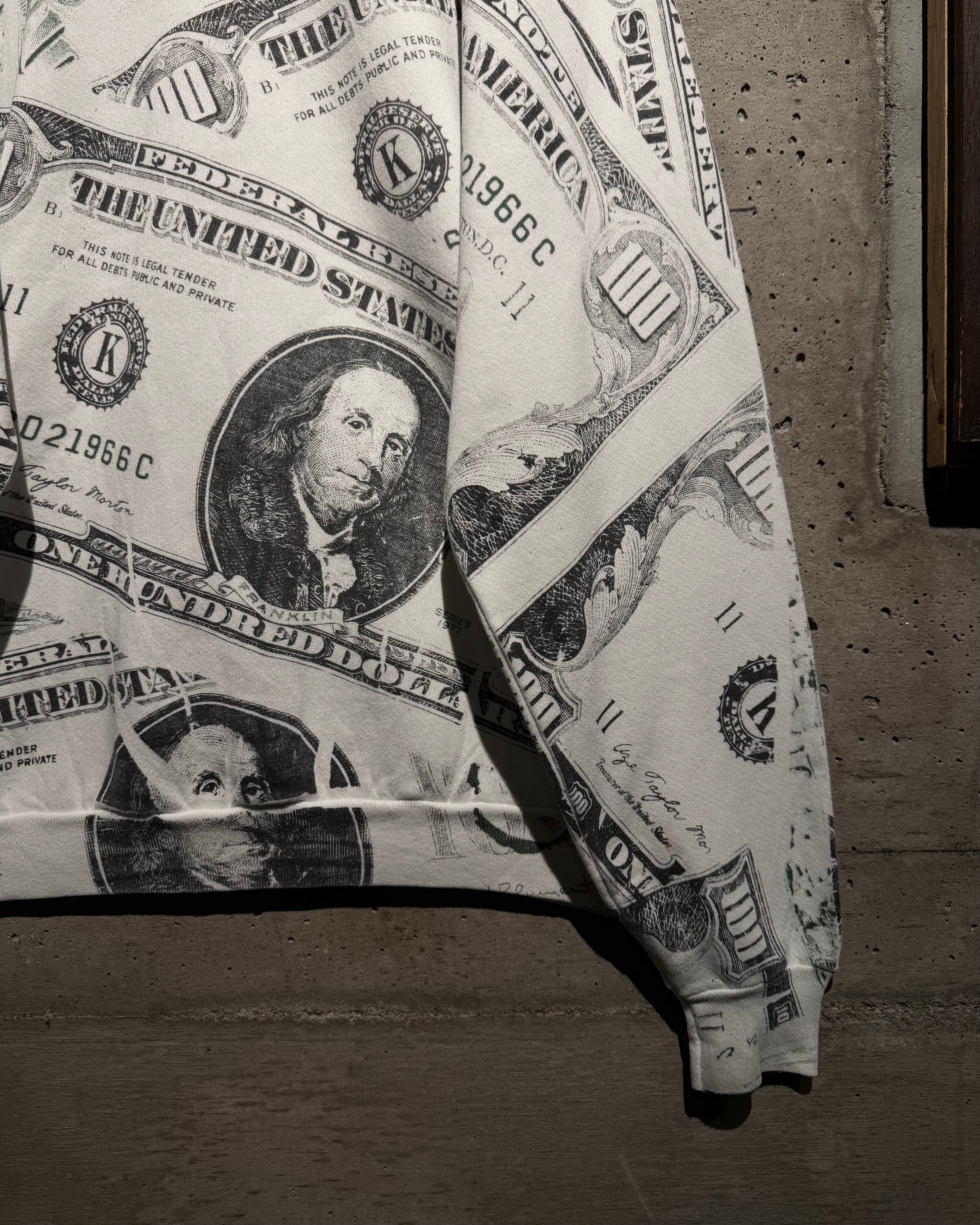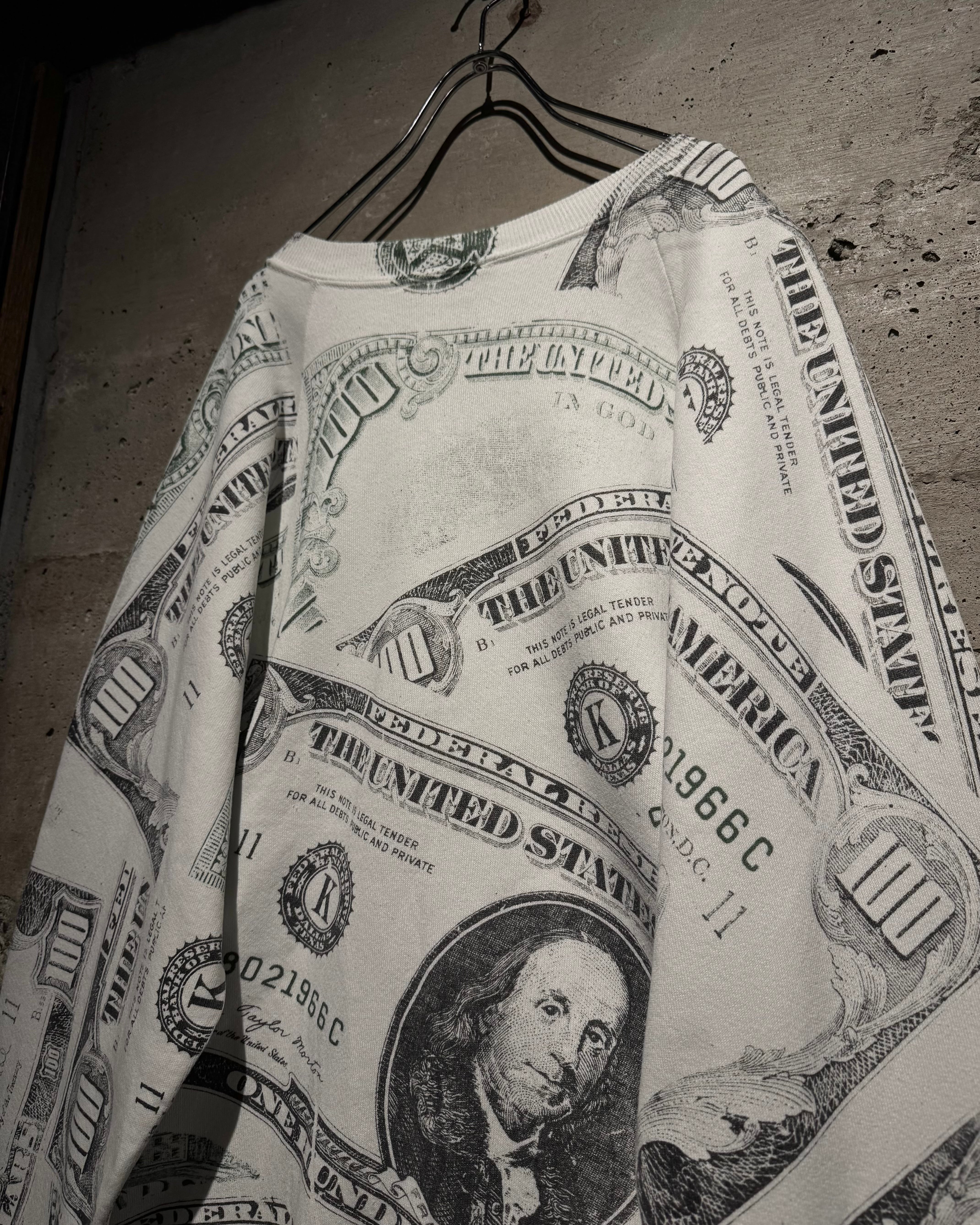 80'sのスウェットボディに大胆な100ドル札の総柄プリントを施した、Bling-Blingな雰囲気を漂わせる1着。