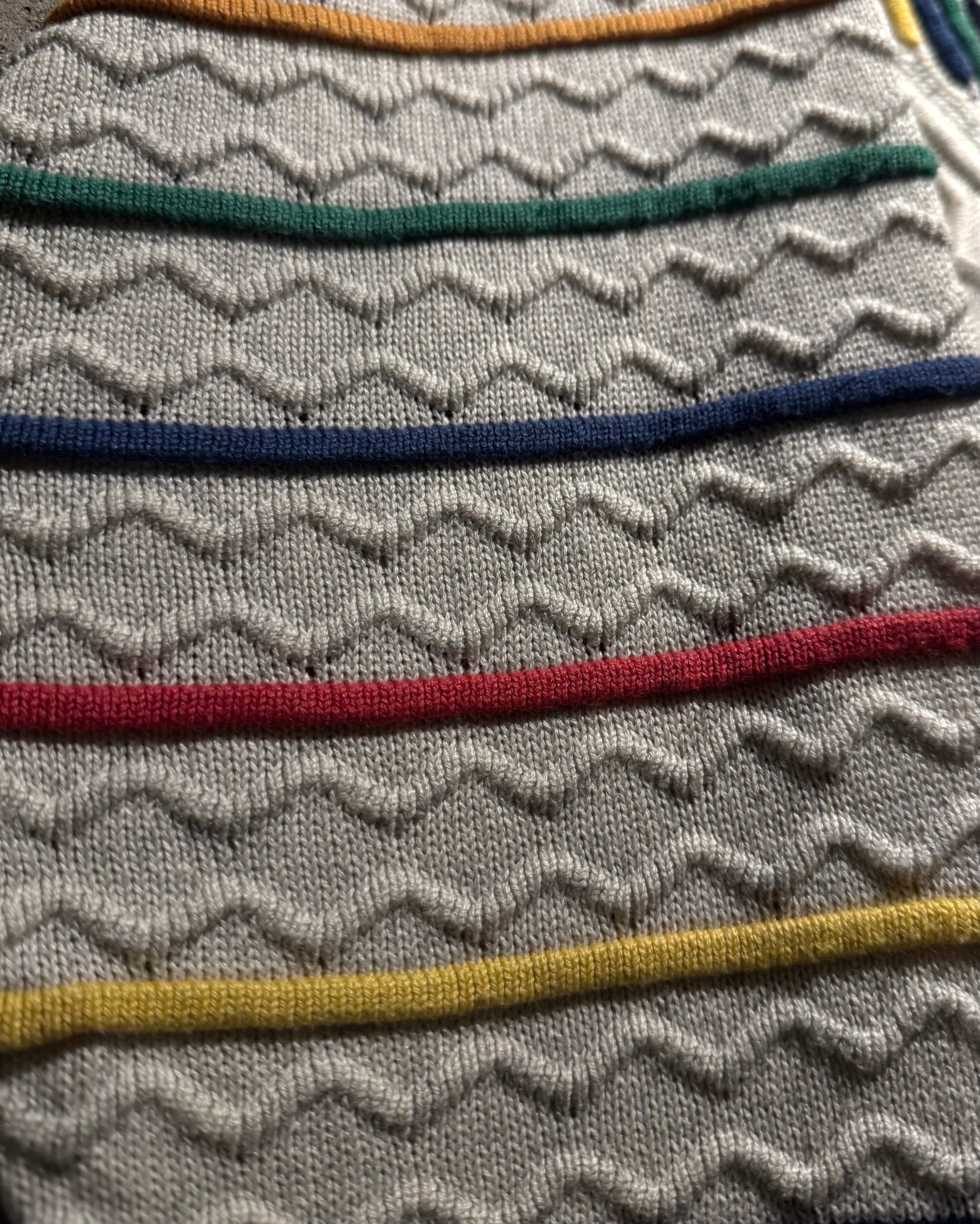 アイボリーベースのボディに、ブルー、レッド、イエロー、グリーンといった鮮やかな糸を大胆に編み込み、立体的な織り柄が表現された、高いクオリティを示すと共に唯一無二の存在感を見せる1着。