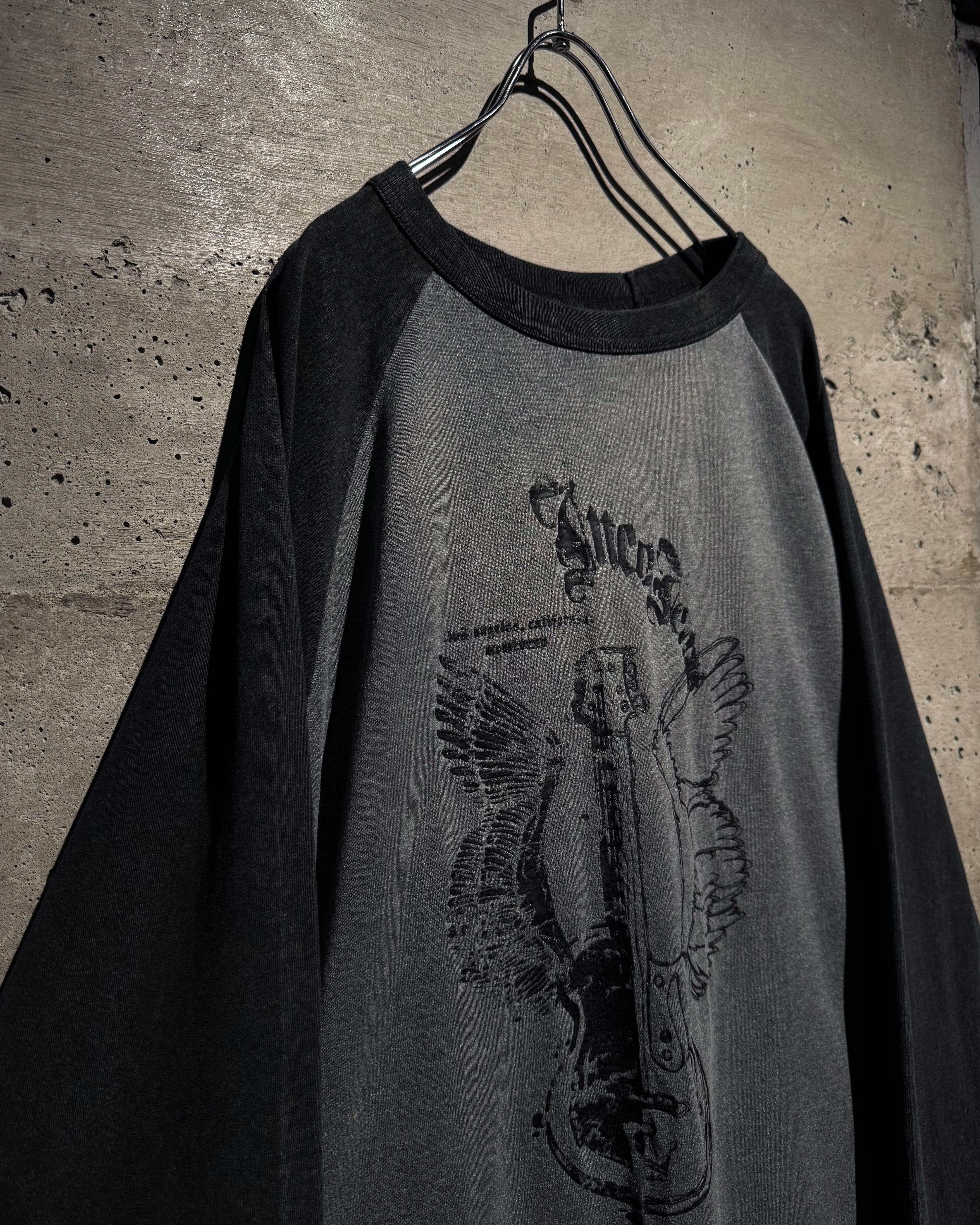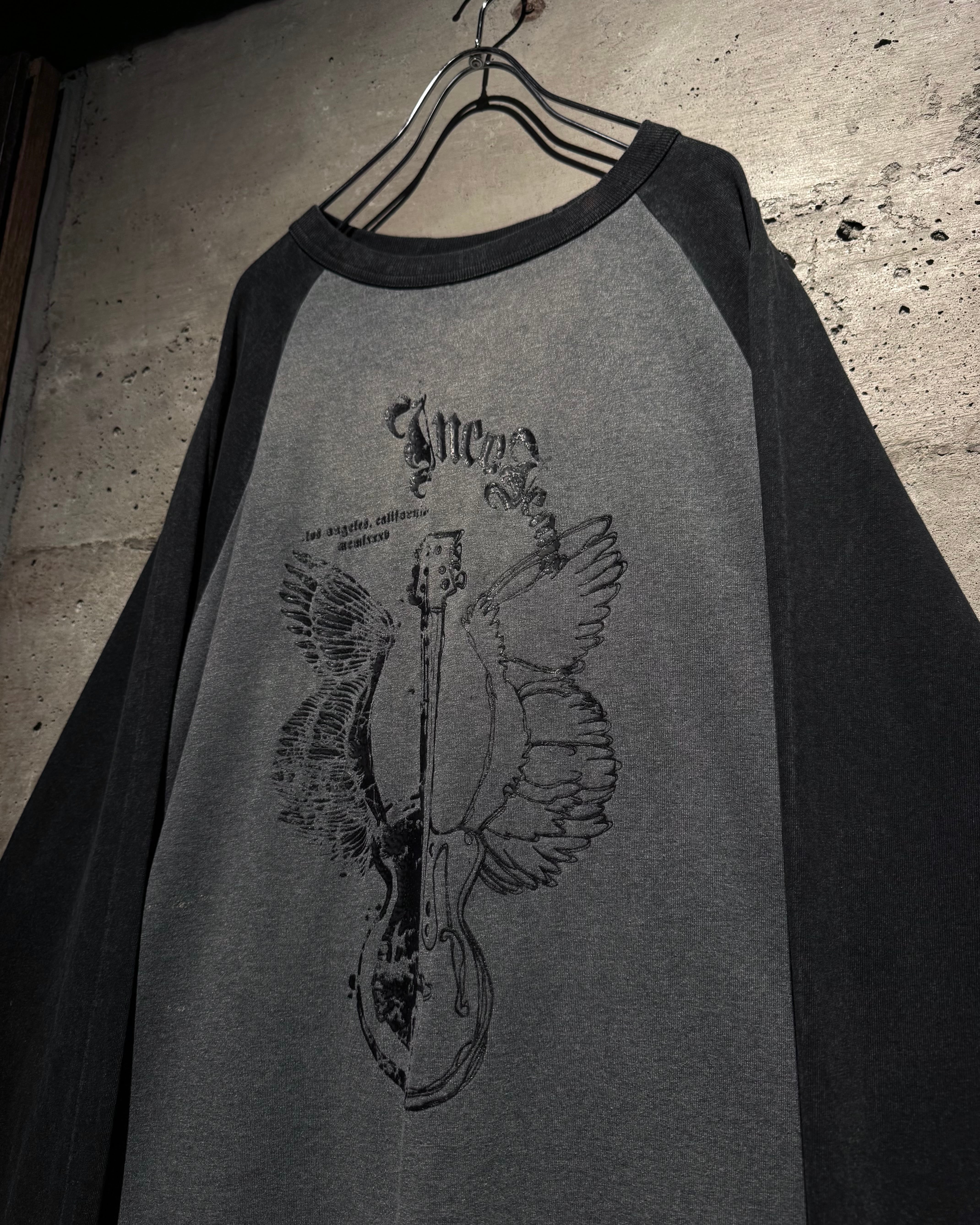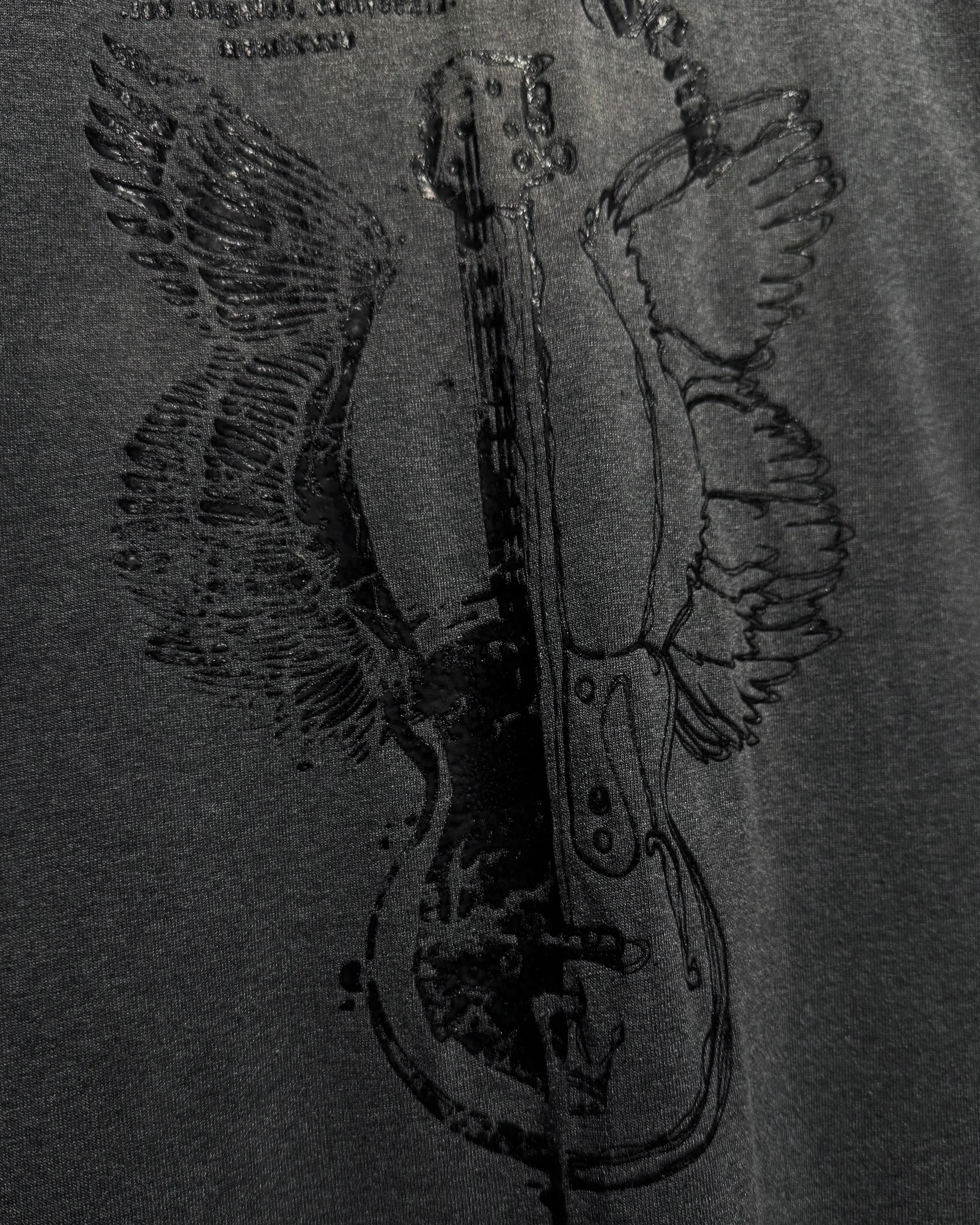 フェード加工が施されたブラック×チャコールグレーのツートーンボディに、翼を広げたギターのグラフィックが光る1着。