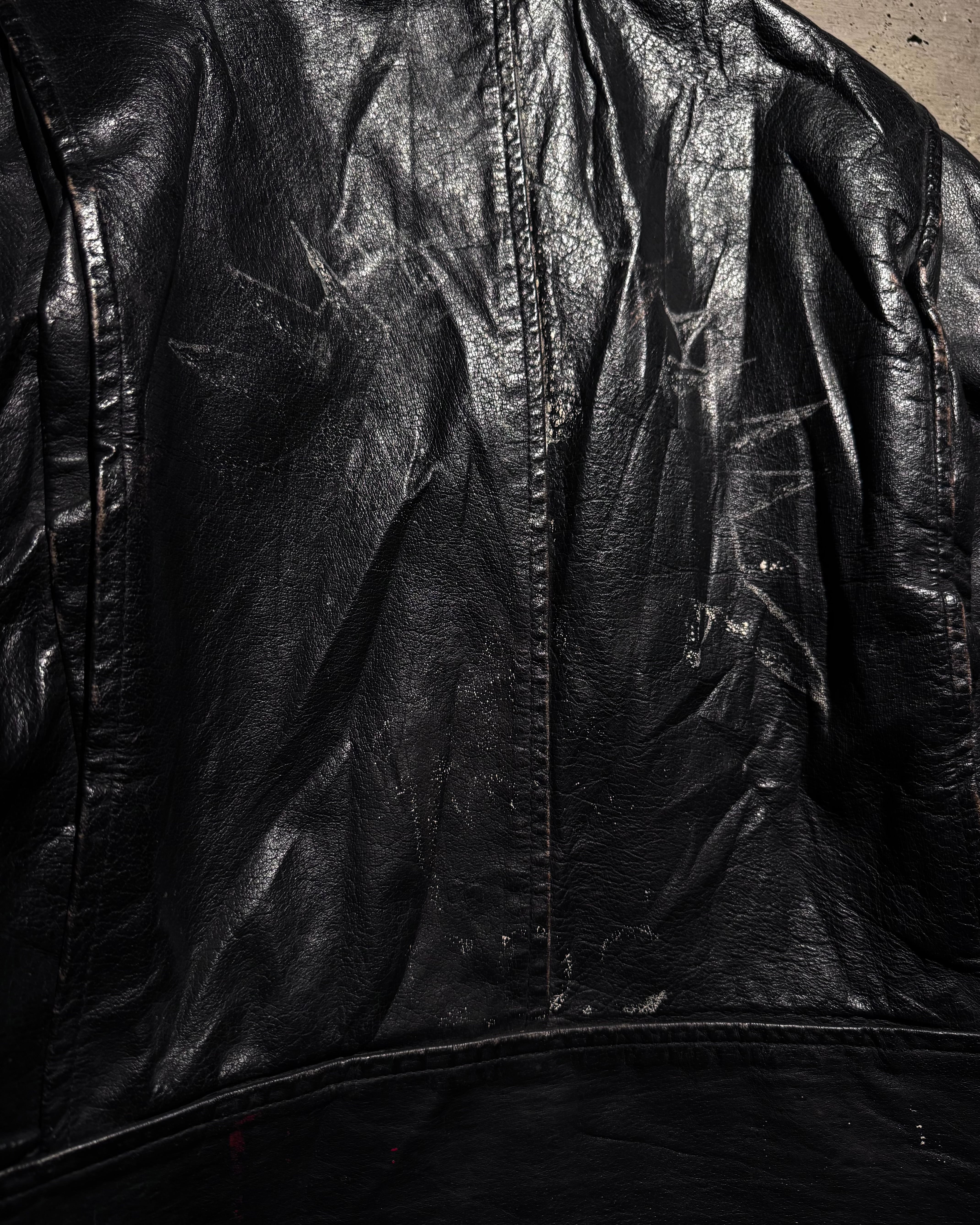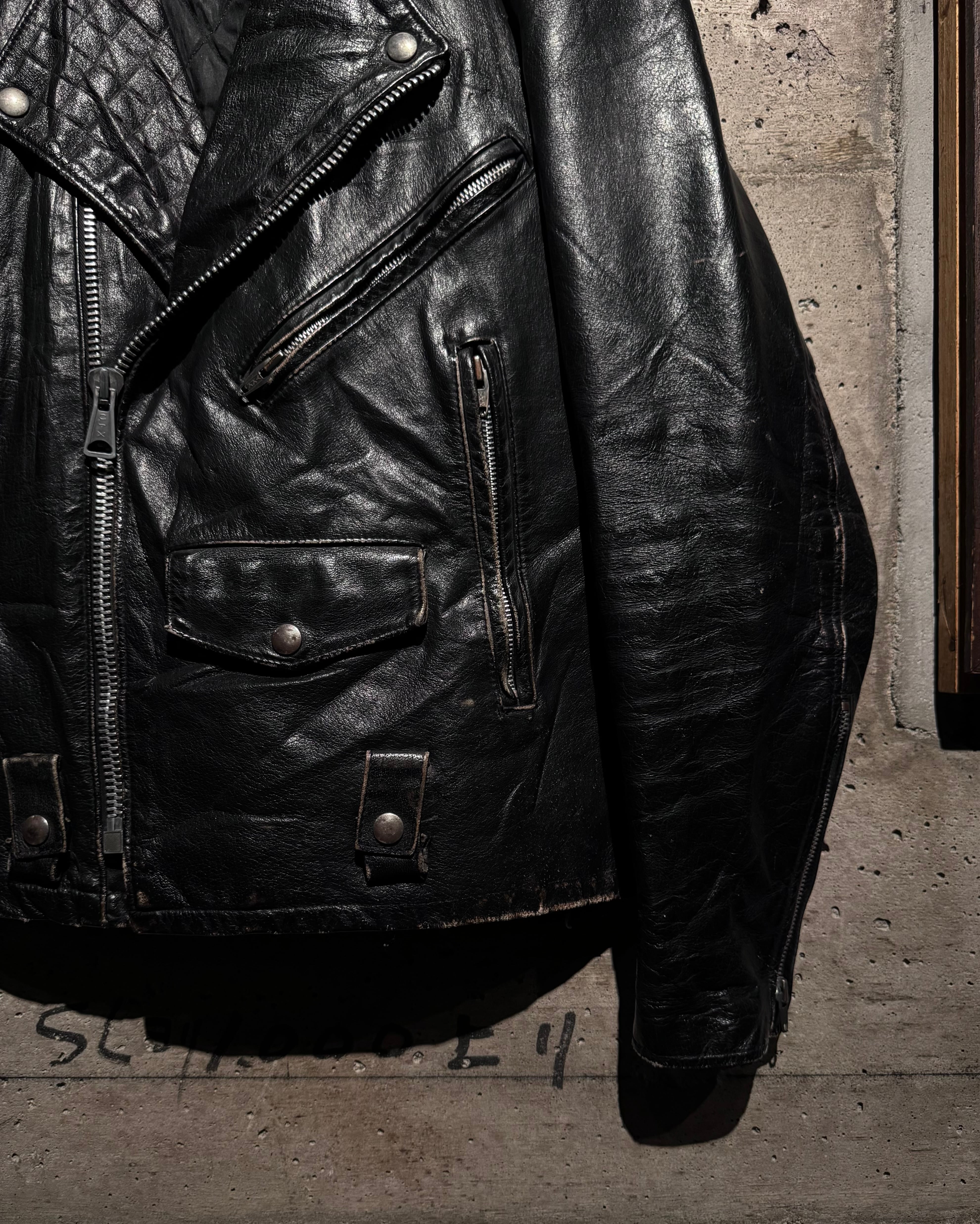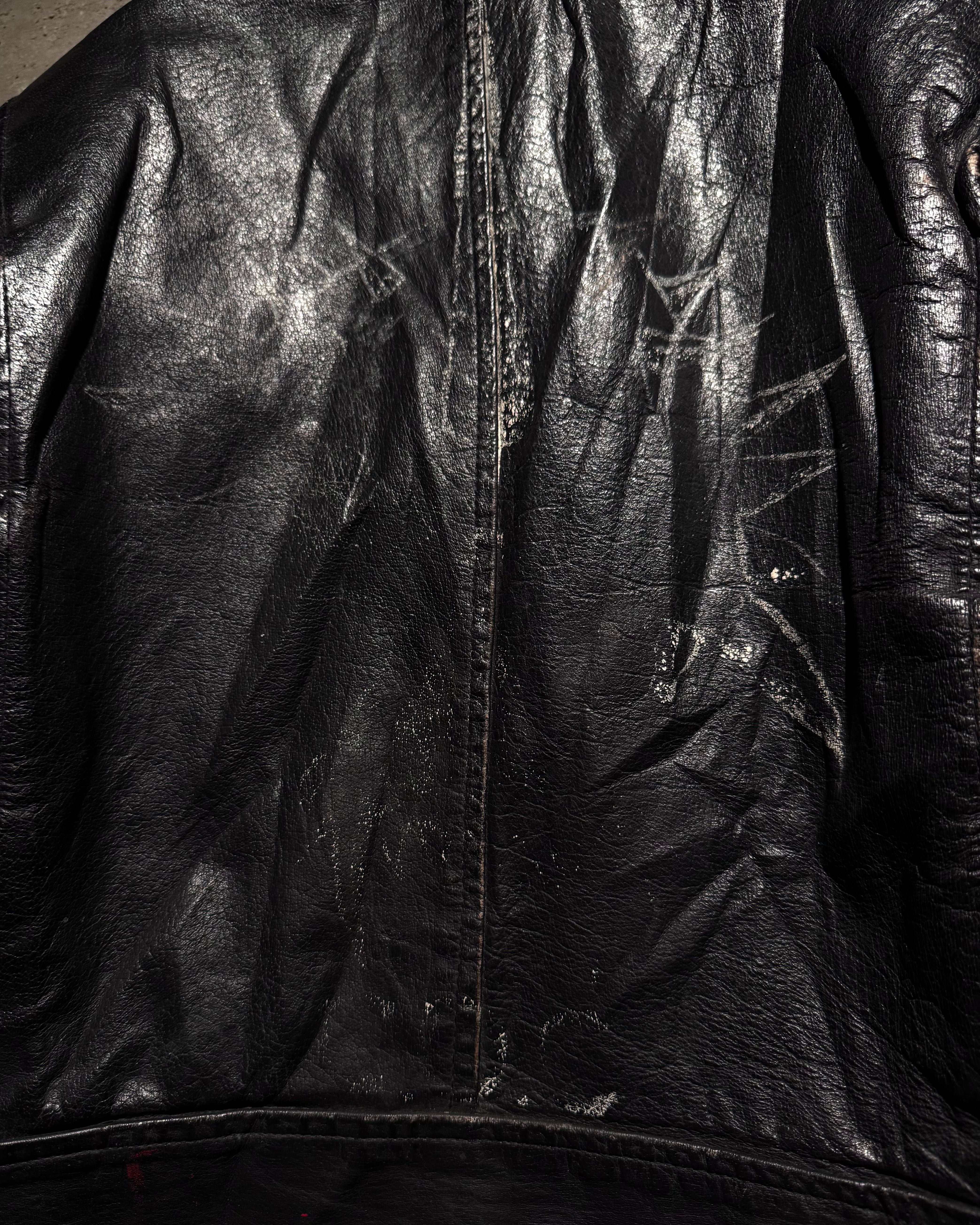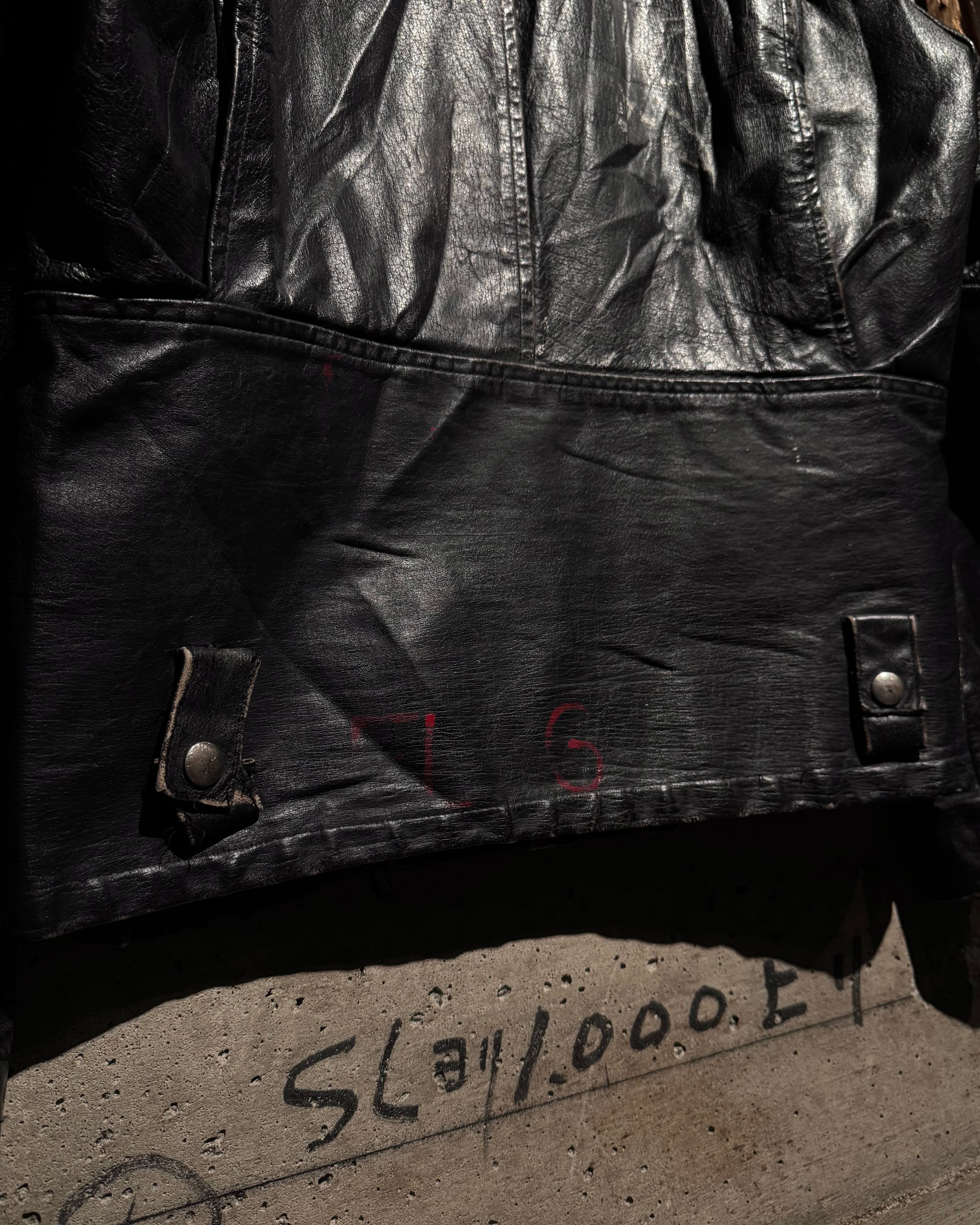 ハリのあるブラックレザーをボディに使用し、背面に当時のオーナーによって描かれたペイント跡が残った、バックカルチャーをヒシヒシと感じさせるユーロヴィンテージのダブルライダースジャケット。