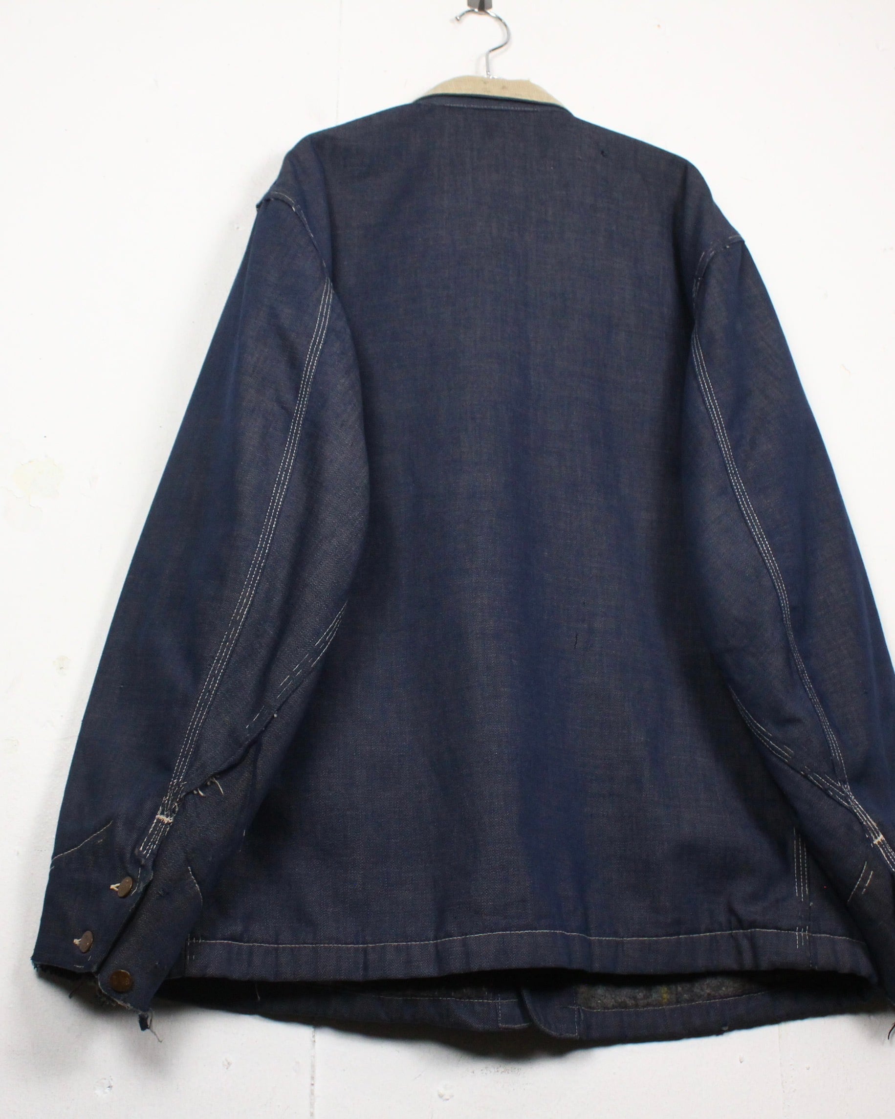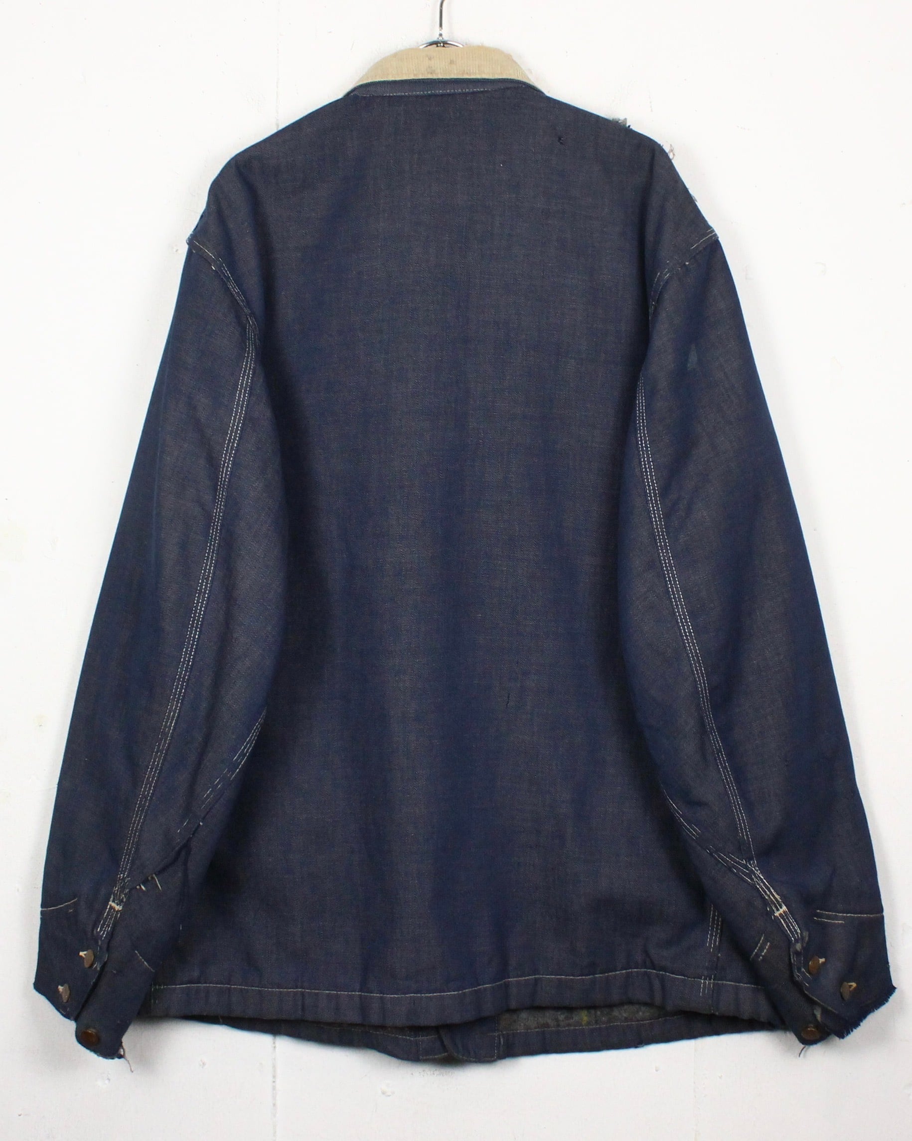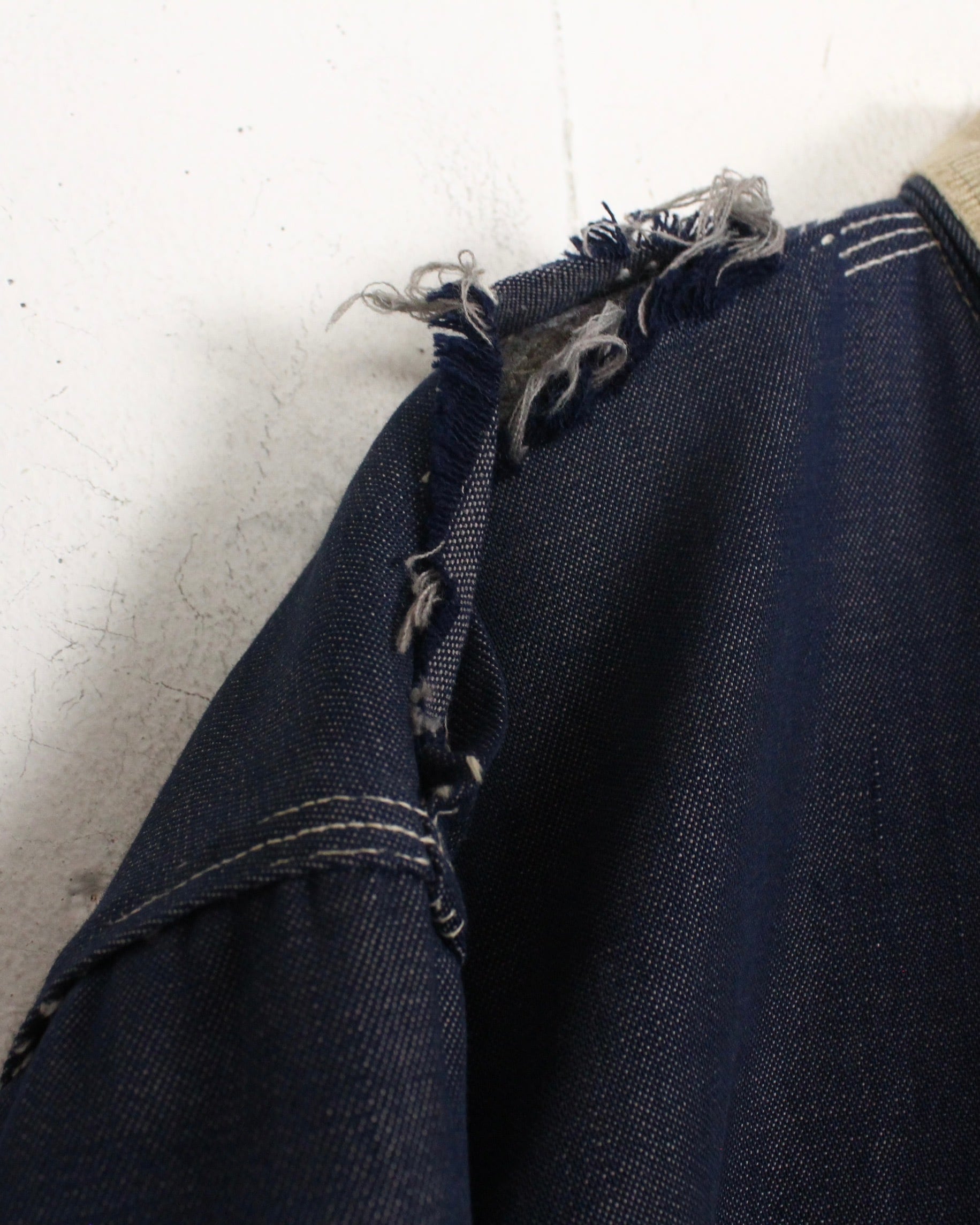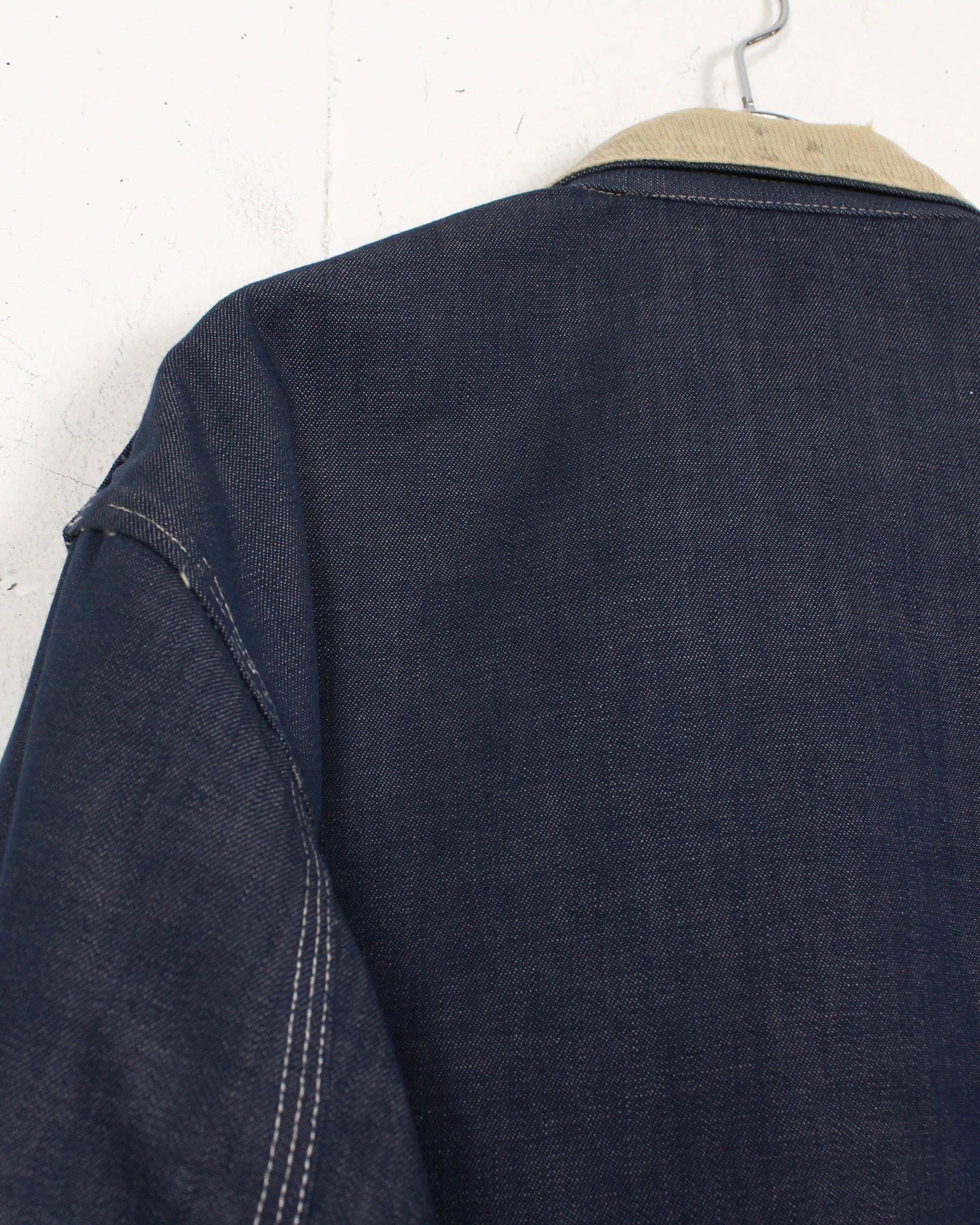 無骨なインディゴデニムボディに、ベージュのコーデュロイ襟が組み合わされた王道のスタイルで、肩や袖口にかけてのリペアや擦れが、リアルワークを物語る風格を漂わせています。