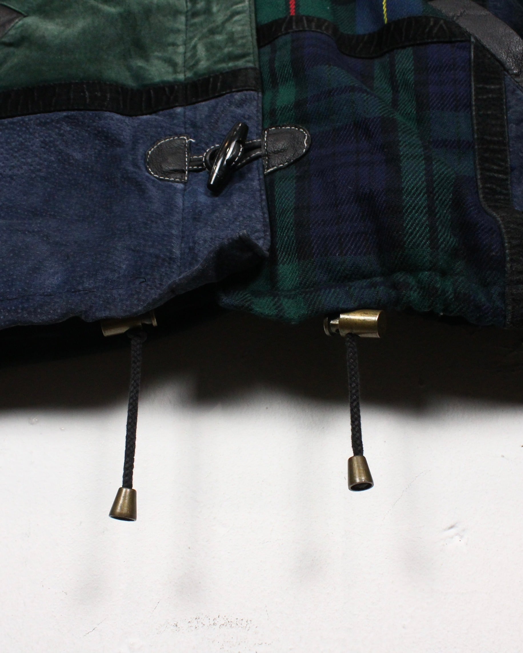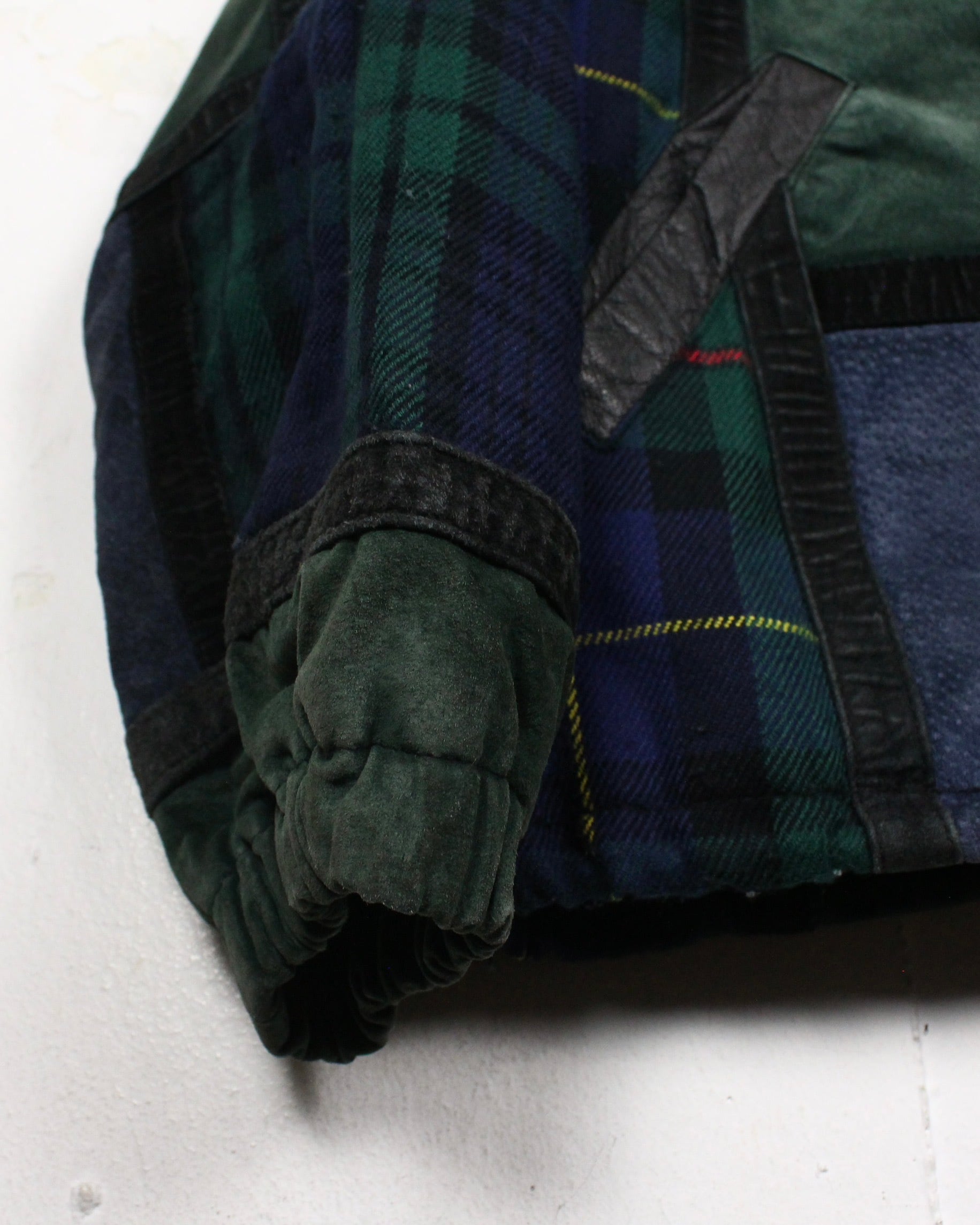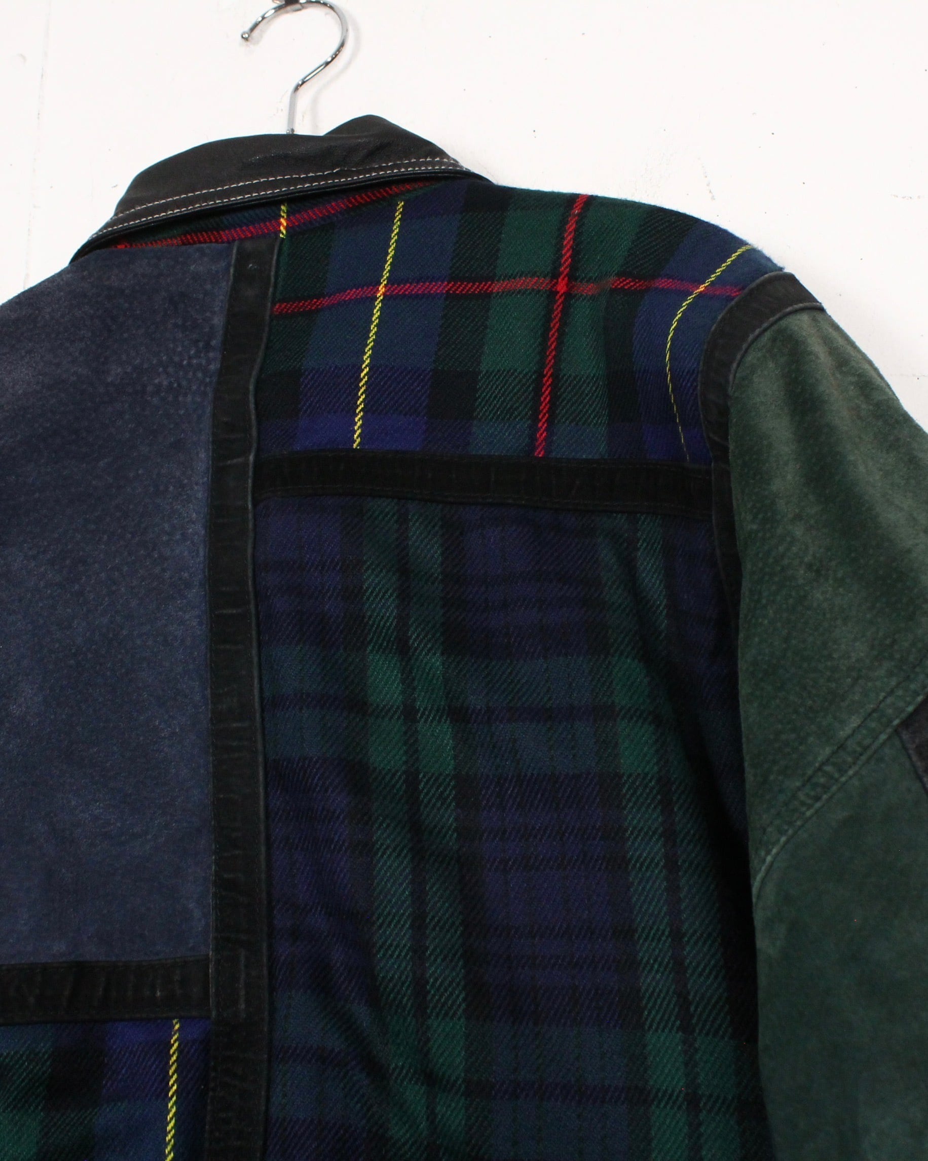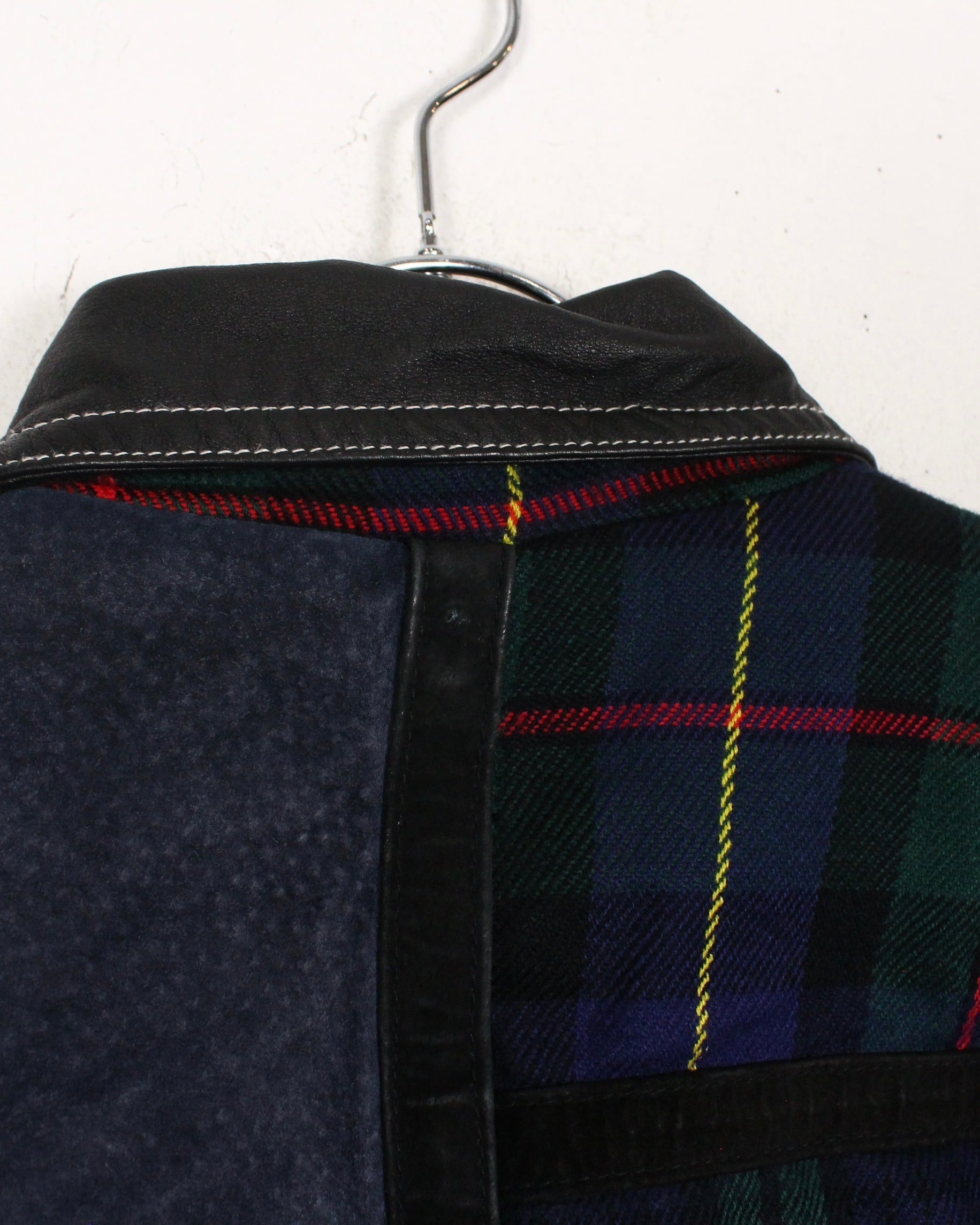 ベースには、ブラックウォッチをはじめとしたタータンチェックのウール生地と、深みあるグリーン&ネイビーのスエードレザーを大胆に組み合わせた1着。
