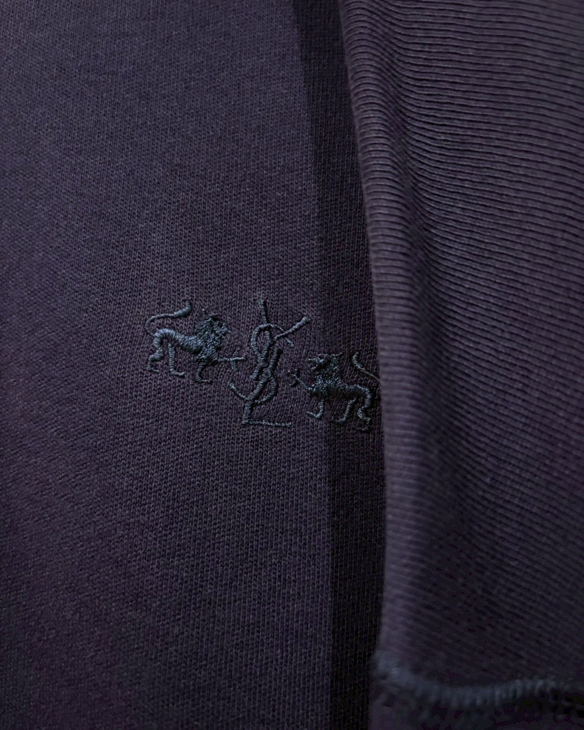 深みあるネイビーパープルのボディに、胸元にはYSLロゴとライオンモチーフの刺繍を同色で配置。控えめながらもブランドの威厳を感じさせるデザインで、トーンオントーンのさりげなさも絶妙です。
