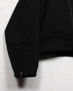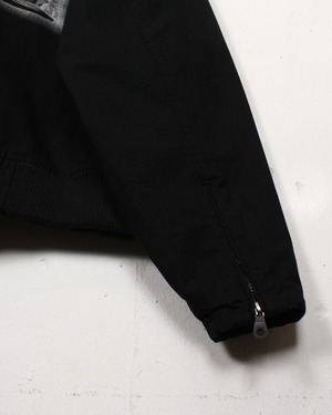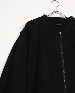 ボディはコットンが採用され、ハリと柔らかさを併せ持つ生地感に。袖口にはジップを備え、ライダースを思わせる無骨な雰囲気を演出。襟、裾、袖リブの編み立ても肉厚で、全体のバランスを引き締めています。