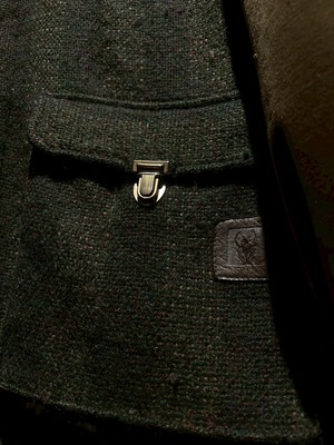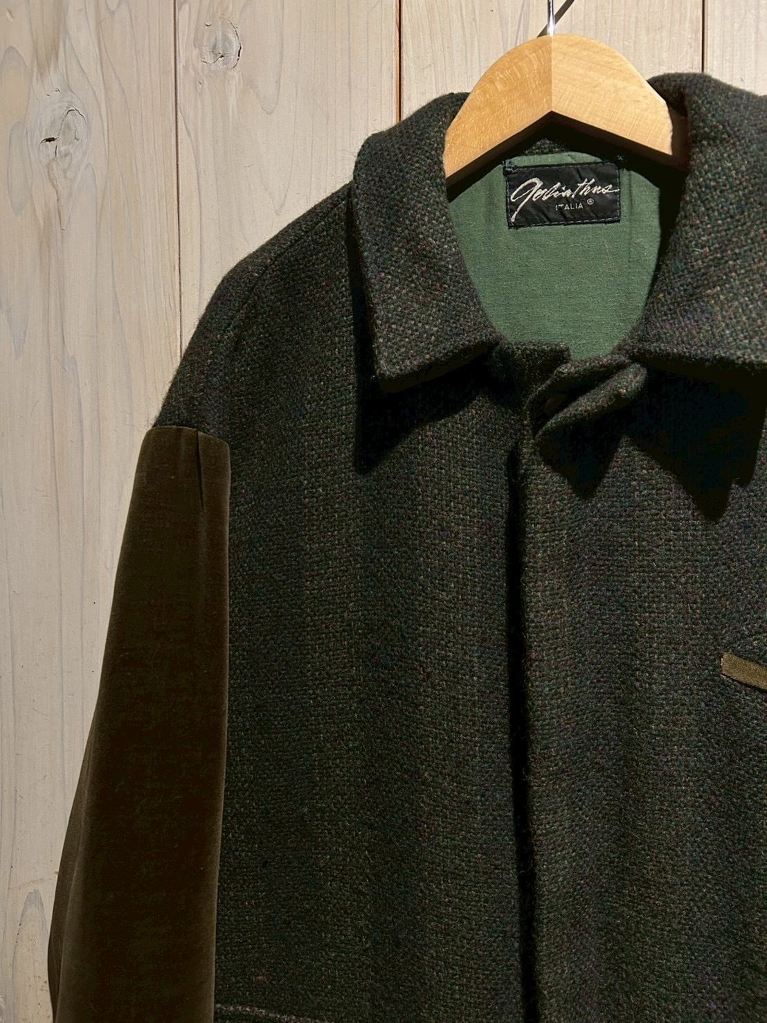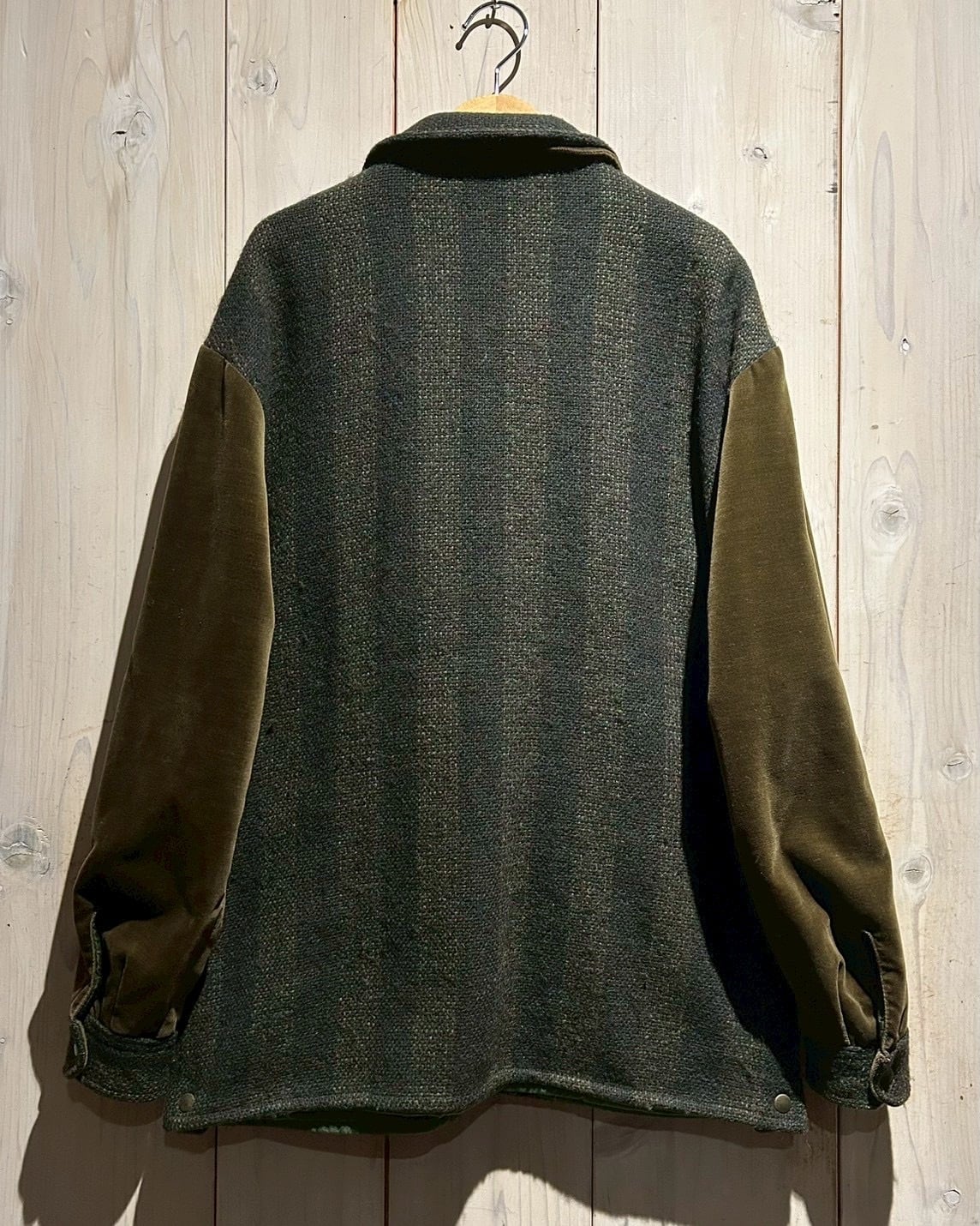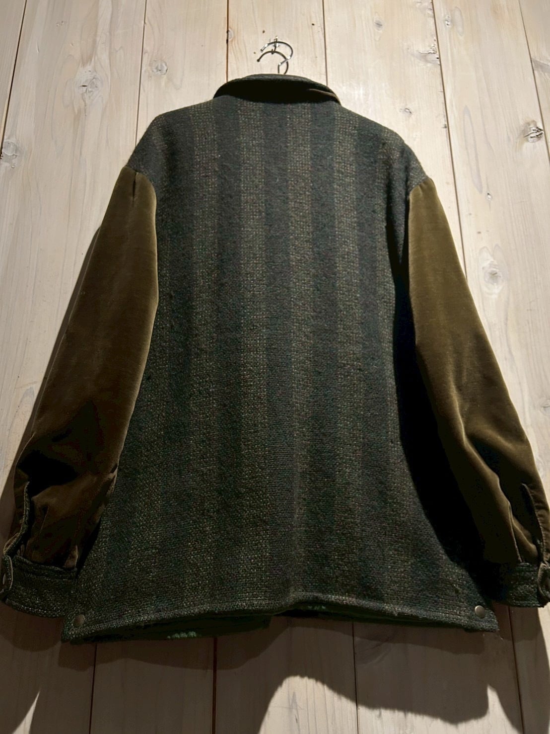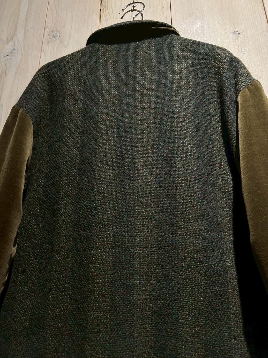 ボディには深みのあるストライプ柄のツイードウールを採用し、袖には上品な光沢を放つオリーブカラーのベロアを切り替えた1着。異素材による立体感とトーンの奥行きが、イタリアンブランドならではの色気を漂わせています。