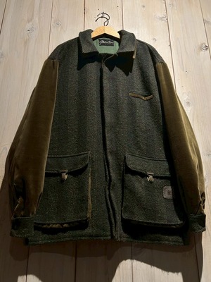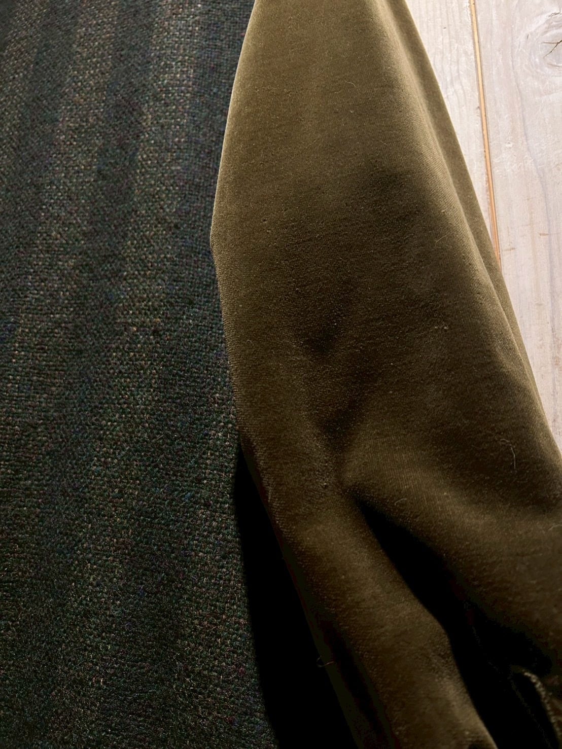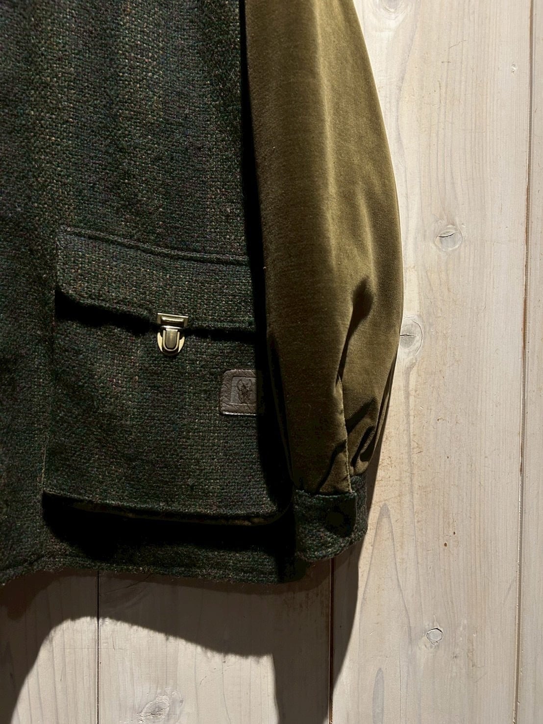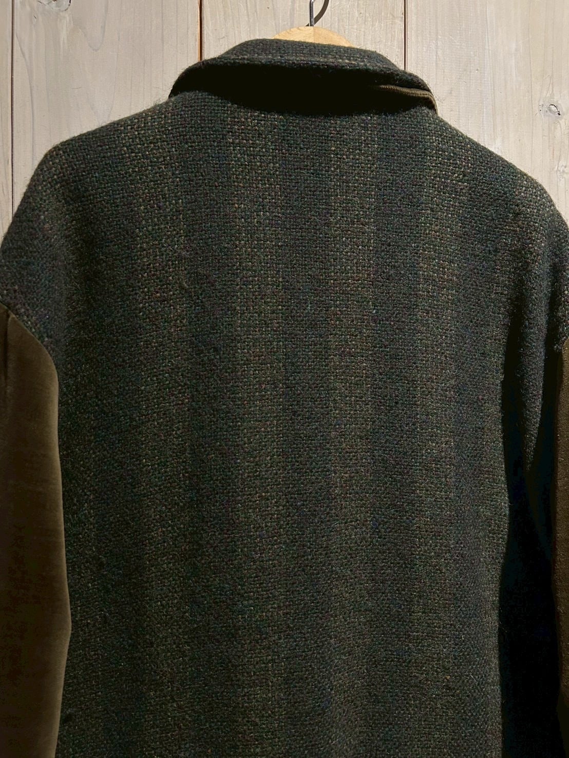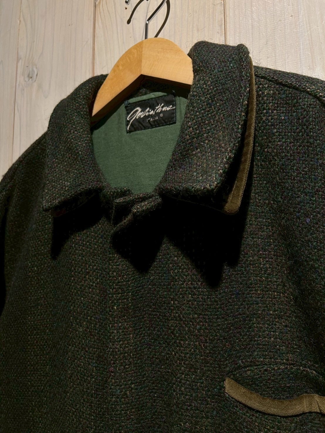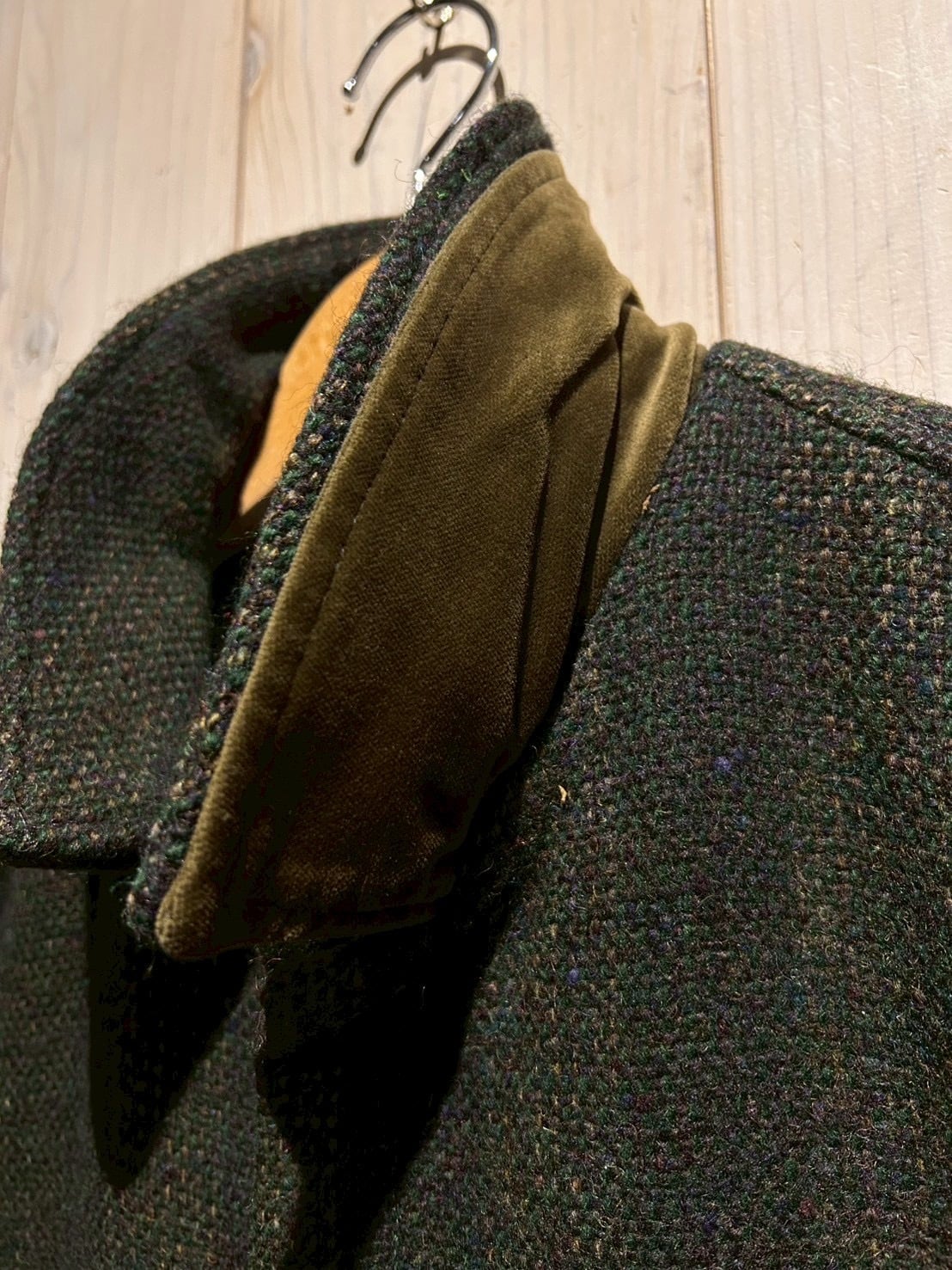 ボディには深みのあるストライプ柄のツイードウールを採用し、袖には上品な光沢を放つオリーブカラーのベロアを切り替えた1着。異素材による立体感とトーンの奥行きが、イタリアンブランドならではの色気を漂わせています。