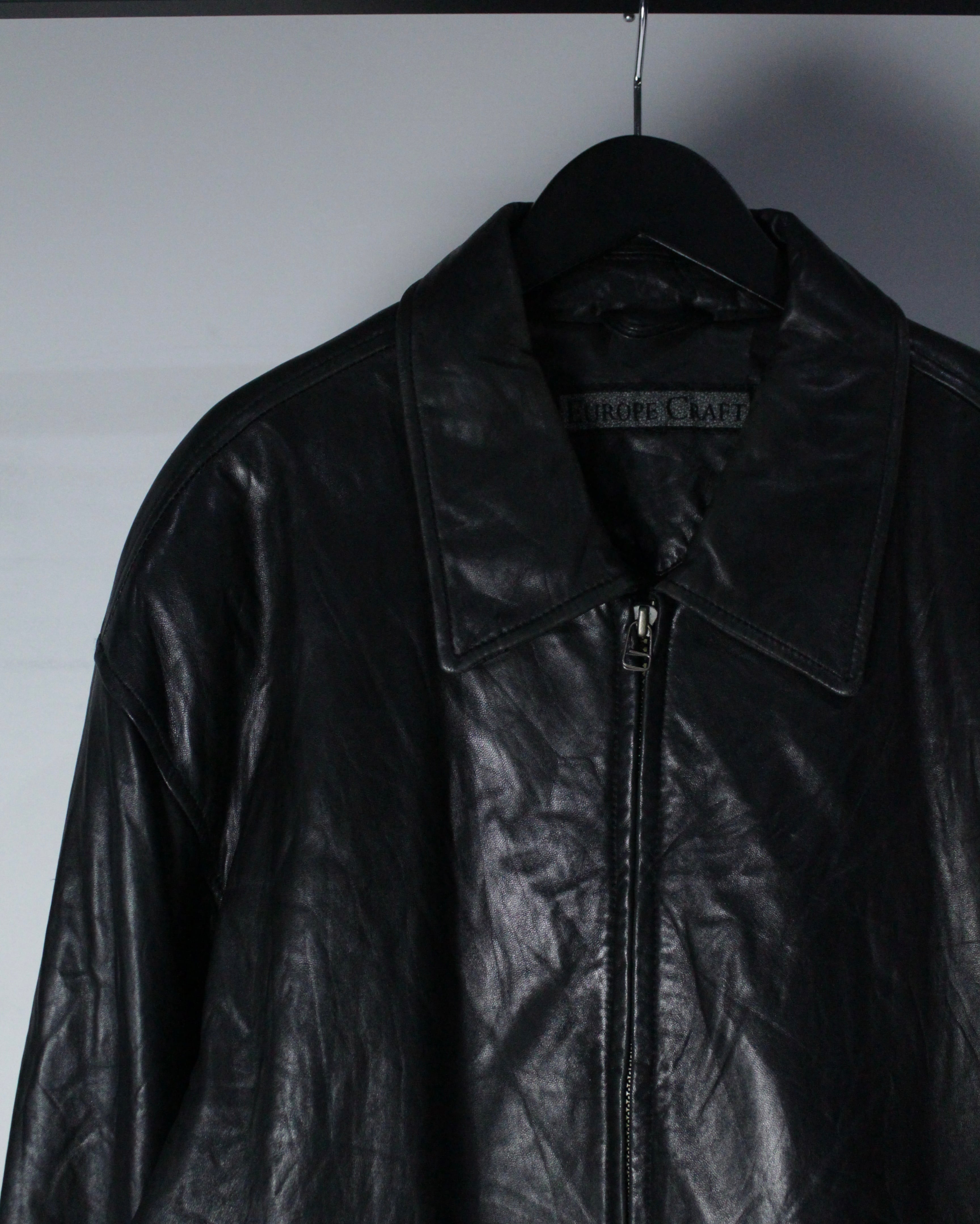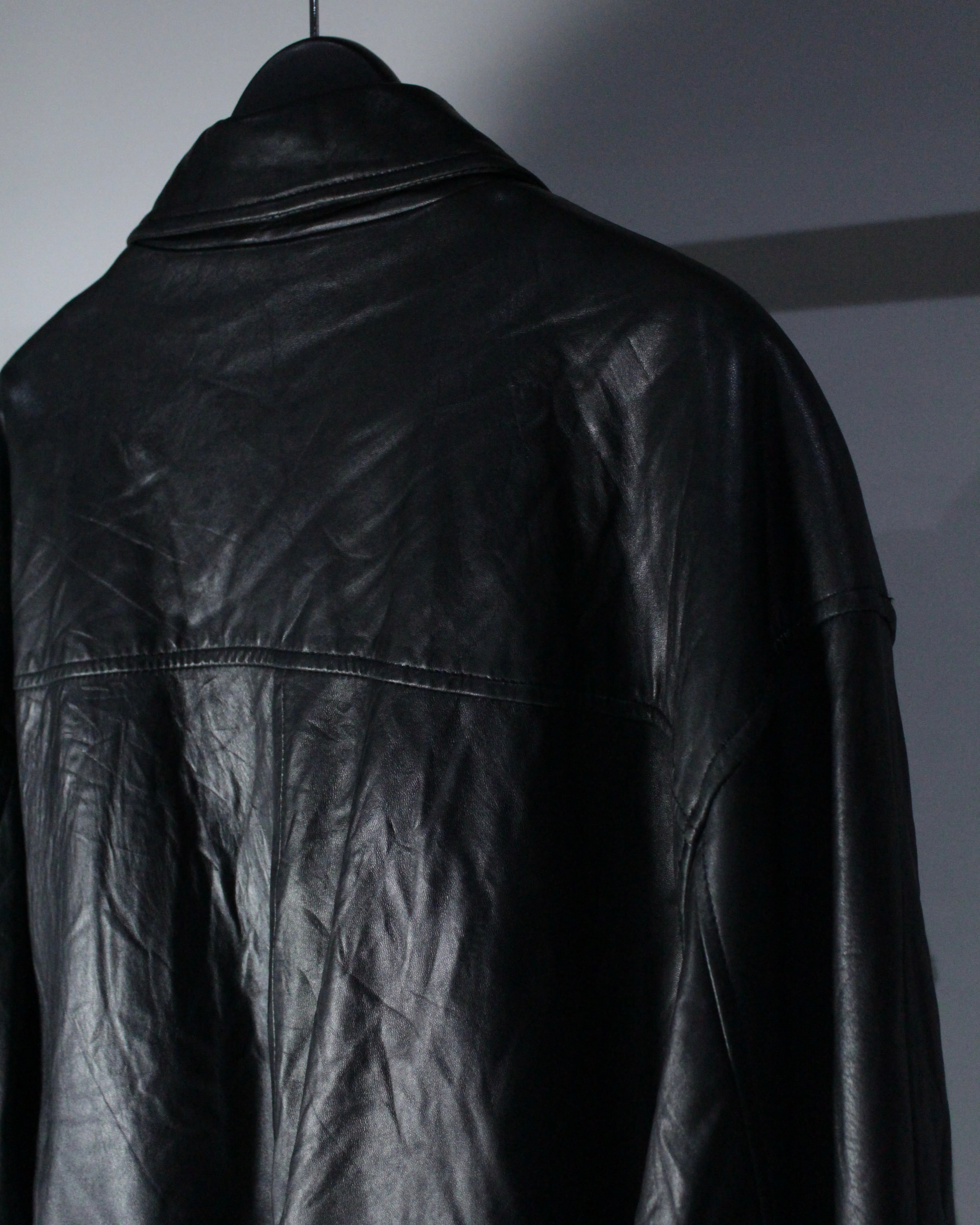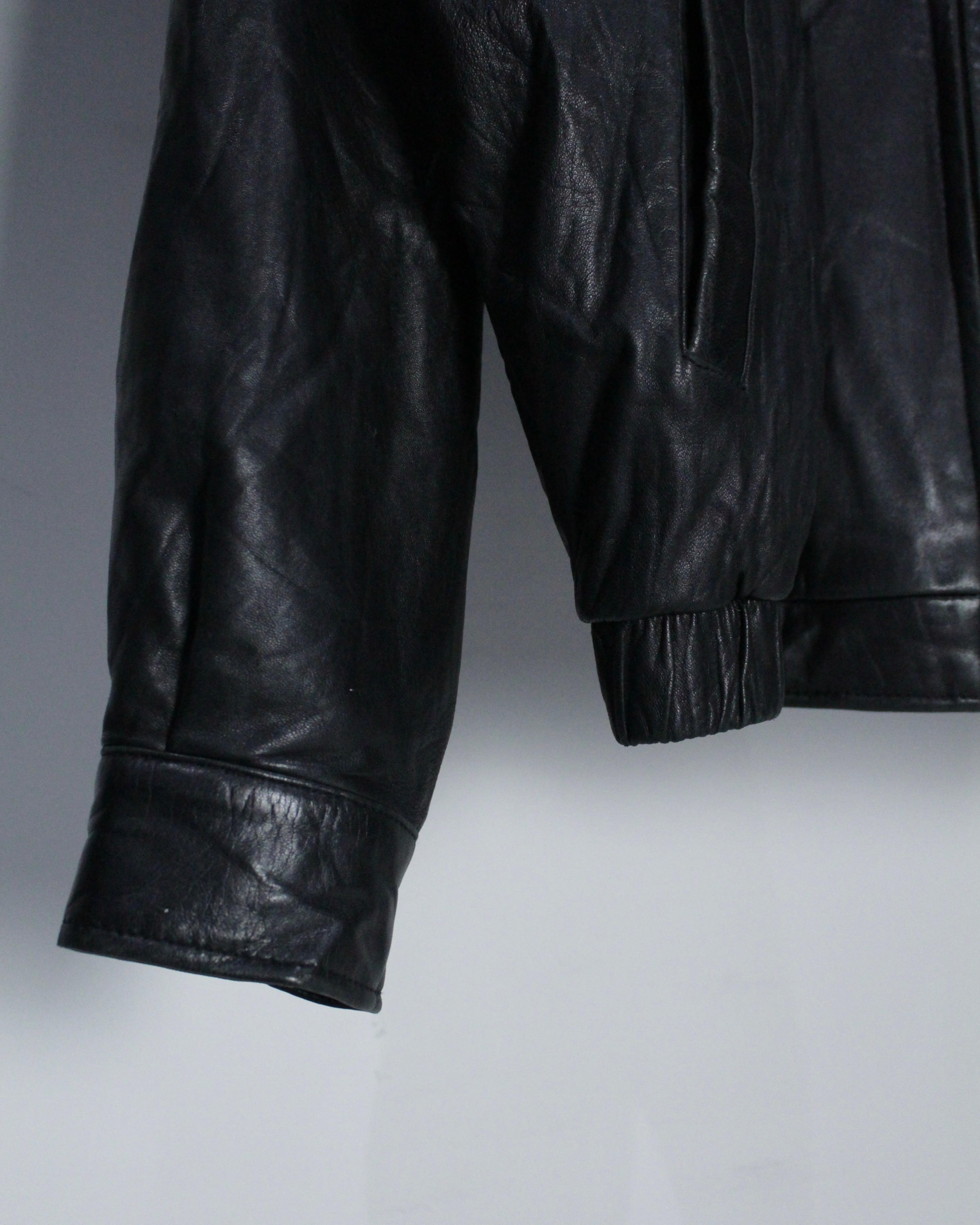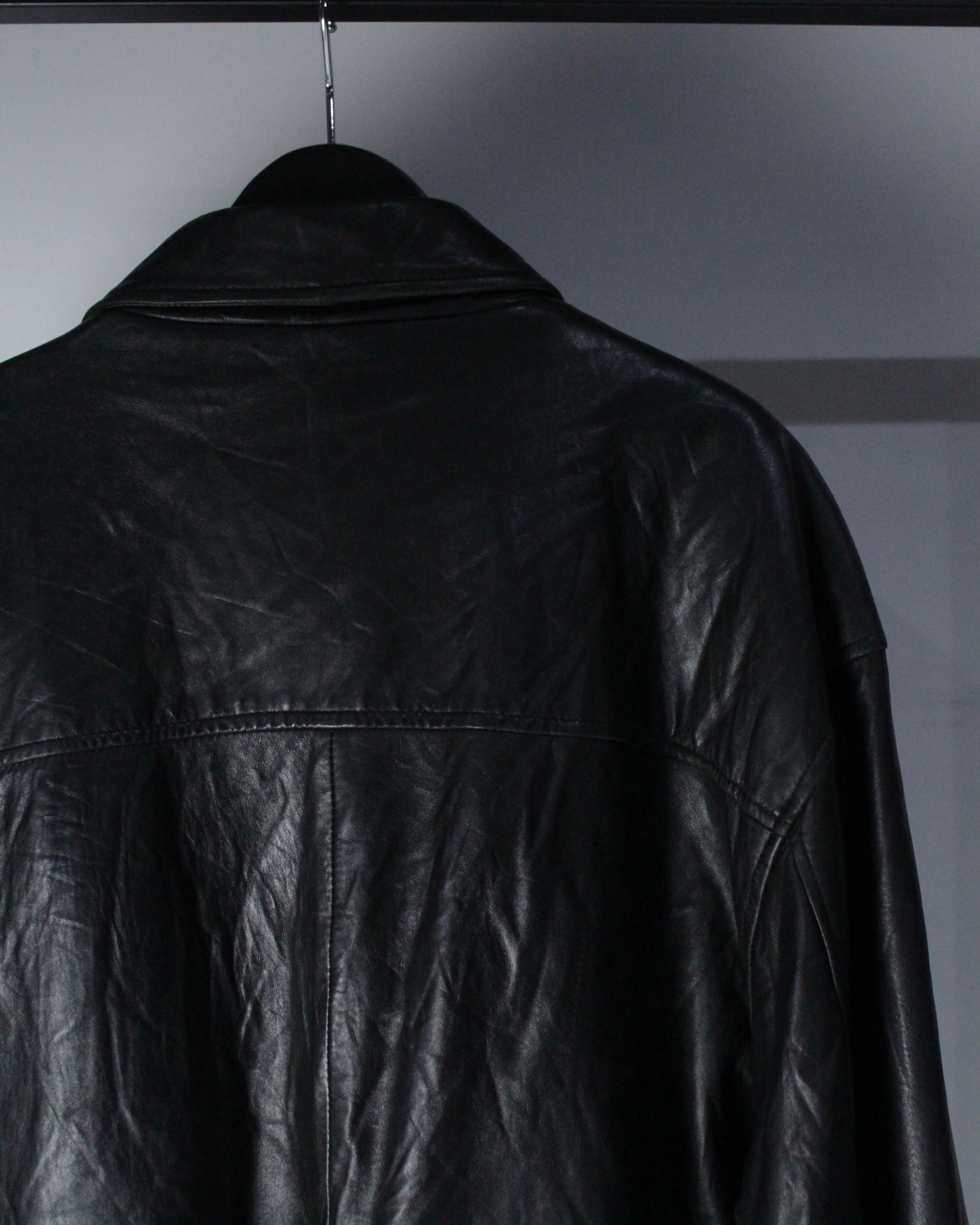 ボディ全体には柔らかなリアルレザーを採用し、自然なシボ感と鈍い光沢がヴィンテージならではの風格を放ちます。広めに取られた襟とジップアップ仕様が特徴で、ミニマルながらも確かな存在感を持つ1着。