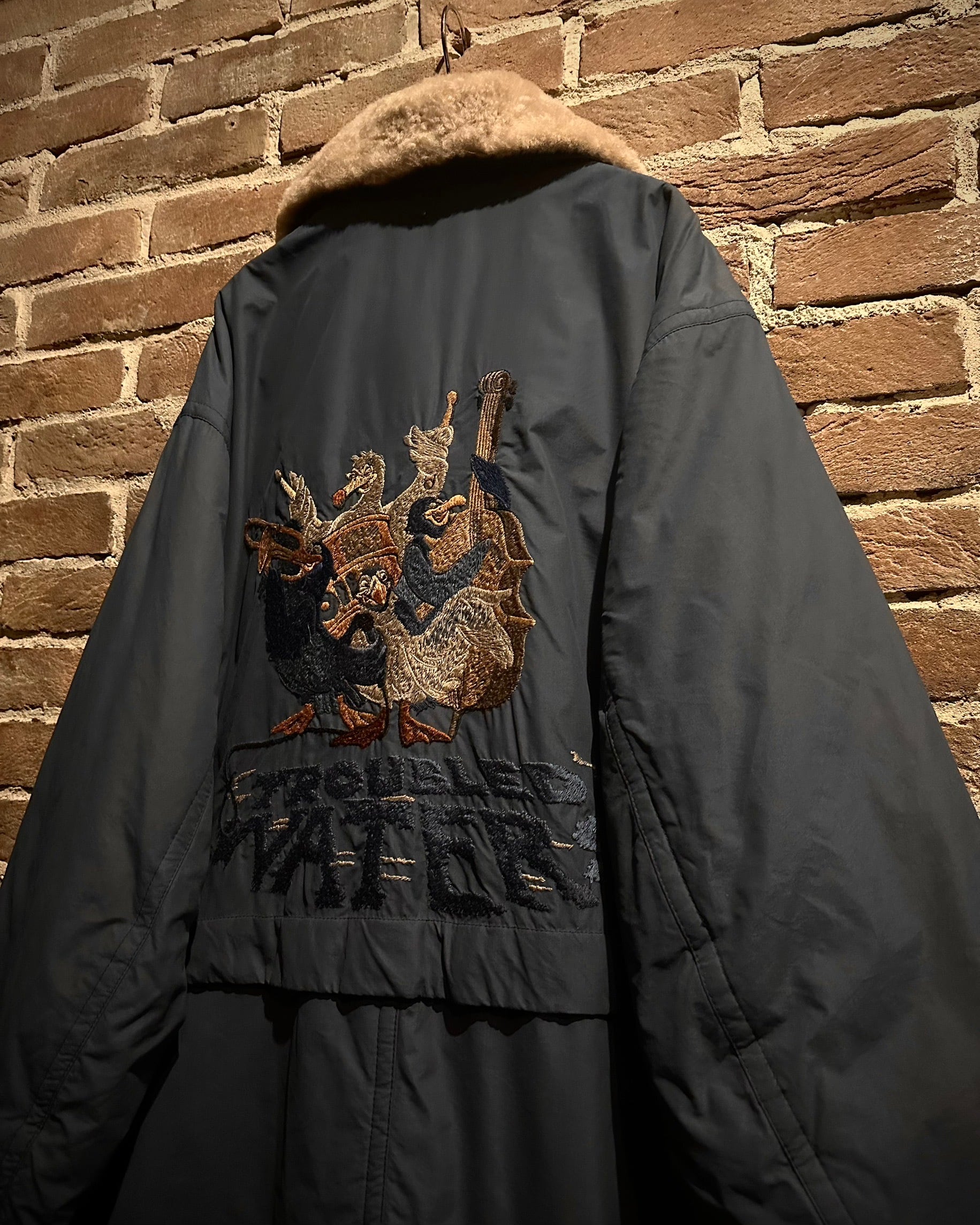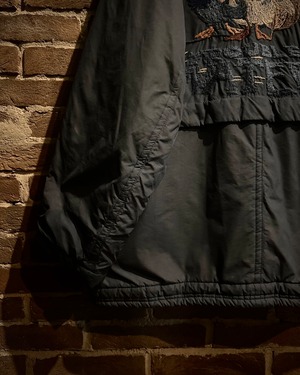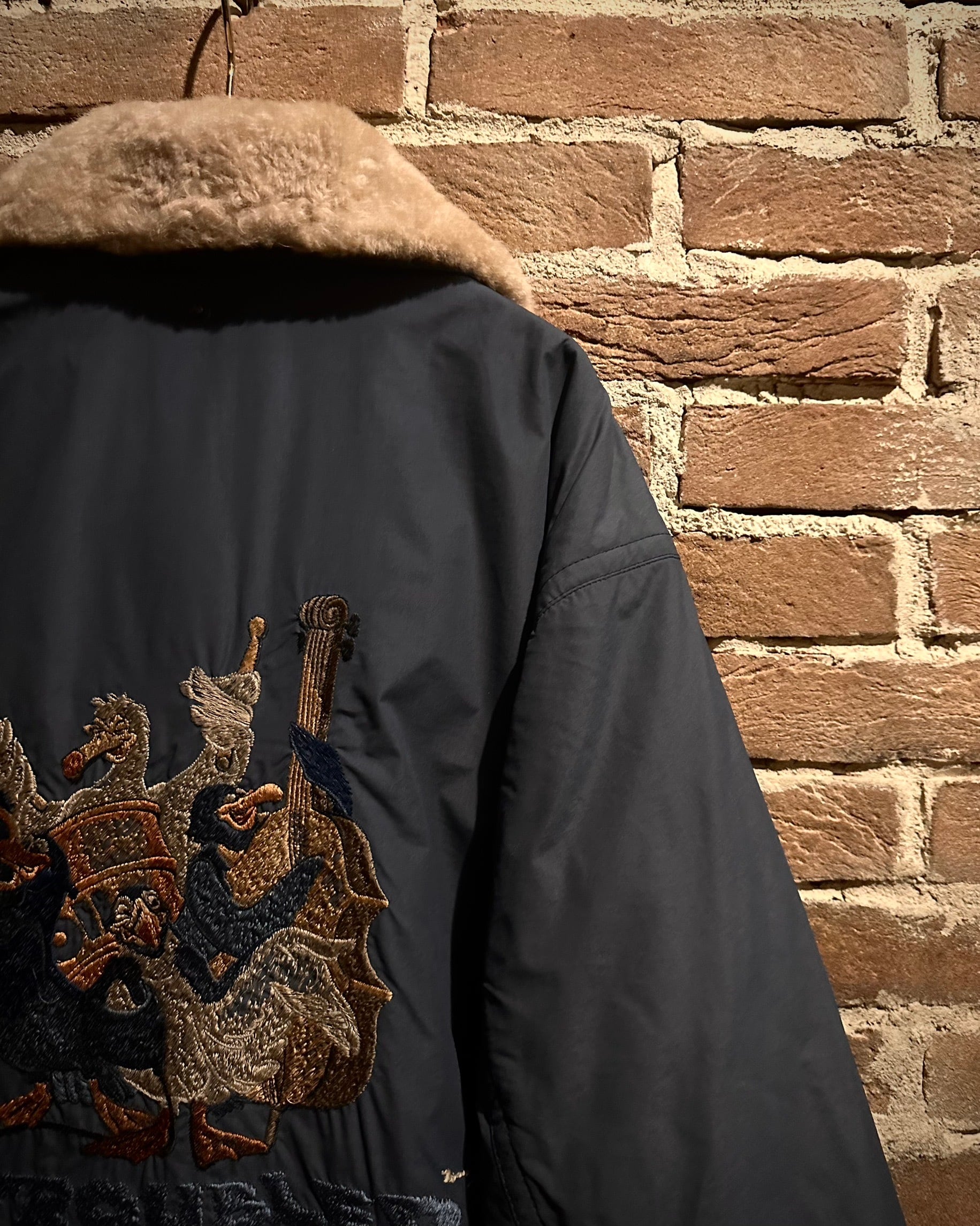 アイスグレーのボディに、背面に鳥のジャズバンドをモチーフにした刺繍を刻んだ、ミリタリーモチーフのジャケット。