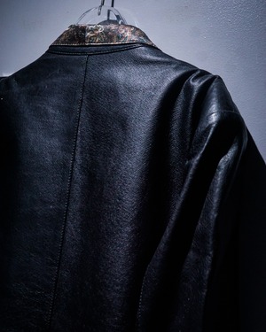 襟元やポケット口に施されたペイズリーの切り替えが絶妙なアクセントとなり、無骨なレザーに華やかさと色気を添えています。