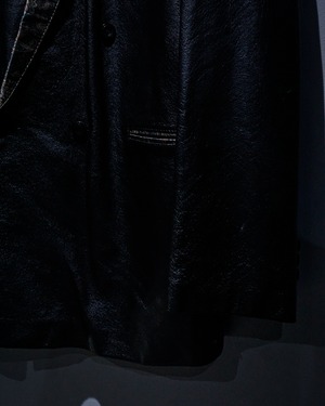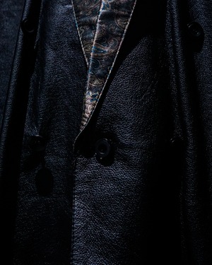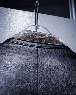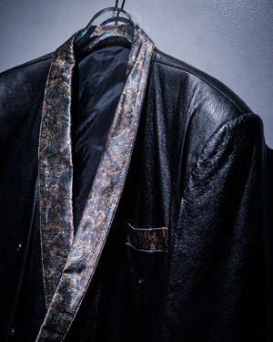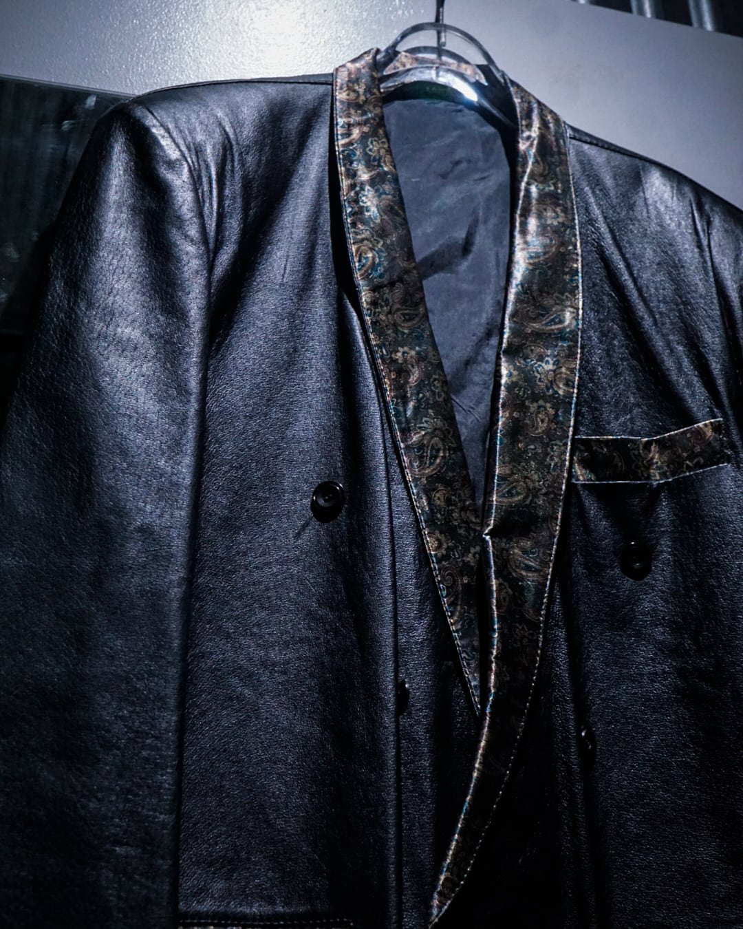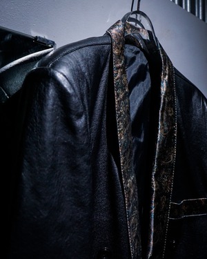 滑らかな艶を放つブラックレザーに、光沢感のあるペイズリーサテンのショールカラーをあしらった、ラグ感満載なテーラードジャケット。